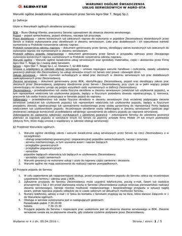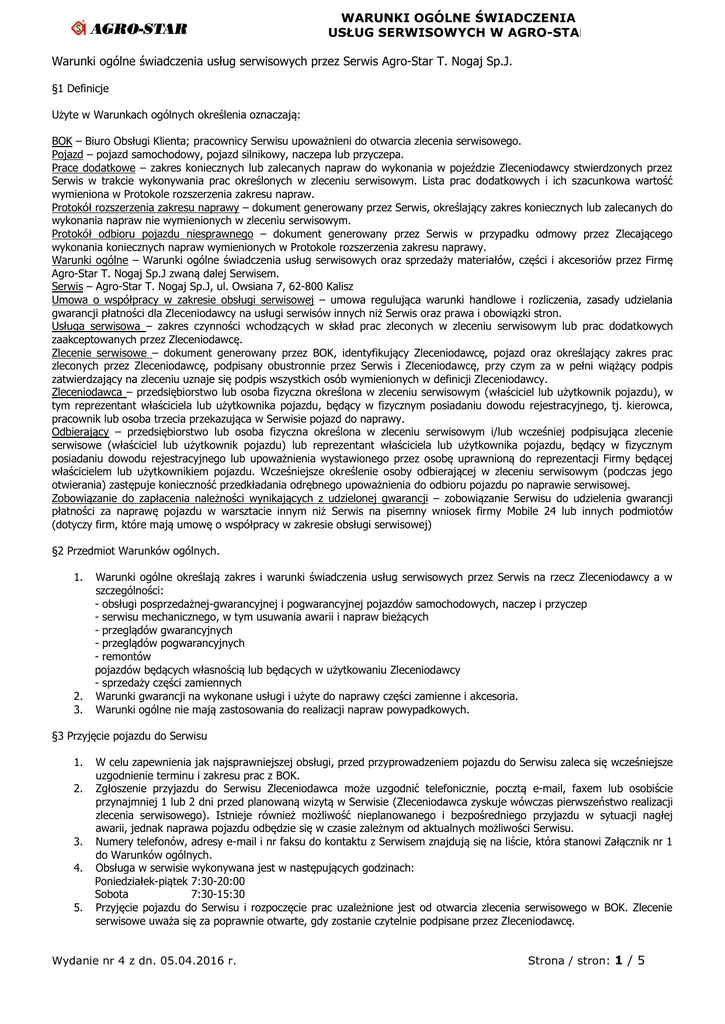 WARUNKI OGÓLNE ŚWIADCZENIA USŁUG SERWISOWYCH W AGRO-STAR Warunki ogólne świadczenia usług serwisowych przez Serwis Agro-Star T. Nogaj Sp.J. §1 Definicje Użyte w Warunkach ogólnych określenia oznaczają: BOK – Biuro Obsługi Klienta; pracownicy Serwisu upoważnieni do otwarcia zlecenia serwisowego. Pojazd – pojazd samochodowy, pojazd silnikowy, naczepa lub przyczepa. Prace dodatkowe – zakres koniecznych lub zalecanych napraw do wykonania w pojeździe Zleceniodawcy stwierdzonych przez Serwis w trakcie wykonywania prac określonych w zleceniu serwisowym. Lista prac dodatkowych i ich szacunkowa wartość wymieniona w Protokole rozszerzenia zakresu napraw. Protokół rozszerzenia zakresu naprawy – dokument generowany przez Serwis, określający zakres koniecznych lub zalecanych do wykonania napraw nie wymienionych w zleceniu serwisowym. Protokół odbioru pojazdu niesprawnego – dokument generowany przez Serwis w przypadku odmowy przez Zlecającego wykonania koniecznych napraw wymienionych w Protokole rozszerzenia zakresu naprawy. Warunki ogólne – Warunki ogólne świadczenia usług serwisowych oraz sprzedaży materiałów, części i akcesoriów przez Firmę Agro-Star T. Nogaj Sp.J zwaną dalej Serwisem. Serwis – Agro-Star T. Nogaj Sp.J, ul. Owsiana 7, 62-800 Kalisz Umowa o współpracy w zakresie obsługi serwisowej – umowa regulująca warunki handlowe i rozliczenia, zasady udzielania gwarancji płatności dla Zleceniodawcy na usługi serwisów innych niż Serwis oraz prawa i obowiązki stron. Usługa serwisowa – zakres czynności wchodzących w skład prac zleconych w zleceniu serwisowym lub prac dodatkowych zaakceptowanych przez Zleceniodawcę. Zlecenie serwisowe – dokument generowany przez BOK, identyfikujący Zleceniodawcę, pojazd oraz określający zakres prac zleconych przez Zleceniodawcę, podpisany obustronnie przez Serwis i Zleceniodawcę, przy czym za w pełni wiążący podpis zatwierdzający na zleceniu uznaje się podpis wszystkich osób wymienionych w definicji Zleceniodawcy. Zleceniodawca – przedsiębiorstwo lub osoba fizyczna określona w zleceniu serwisowym (właściciel lub użytkownik pojazdu), w tym reprezentant właściciela lub użytkownika pojazdu, będący w fizycznym posiadaniu dowodu rejestracyjnego, tj. kierowca, pracownik lub osoba trzecia przekazująca w Serwisie pojazd do naprawy. Odbierający – przedsiębiorstwo lub osoba fizyczna określona w zleceniu serwisowym i/lub wcześniej podpisująca zlecenie serwisowe (właściciel lub użytkownik pojazdu) lub reprezentant właściciela lub użytkownika pojazdu, będący w fizycznym posiadaniu dowodu rejestracyjnego lub upoważnienia wystawionego przez osobę uprawnioną do reprezentacji Firmy będącej właścicielem lub użytkownikiem pojazdu. Wcześniejsze określenie osoby odbierającej w zleceniu serwisowym (podczas jego otwierania) zastępuje konieczność przedkładania odrębnego upoważnienia do odbioru pojazdu po naprawie serwisowej. Zobowiązanie do zapłacenia należności wynikających z udzielonej gwarancji – zobowiązanie Serwisu do udzielenia gwarancji płatności za naprawę pojazdu w warsztacie innym niż Serwis na pisemny wniosek firmy Mobile 24 lub innych podmiotów (dotyczy firm, które mają umowę o współpracy w zakresie obsługi serwisowej) §2 Przedmiot Warunków ogólnych. 1. 2. 3. Warunki ogólne określają zakres i warunki świadczenia usług serwisowych przez Serwis na rzecz Zleceniodawcy a w szczególności: - obsługi posprzedażnej-gwarancyjnej i pogwarancyjnej pojazdów samochodowych, naczep i przyczep - serwisu mechanicznego, w tym usuwania awarii i napraw bieżących - przeglądów gwarancyjnych - przeglądów pogwarancyjnych - remontów pojazdów będących własnością lub będących w użytkowaniu Zleceniodawcy - sprzedaży części zamiennych Warunki gwarancji na wykonane usługi i użyte do naprawy części zamienne i akcesoria. Warunki ogólne nie mają zastosowania do realizacji napraw powypadkowych. §3 Przyjęcie pojazdu do Serwisu 1. 2. 3. 4. 5. W celu zapewnienia jak najsprawniejszej obsługi, przed przyprowadzeniem pojazdu do Serwisu zaleca się wcześniejsze uzgodnienie terminu i zakresu prac z BOK. Zgłoszenie przyjazdu do Serwisu Zleceniodawca może uzgodnić telefonicznie, pocztą e-mail, faxem lub osobiście przynajmniej 1 lub 2 dni przed planowaną wizytą w Serwisie (Zleceniodawca zyskuje wówczas pierwszeństwo realizacji zlecenia serwisowego). Istnieje również możliwość nieplanowanego i bezpośredniego przyjazdu w sytuacji nagłej awarii, jednak naprawa pojazdu odbędzie się w czasie zależnym od aktualnych możliwości Serwisu. Numery telefonów, adresy e-mail i nr faksu do kontaktu z Serwisem znajdują się na liście, która stanowi Załącznik nr 1 do Warunków ogólnych. Obsługa w serwisie wykonywana jest w następujących godzinach: Poniedziałek-piątek 7:30-20:00 Sobota 7:30-15:30 Przyjęcie pojazdu do Serwisu i rozpoczęcie prac uzależnione jest od otwarcia zlecenia serwisowego w BOK. Zlecenie serwisowe uważa się za poprawnie otwarte, gdy zostanie czytelnie podpisane przez Zleceniodawcę. Wydanie nr 4 z dn. 05.04.2016 r. Strona / stron: 1 / 5 WARUNKI OGÓLNE ŚWIADCZENIA USŁUG SERWISOWYCH W AGRO-STAR 6. 7. 8. 9. 10. 11. (a) (b) (c) (d) 12. 13. 14. 15. 16. 17. 18. Zlecenie serwisowe podpisane przez pracownika Zleceniodawcy, kierowcę Zleceniodawcy lub osobę trzecią, która przyprowadziła pojazd do Serwisu lub odbiera pojazd z Serwisu i była w posiadaniu dowodu rejestracyjnego tego pojazdu lub upoważnienia, uważa się za podpisane przez Zleceniodawcę / Odbiorcę. Jeżeli w trakcie wykonywania prac zleconych Serwis zdiagnozuje konieczność wykonania prac dodatkowych, to zakres tych prac i ich szacunkowy koszt zostanie przedstawiony Zleceniodawcy pisemnie w „Protokole rozszerzenia zakresu naprawy”, zaś w przypadku braku takiej możliwości Zleceniodawca zostanie poinformowany telefonicznie. Wy