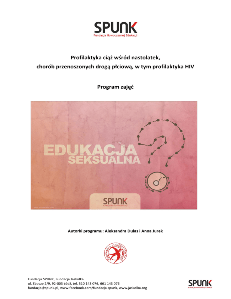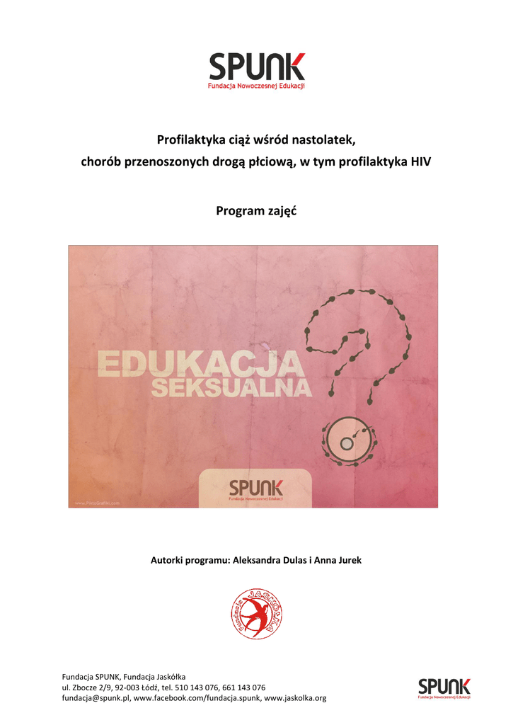 Profilaktyka ciąż wśród nastolatek, chorób przenoszonych drogą płciową, w tym profilaktyka HIV Program zajęć Autorki programu: Aleksandra Dulas i Anna Jurek Fundacja SPUNK, Fundacja Jaskółka ul. Zbocze 2/9, 92-003 Łódź, tel. 510 143 076, 661 143 076 [email protected], www.facebook.com/fundacja.spunk, www.jaskolka.org Wstęp Autorki programu od 2004 roku prowadzą Fundację Jaskółka, a od 2012 roku Fundację SPUNK, która zajmuje się wspieraniem edukacyjnym dzieci i młodzieży. W tym czasie stworzyłyśmy i zrealizowałyśmy szereg programów zachęcających do aktywności obywatelskiej, odpowiedzialności za siebie i innych, samorozwoju. Wszystkie nasze działania zmierzają do nauczenia młodych ludzi krytycznego, samodzielnego myślenia, uwrażliwienia na manipulację, zachęcenia do podejmowania niezależnych, mądrych decyzji. Uczymy słuchania różnych stron w dyskusji, brania pod uwagę różnych światopoglądów i różnego sposobu widzenia tych samych tematów, a następnie syntetyzowania informacji i wyciągania wniosków. Pokazujemy różnorodność, wielość, wieloaspektowość. Zachęcamy do tolerancji i niezależności myślenia. Słuchamy młodych ludzi i rozmawiamy z nimi, ponieważ interesują nas ich opinie i poglądy. W wyniku wszystkich tych działań i dziesiątek dyskusji z młodzieżą, w 2009 roku rozpoczęłyśmy pracę nad programem Edukacji Seksualnej dla młodzieży gimnazjalnej i licealnej. Dostałyśmy bowiem informację, że to, o czym młodzi ludzie najbardziej chcą mówić jest dojrzewanie i życie seksualne człowieka. Jest to temat, o którym trudno rozmawiać zarówno z rodzicami (choćby relacja z nimi była najlepsza) jak i nauczycielami (obawa przed oceną). Stworzyłyśmy program i zapytałyśmy młodzież co o nim myślą, jak go zmienić, ukierunkować, zmodyfikować aby spełniał ich oczekiwania. Zrobiłyśmy coś, czego praktycznie nie robi się w polskiej szkole, zapytałyśmy bezpośrednich odbiorców, osoby najważniejsze i najbardziej zainteresowane jakością tworzonego dla nich programu, jaki on ma być. Jakimi metodami należy pracować żeby były one dla uczniów najbardziej zrozumiałe, najciekawsze, wyzwalające najwięcej refleksji. Wspólnie z młodzieżą stworzyliśmy program Edukacji Seksualnej, który podejmuje wszystkie najważniejsze, najbardziej interesujące kwestie. I co najistotniejsze, wszystkie podejmowane tematy są zaproponowane przez młodych ludzi, a forma ich realizacji jest z nimi skonsultowana (po każdych przeprowadzonych zajęciach młodzież brała udział w panelu dyskusyjnym oraz wypełniała ankietę oceniającą poszczególne moduły zajęć). Program przez rok był modyfikowany i dostosowywany do potrzeb odbiorców. To, co oddajemy jako ostateczną jego wersję, cały czas jest jeszcze zmieniane i modyfikowane, bo świat się zmienia, pojawiają się nowe tematy i problemy, a uważamy, że to co najważniejsze w pracy z młodzieżą to aktualność i prawdziwość przekazywanych treści. Dlatego nie nazywamy naszego programu „Wychowaniem do życia w rodzinie”. Jest to Edukacja Seksualna, bo o seksualności właśnie uczymy. Seksualności rozumianej szeroko. Mówimy o aspektach biologicznych, psychologicznych, społecznych i prawnych tej dziedziny ludzkiego życia. Działając pod nową nazwą SPUNK Fundacja Nowoczesnej Edukacji będziemy realizować działania skoncentrowane na: upowszechnianiu nowoczesnych metod edukacyjnych, kształtowanie refleksyjnego, niezależnego myślenia i odpowiedzialnych postaw, propagowaniu wiedzy niezależnej światopoglądowo oraz kształtowanie postaw tolerancji i równości. Program Edukacji Seksualnej idealnie wpisuje się w te działania i wartości, jakie za nimi stoją. Fundacja SPUNK, Fundacja Jaskółka ul. Zbocze 2/9, 92-003 Łódź, tel. 510 143 076, 661 143 076 [email protected], www.facebook.com/fundacja.spunk, www.jaskolka.org Zasady prowadzenia warsztatów Zajęcia prowadzone są metodą warsztatową. Poprzez zadania i ćwiczenia weryfikujemy wiedzę uczestników i pobudzamy do refleksji nad omawianymi tematami. Podczas zajęć wykorzystywane są bogate materiały edukacyjne i poglądowe. Warsztaty realizowane są w cyklu 10 godzinnych spotkań. Fundacja korzysta ze wsparcia merytorycznego ginekologów, psychologów młodzieżowych oraz pedagogów pracujących z młodzieżą licealna i gimnazjalną. Prowadzący warsztaty mają wieloletnie doświadczenie w pracy z młodzieżą i są przeszkoleni przez Grupę Edukatorów Seksualnych „Ponton” z Warszawy. Spis zagadnień Na początek – kilka słów o dojrzewaniu. Czym jest dojrzewanie i jakie są jego fazy? Jak dojrzewają dziewczyny? Jak dojrzewają chłopcy? Budowa narządów płciowych kobiecych i męskich. Dojrzewanie płciowe a dojrzewanie psychiczne i emocjonalne. Ćwiczenia językowe. Zajęcia mają za zadanie pobudzić do refleksji nad rolą języka w myśleniu i mówieniu o emocjach, uczuciach i seksie. Jak stworzyć dobry związek? Uczestnicy zastanowią się: jakie cechy powinien mieć partner/ka, co to znaczy dobry związek, i kiedy wiedzą, że są już gotowi na „pierwszy raz”. Spróbują także odpowiedzieć na pytanie, jak nie dać się zmanipulować np. przez środowisko rówieśnicze w podejmowaniu decyzji o rozpoczęciu współżycia. Podjęty zostanie także temat odpowiedzialności w podejmowaniu decyzji i dokonywaniu wyborów. O emocjach i uczuciach. W kontekście wchodzenia w związek i intymne relacje z drugą osobą, uczestnicy zajęć odniosą się do takich pojęć jak: miłość, przyjaźń, zaufanie, lojalność, troska o siebie i drugą osobę, odpowiedzialność, ciekawość, pożądanie, pragnienia, rozczarowania, oczekiwania, zabawa. Spróbują odpowiedzieć na pytania: Czym różni się zafascynowanie drugą osobą od zakochania i miłości, a także, czym jest miłość. O antykoncepcji. Omówione zostaną następujące tematy: co to jest antyk