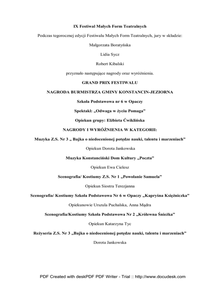 IX Festiwal Małych Form Teatralnych Podczas tegorocznej edycji Festiwalu Małych Form Teatralnych, jury w składzie: Małgorzata Boratyńska Lidia Sycz Robert Kibalski przyznało następujące nagrody oraz wyróżnienia. GRAND PRIX FESTIWALU NAGRODA BURMISTRZA GMINY KONSTANCIN-JEZIORNA Szkoła Podstawowa nr 6 w Opaczy Spektakl: „Odwaga w życiu Pomaga” Opiekun grupy: Elżbieta Ćwiklińska NAGRODY I WYRÓŻNIENIA W KATEGORII: Muzyka Z.S. Nr 3 „ Bajka o niedocenionej potędze nauki, talentu i marzeniach” Opiekun Dorota Jankowska Muzyka Konstanciński Dom Kultury „Poczta” Opiekun Ewa Cielesz Scenografia/ Kostiumy Z.S. Nr 1 „Powołanie Samuela” Opiekun Siostra Terezjanna Scenografia/ Kostiumy Szkoła Podstawowa Nr 6 w Opaczy „Kapryśna Księżniczka” Opiekunowie Urszula Puchalska, Anna Mądra Scenografia/Kostiumy Szkoła Podstawowa Nr 2 „Królewna Śnieżka” Opiekun Katarzyna Tyc Reżyseria Z.S. Nr 3 „Bajka o niedocenionej potędze nauki, talentu i marzeniach” Dorota Jankowska PDF Created with deskPDF PDF Writer - Trial :: http://www.docudesk.com Reżyseria Konstanciński Dom Kultury „Ja zwariuję” Opiekun Ewa Cielesz Grupowa kreacja aktorska Z.S. Nr 4 w Słomczynie „Mały Książę” Opiekunowie Małgorzata Gozdołek, Adrianna Mańkowska-Rzezak Grupowa kreacja aktorska Z.S. Nr 1 „Powołanie Samuela” Opiekun Siostra Terezjanna Grupowa kreacja aktorska Konstanciński Dom Kultury „Poczta”, Opiekun Ewa Cielesz NAGRODY INDYWIDUALNE ZA KREACJĘ AKTORSKĄ: Hubert Janczak spektakl pt.„Ja zwariuję” Joanna Szczepanik spektakl pt. „ Ja zwariuję” Zuzanna Roguska spektakl pt. „Pani do kąta” Aleksandra Lipka spektakl pt. „Dentystyczna przygoda pewnej Baby Jagi” Zuzanna Słaby spektakl pt. „Odwaga w życiu pomaga” Anna Wietrzyk spektakl pt. „Odwaga w życiu pomaga” Milena Burdalska spektakl pt. „Bajka o niedocenionej potędze…” Wiktoria Syskowska spektakl pt. „Bajka o niedocenionej potędze..” Kacper Pudło spektakl pt. Bajka o niedocenionej potędze…” PDF Created with deskPDF PDF Writer - Trial :: http://www.docudesk.com