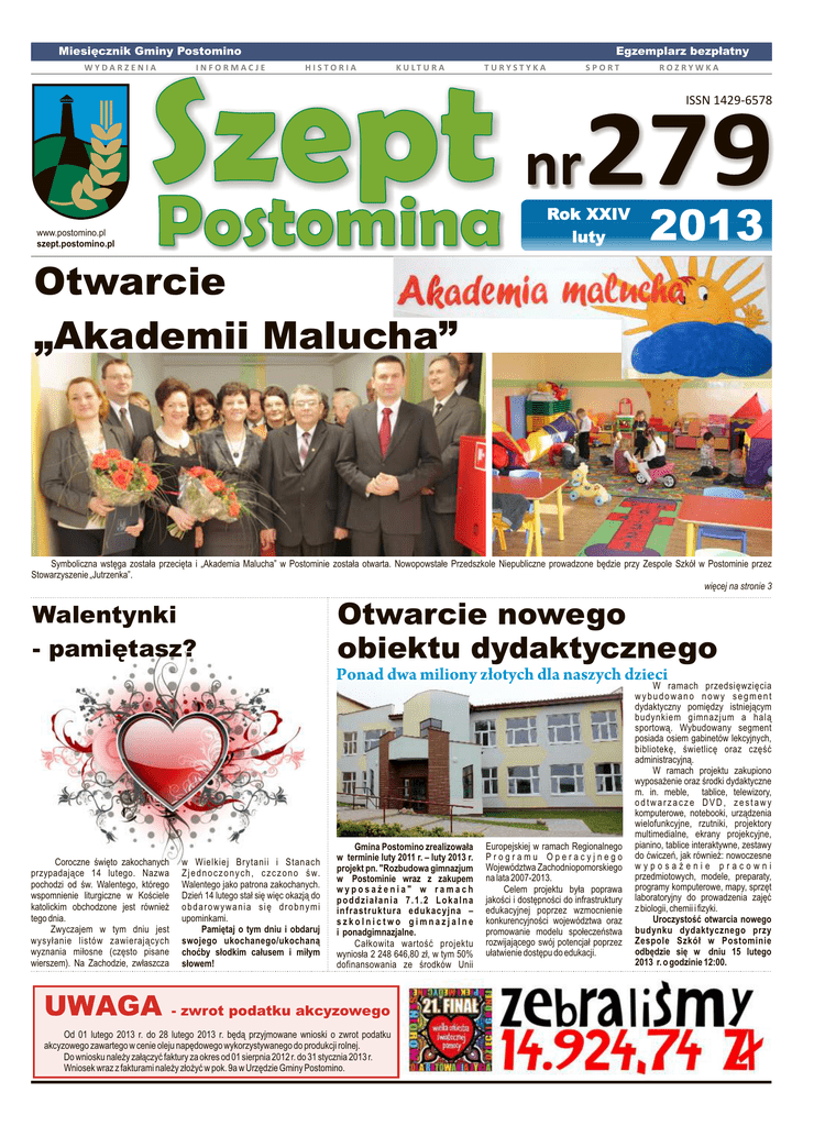 Szept nr 279 Postomina Egzemplarz bezpłatny Miesięcznik Gminy Postomino WYDARZENIA INFORMACJE HISTORIA K U LT U R A TURYSTYKA SPORT ROZRYWKA ISSN 1429-6578 www.postomino.pl szept.postomino.pl Rok XXIV luty 2013 Otwarcie „Akademii Malucha” Symboliczna wstęga została przecięta i „Akademia Malucha” w Postominie została otwarta. Nowopowstałe Przedszkole Niepubliczne prowadzone będzie przy Zespole Szkół w Postominie przez Stowarzyszenie „Jutrzenka”. więcej na stronie 3 Walentynki - pamiętasz? Otwarcie nowego obiektu dydaktycznego Ponad dwa miliony złotych dla naszych dzieci Coroczne święto zakochanych przypadające 14 lutego. Nazwa pochodzi od św. Walentego, którego wspomnienie liturgiczne w Kościele katolickim obchodzone jest również tego dnia. Zwyczajem w tym dniu jest wysyłanie listów zawierających wyznania miłosne (często pisane wierszem). Na Zachodzie, zwłaszcza UWAGA w Wielkiej Brytanii i Stanach Z j e d n o c z o n y c h , c z c z o n o ś w. Walentego jako patrona zakochanych. Dzień 14 lutego stał się więc okazją do obdarowywania się drobnymi upominkami. Pamiętaj o tym dniu i obdaruj swojego ukochanego/ukochaną choćby słodkim całusem i miłym słowem! Gmina Postomino zrealizowała w terminie luty 2011 r. – luty 2013 r. projekt pn. "Rozbudowa gimnazjum w Postominie wraz z zakupem wyposażenia" w ramach poddziałania 7.1.2 Lokalna infrastruktura edukacyjna – szkolnictwo gimnazjalne i ponadgimnazjalne. Całkowita wartość projektu wyniosła 2 248 646,80 zł, w tym 50% dofinansowania ze środków Unii - zwrot podatku akcyzowego Od 01 lutego 2013 r. do 28 lutego 2013 r. będą przyjmowane wnioski o zwrot podatku akcyzowego zawartego w cenie oleju napędowego wykorzystywanego do produkcji rolnej. Do wniosku należy załączyć faktury za okres od 01 sierpnia 2012 r. do 31 stycznia 2013 r. Wniosek wraz z fakturami należy złożyć w pok. 9a w Urzędzie Gminy Postomino. Europejskiej w ramach Regionalnego Programu Operacyjnego Województwa Zachodniopomorskiego na lata 2007-2013. Celem projektu była poprawa jakości i dostępności do infrastruktury edukacyjnej poprzez wzmocnienie konkurencyjności województwa oraz promowanie modelu społeczeństwa rozwijającego swój potencjał poprzez ułatwienie dostępu do edukacji. W ramach przedsięwzięcia wybudowano nowy segment dydaktyczny pomiędzy istniejącym budynkiem gimnazjum a halą sportową. Wybudowany segment posiada osiem gabinetów lekcyjnych, bibliotekę, świetlicę oraz część administracyjną. W ramach projektu zakupiono wyposażenie oraz środki dydaktyczne m. in. meble, tablice, telewizory, odtwarzacze DVD, zestawy komputerowe, notebooki, urządzenia wielofunkcyjne, rzutniki, projektory multimedialne, ekrany projekcyjne, pianino, tablice interaktywne, zestawy do ćwiczeń, jak również: nowoczesne wyposażenie pracowni przedmiotowych, modele, preparaty, programy komputerowe, mapy, sprzęt laboratoryjny do prowadzenia zajęć z biologii, chemii i fizyki. Uroczystość otwarcia nowego budynku dydaktycznego przy Zespole Szkół w Postominie odbędzie się w dniu 15 lutego 2013 r. o godzinie 12:00. 2 luty 2013 Postomino Miesięcznik Gminy Postomino XXVIII sesja VI kadencji Rady Gminy Postomino Co uradza gminna władza 24 stycznia 2013 r. w sali konferencyjnej Urzędu Gminy Postomino odbyła się XXVIII sesja VI kadencji Rady Gminy Postomino. Podczas sesji radni: 1) zapoznali się z informacją Wójta z realizacji uchwał za okres od 30 października do 21 grudnia 2012 roku; 2) w y s ł u c h a l i s p r a w o z d a n i a z realizacji planu pracy Rady Gminy Postomino za 2012 rok; 3) w y s ł u c h a l i s p r a w o z d a n i a z realizacji planu pracy komisji rewizyjnej Rady Gminy Postomino za 2012 rok; 4) w y s ł u c h a l i s p r a w o z d a n i a z realizacji planów pracy za 2012 rok komisji: budżetu i finansów, rozwoju gospodarczego i rolnictwa, społeczno – oświatowej oraz podjęli następujące uchwały: >> w sprawie uchwalenia regulaminu utrzymania czystości i porządku na terenie gminy, >> w sprawie wyrażenia zgody na nabycie przez Gminę Postomino udziału w Miejskim Przedsiębiorstwie Gospodarki Komunalnej i Mieszkaniowej spółce z ograniczoną odpowiedzialnością w Sławnie – wyrażono zgodę na nabycie jednego udziału, >> w sprawie powierzenia Spółce pod firmą: Miejskie Przedsiębiorstwo Gospodarki Komunalnej i Mieszkaniowej spółka z ograniczoną odpowiedzialnością w Sławnie zadania własnego Gminy w zakresie gospodarowania odpadami komunalnymi oraz wyrażenia zgody na zawarcie przez Azbest - informacja I n f o r m u j e m y, ż e G m i n a Postomino w 2013 roku zamierza wystąpić do Wojewódzkiego Funduszu Ochrony Środowiska i Gospodarki Wodnej w Szczecinie o udzielenie dotacji na zadania z zakresu usuwania i unieszkodliwiania wyrobów zawierających azbest. finansów publicznych oraz wspólnot mieszkaniowych. O dofinansowanie mogą ubiegać się tylko i wyłącznie osoby, które złożyły „Informacje o wyrobach zawierających azbest i miejscu ich wykorzystania”. Wzór wniosku wraz z niezbędnymi załącznikami dostępny jest na stronie internetowej Gminy Postomino oraz w punkcie obsługi interesanta Urzędu Gminy Postomino. W przypadku uzyskania przez Gminę wsparcia finansowego dofinansowanie obejmować będzie pokrycie w całości kosztów demontażu, transportu i unieszkodliwiania odpadów zawierających azbest powstałych podczas demontażu pokryć gminę umowy wykonawczej niezbędnej dla realizacji projektu pn.: „Usprawnienie systemu § gospodarki odpadami w Powiecie >> w sprawie zmian w budżecie gminy na 2013 rok. Po dokonanych Sławieńskim poprzez rozbudowę zmianach budżet gminy zamknie składowiska odpadów się: po stronie dochodów kwotą w Gwiazdowie” – zadanie 32.068.005,00 zł, po stronie powierzono na 10 lat od dnia wydatków kwotą 31.363.333,00 zł, podpisania umowy, nadwyżką budżetową w kwocie >> zmieniają