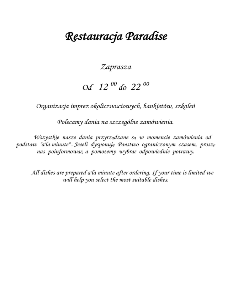 Restauracja Paradise Zaprasza Od 12 00 do 22 00 Organizacja imprez okolicznościowych, bankietów, szkoleń Polecamy dania na szczególne zamówienia. Wszystkie nasze dania przyrządzane są w momencie zamówienia od podstaw "a'la minute" . Jeżeli dysponują Państwo ograniczonym czasem, proszę nas poinformować, a pomożemy wybrać odpowiednie potrawy. All dishes are prepared a'la minute after ordering. If your time is limited we will help you select the most suitable dishes. Szef Kuchni poleca: 1. Polewka staropolska na maślance z jagnięciną 350 g/50 g 12 zł 2. Carpaccio z polędwicy wołowej z tartym oscypkiem i kaparami 100 g 24 zł Aromatyzowany filet z kaczki pieczony na różowo podany z sosem śliwkowym z porto, puree czosnkowym i kapustą modrą 150g/300 g 40 zł 3. Szarlotka na ciepło podana z sosem waniliowym i gałką lodów wiśniowych 150 g 9 zł 4. A może coś na zimno? 1. Tatar po polsku 100g/70g 21 zł 2. Śledzik w sosie tatarskim serwowany ze świeżym pieczywem 100g/70g 9 zł 3. Róża z wędzonego łososia podana z kremowym serkiem na grzance 100 g 14 zł 4. Śledź marynowany w zalewie octowej z cebulą 100g/50g 9 zł Trochę cieplej. Wątróbka drobiowa z kurkami, groszkiem cukrowym i słodkim sosem 150 g 12 zł 2. Plastry oscypka na postumencie z boczku z żurawiną cytrusową 100 g 15 zł 3. Kaszanka z grzanką, cebulką i ogórkiem kiszonym 200 g 10 zł 1. Zupy ~ 300 ml ~ 1. Złocisty rosół z perliczki z makaronem 2. Barszcz czerwony z krokiecikiem 3. Zupa chrzanowa z bekonem 4.Zupa czosnkowa 5.Kołduny staropolskie w barszczu lub rosole 6. Zupa kokosowa z łososiem w otulinie z boczku aromatyzowana limonką 7. Zupa dnia – zapytaj kelnera 7 zł 8 zł 7 zł 7 zł 8 zł 14 zł 6 zł ~ 400 ml ~ 8. Żurek staropolski na borowikach 400 ml/50g 9 zł 9. Kwaśnica na wędzonce z żeberkiem 400 ml/100g 15 zł Dania z jagnięciny i cielęciny. 1.Gulasz jagnięcy z pieczoną papryką i pomidorami podany na placku ziemniaczanym 300g/150 g 2. Jagnięcina duszona w sosie słodko-kwaśnym podana z kus kusem 300 g 3. Krucha i delikatna cielęcina w sosie koperkowym z dodatkiem chrzanu 140 g 4. Swojski gulasz cielęcy ze śmietaną, kopytkami i buraczkami na zimno 200 g/150 g 37 zł 32 zł 25 zł 18 zł Dania z wołowiny. 1. Stek wołowy z tartym oscypkiem i dodatkiem chrzanu 150 g 42 zł 3. Stek Szefa kuchni z jajkiem sadzonym i plastrem boczku 150 g 45 zł 3. Stek wołowy z masłem ziołowym i fasolką szparagową 150 g 40 zł Dania z wieprzowiny. 1. Marynowane żeberka pieczone do miękkości z kapustą zasmażaną 200g /150 g 25 zł 2. Stek z karkówki z dipem chrzanowym z piklami 150 g 16 zł 3. Schabowy panierowany 150 g 12 zł 4. Polędwiczka wieprzowa przekładana plastrami boczku i oscypka podana z rosti ziemniaczanym i sosem żurawinowo chrzanowym 300 g 26 zł 5. Schab zapiekany z pieczarkami, serem żółtym, suszonymi pomidorami na miksie sałat 150 g 20 zł 6. Tradycyjne placki ziemniaczane serwowane z gulaszem i ogórkiem kiszonym 200g/300 g 20 zł 7. Wolno pieczona łopatka z sosem z warzyw korzeniowych i pomidorów 140 g 15 zł 8. Polędwiczka wieprzowa na placuszkach ziemniaczanych podana z sosem z podgrzybka 150g/200 g 28 zł Dania z drobiu. 1. Filet z kurczaka w bekonie, faszerowany mozarellą 150 g 18 zł 2. Filet z kurczaka w chrupiącej panierce 150 g 11 zł 3. Pierś z kurczaka zapiekana po królewsku (z pieczarkami, boczkiem, cebulą i ogórkiem konserwowym) 180 g 18 zł 4. Pierś z kurczaka z wędzonym serem i szpinakiem 150 g 18 zł 5. Masłem sikający dewolay w chrupiącej panierce 150 g 12 zł Ryby. 1. Pstrąg smażony wg 100 g - 8 zł 2. Filet z łososia grillowany z kalafiorem romanesco i dipem śmietanowym 150g/100 g 31 zł 3. Dorsz z pieca z warzywami 150 g/100 g 22 zł Makarony. 1. Tagietelle z rydzami i groszkiem cukrowym 400 g 18 zł 300 g 19 zł 400 g 18 zł 2. Pappardelle z szynką włoską i rucolą 3. Tagiatelle z łososiem z cebulką, czosnkiem, papryką w sosie śmietanowym Sałatki. 1. Sałatka Rajska (mix sałat, opiekany ziemniak, wieprzowina, jajko sadzone, pomidor, rzodkiewka, czerwona cebula, sos tzatziki) 19 zł 2. Sałatka z chrupiącym kurczakiem, soczystą sałatą i dipem miodowo – majonezowym 18 zł (mix sałat, oliwki zielone, ogórek konserwowy, kurczak panierowany) 3. Sałatka z łososiem w sezamie (mix sałat, łosoś, jajko, brokuł, sos czosnkowo koperkowy) 19 zł 4. Sałatka Szefa Kuchni. (mix sałat, bekon, kurczak grillowany, czerwona cebula, pomidor, ogórek kiszony, sos czosnkowy) 18 zł 5. Sałatka camembert (mix sałat, ser camembert, dresing żurawinowy, prażone migdały, ogórek, pomidor, gruszka marynowana) 19 zł Dania mączne. 1. Pierogi z mięsem i okrasą 10 sztuk 15 zł 2. Pierogi ruskie 10 sztuk 12 zł 3. Pierogi Hrabiny Tyszkiewiczowej z kurkami i szynką 10 sztuk 20 zł 4. Półmisek Szefa z sosem grzybowym (mix pierogów: z kapustą, mięsem, ruskie) 20 sztuk 25 zł Dla dzieci. 1. Pomidorowa z ryżem lub makaronem 350 ml 2. Filecik malucha 100 g 3. Makaron z sosem bolognese 200 g 4. Paluszki z kurczaka 120 g 5. Pierożki z jagodami 6 sztuk 6. Panierowany filet z miruny 100 g 7. Naleśnik z serem, musem truskawkowym i bitą śmietaną 1 sztuka 7 zł 7 zł 12 zł 10 zł 8 zł 8 zł 7 zł Desery. 1. Naleśniki z musem brzoskwiniowym w asyście lodów i bitej śmietany 2 sztuki 2. Lody w chrupiącej panierce, podane z nutką czekolady i bitej śmietany 80 g 3. Sernik na zimno z malinami i sorbetem z mango 150 g 4. Lody z owocami, bitą śmietaną i listkiem świeżej mięty 200 g 5. Sernik z konfiturą wiśniową 150 g 12 zł 10 zł 10 zł 12 zł 9 zł Dodatki do dań. Ziemniaki opiekane z sosem czosnkowym 2. Frytki 3. Ryż 4. Puree ziemniaczane 5. Ziemniaki gotowane 6. Kasza gryczana 7. Warzywa gotowane 8. Kapusta zasmażana 9. Fasolka szparagowa klasycznie 10. Kalafior polany masłem z bułką tartą 11. Surówka z białej kapusty 12. Surówka z buraczków z cebulką 13. Surówka z marche
