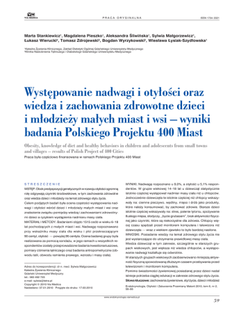 PRACA ORYGINALNA ISSN 1734–3321 Marta Stankiewicz1, Magdalena Pieszko1, Aleksandra Śliwińska1, Sylwia Małgorzewicz1, Łukasz Wierucki2, Tomasz Zdrojewski2, Bogdan Wyrzykowski2, Wiesława Łysiak-Szydłowska1 1 Katedra Żywienia Klinicznego, Zakład Dietetyki Ogólnej Gdańskiego Uniwersytetu Medycznego Klinika Nadciśnienia Tętniczego i Diabetologii Gdańskiego Uniwersytetu Medycznego 2 Występowanie nadwagi i otyłości oraz wiedza i zachowania zdrowotne dzieci i młodzieży małych miast i wsi – wyniki badania Polskiego Projektu 400 Miast Obesity, knowledge of diet and healthy behaviors in children and adolescents from small towns and villages – results of Polish Project of 400 Cities Praca była częściowo finansowana w ramach Polskiego Projektu 400 Miast STRESZCZENIE WYNIKI. Nadwagę rozpoznano u 9,0%, a otyłość u 5,1% respon- WSTĘP. Obok predyspozycji genetycznych w rozwoju otyłości ogromną dentów. W grupie wiekowej 14–18 lat u dziewcząt statystycznie rolę odgrywają czynniki środowiskowe, w tym zachowania zdrowotne istotnie częściej występował nadmiar masy ciała niż u chłopców. oraz wiedza dzieci i młodzieży na temat zdrowego stylu życia. Jednocześnie dziewczęta te istotnie częściej niż chłopcy wskazy- Celem podjętych badań była ocena częstości występowania nad- wały na: ciemne pieczywo, wędliny, mięso i drób jako produkty, wagi i otyłości wśród dzieci i młodzieży małych miast i wsi oraz które należy konsumować, by zachować zdrowie. Starsze dzieci znalezienie związku pomiędzy wiedzą i zachowaniami zdrowotny- istotnie częściej wskazywały na: stres, palenie tytoniu, spożywanie mi dzieci a ryzykiem wystąpienia nadmiaru masy ciała. tłustego mięsa, słodyczy, „bycie grubasem”, brak aktywności fizycz- MATERIAŁ I METODY. Badaniami objęto 1515 osób w wieku 6–18 nej jako czynniki, które są niekorzystne dla zdrowia. Chłopcy wię- lat pochodzących z małych miast i wsi. Nadwagę rozpoznawano cej czasu spędzali przed monitorem komputera i telewizora niż przy wskaźniku masy ciała dla wieku i płci przekraczającym 90 centyl, otyłość — powyżej 95 centyla. Ocena badanej grupy była realizowana za pomocą sondażu, w jego ramach u wszystkich respondentów zostały przeprowadzone badania kwestionariuszowe, pomiary ciśnienia tętniczego oraz badania antropometryczne (obwodu talii, obwodu ramienia prawego, wzrostu i masy ciała). dziewczęta — wraz z wiekiem zjawisko to było bardziej nasilone. WNIOSKI. Posiadanie wiedzy na temat zdrowego stylu życia nie jest wystarczające do utrzymania prawidłowej masy ciała. Wiedza dziewcząt w tym zakresie, szczególnie w starszych grupach wiekowych, jest większa niż wiedza chłopców, a występowanie nadwagi kształtuje się odwrotnie. W starszych grupach wiekowych zaobserwowano mniejszą aktywność fizyczną spowodowaną dłuższym czasem przebywania przed Adres do korespondencji: dr n. med. Sylwia Małgorzewicz Katedra Żywienia Klinicznego Gdański Uniwersytet Medyczny tel.: 583 492 723 e-mail: [email protected] Copyright © 2010 Via Medica Nadesłano: 07.01.2010 Przyjęto do druku: 17.03.2010 telewizorem i monitorem komputera. Pomimo świadomości żywieniowej posiadanej przez dzieci nadal istnieje potrzeba ciągłej edukacji w zakresie zdrowego stylu życia. Słowa kluczowe: zachowania żywieniowe, styl życia, dzieci i młodzież Endokrynologia, Otyłość i Zaburzenia Przemiany Materii 2010, tom 6, nr 2, 59–66 www.endokrynologia.viamedica.pl 59 Endokrynologia, Otyłość i Zaburzenia Przemiany Materii 2010, tom 6, nr 2 ABSTRACT INTRODUCTION. Apart from genetic predispositions, environmental factors play huge role, including health behaviors and knowl- Tabela 1. Badane przedziały wiekowe Przedział wiekowy Płeć respondenta Dziewczynka edge of healthy lifestyle in children and adolescents. The aim of the study was to estimate the frequency of overweight and obesity among children and adolescents from small towns and villages and tracing association between the knowledge and health behaviors in children and overweight risk Chłopiec 6–9 lat 183 185 10–13 lat 233 235 14–18 lat 345 334 MATERIAL AND METHODS. The research was conducted in a group of 1515 healthy children aged 6–18 from small towns and villages. The questionnaires, blood pressure and anthropometric measurements were done in all studied children. RESULTS. Overweight was diagnosed when body mass index for on age sex identified surpassed 90th centile, and obesity — when it was above 95th centile. Overweight was diagnosed in 9.0%, and obesity in 5.1% of respondents. Excess body mass was statistically more frequently observed in girls then in boys aged 14–18. These girls substantially more frequently pointed at whole meal bread, smoked sausages, meat and poultry as products, which are necessary to keep fit. Older children more often pointed at stress, smoking cigarettes, consuming fatty meat, sweets and “being plump”. Lack of physical activity is factor, which damage health. Boys spent more time in front of the computer or TV than girls — as the children grow the phenomenon intensified. CONCLUSIONS. The knowledge of eating habits is not enough to skiej i wsp., w którym 81,8% respondentów stwierdziło, że widzi potrzebę informacji na temat zdrowego stylu życia [1]. Agresywne reklamy oraz promowanie wysokoprzetworzonych i kalorycznych artykułów spożywczych powodują, że otyłe dzieci spotyka się już w przedszkolach. Rodzice dzieci z nadwagą nie mają łatwego dostępu do wiarygodnych informacji oraz badań przesiewowych w kierunku miażdżycy, cukrzycy typu 2 czy wad postawy, które są stałym elementem obrazu klinicznego dziecka otyłego. Celem badania była ocena częstości występowania nadwagi i otyłości wśród dzieci i młodzieży małych miast i wsi oraz określenie związku pomiędzy wiedzą i zachowaniami zdrowotnymi dzieci a ryzykiem wystąpienia nadm