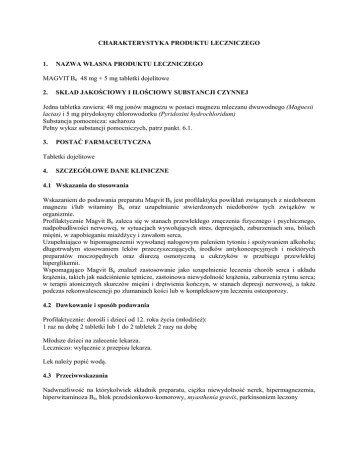 CHARAKTERYSTYKA PRODUKTU LECZNICZEGO 1. NAZWA WŁASNA PRODUKTU LECZNICZEGO MAGVIT B6 48 mg + 5 mg tabletki dojelitowe 2. SKŁAD JAKOŚCIOWY I ILOŚCIOWY SUBSTANCJI CZYNNEJ Jedna tabletka zawiera: 48 mg jonów magnezu w postaci magnezu mleczanu dwuwodnego (Magnesii lactas) i 5 mg pirydoksyny chlorowodorku (Pyridoxini hydrochloridum) Substancja pomocnicza: sacharoza Pełny wykaz substancji pomocniczych, patrz punkt. 6.1. 3. POSTAĆ FARMACEUTYCZNA Tabletki dojelitowe 4. SZCZEGÓŁOWE DANE KLINICZNE 4.1 Wskazania do stosowania Wskazaniem do podawania preparatu Magvit B6 jest profilaktyka powikłań związanych z niedoborem magnezu i/lub witaminy B6 oraz uzupełnianie stwierdzonych niedoborów tych związków w organizmie. Profilaktycznie Magvit B6 zaleca się w stanach przewlekłego zmęczenia fizycznego i psychicznego, nadpobudliwości nerwowej, w sytuacjach wywołujących stres, depresjach, zaburzeniach snu, bólach mięśni, w zapobieganiu miażdżycy i zawałom serca. Uzupełniająco w hipomagnezemii wywołanej nałogowym paleniem tytoniu i spożywaniem alkoholu; długotrwałym stosowaniem leków przeczyszczających, środków antykoncepcyjnych i niektórych preparatów moczopędnych oraz diurezą osmotyczną u cukrzyków w przebiegu przewlekłej hiperglikemii. Wspomagająco Magvit B6 znalazł zastosowanie jako uzupełnienie leczenia chorób serca i układu krążenia, takich jak nadciśnienie tętnicze, zastoinowa niewydolność krążenia, zaburzenia rytmu serca; w terapii atonicznych skurczów mięśni i drętwienia kończyn, w stanach depresji nerwowej, a także podczas rekonwalescencji po złamaniach kości lub w kompleksowym leczeniu osteoporozy. 4.2 Dawkowanie i sposób podawania Profilaktycznie: dorośli i dzieci od 12. roku życia (młodzież): 1 raz na dobę 2 tabletki lub 1 do 2 tabletek 2 razy na dobę Młodsze dzieci na zalecenie lekarza. Leczniczo: wyłącznie z przepisu lekarza. Lek należy popić wodą. 4.3 Przeciwwskazania Nadwrażliwość na którykolwiek składnik preparatu, ciężka niewydolność nerek, hipermagnezemia, hiperwitaminoza B6, blok przedsionkowo-komorowy, myasthenia gravis, parkinsonizm leczony L-dopą bez stosowania inhibitora obwodowej dekarboksylazy lewodopy, znaczne niedociśnienie tętnicze, zaburzenia wchłaniania z przewodu pokarmowego, biegunka. 4.4 Specjalne ostrzeżenia i środki ostrożności dotyczące stosowania Podczas stosowania doustnych preparatów tetracyklin należy zachować trzygodzinną przerwę pomiędzy podaniem antybiotyku a preparatu Magvit B6 z powodu zmniejszenia wchłaniania tetracyklin z przewodu pokarmowego. Pacjenci z zaburzeniami czynności serca i nerek przed zastosowaniem leku powinni skonsultować się z lekarzem. Nie należy stosować preparatu na czczo, gdyż może spowodować biegunkę. Pacjenci z rzadkimi dziedzicznymi zaburzeniami związanymi z nietolerancją fruktozy, zespołem złego wchłaniania glukozy-galaktozy lub niedoborem sacharazy-izomaltazy, nie powinni przyjmować produktu Magvit B6. 4.5 Interakcje z innymi lekami i inne rodzaje interakcji Magnez zmniejsza wchłanianie teofiliny, tetracyklin, preparatów żelaza, związków fluoru i doustnych leków przeciwzakrzepowych z grupy warfaryny. Fosforany, duże dawki wapnia, nadmiar lipidów, fityniany, zmniejszają wchłanianie magnezu z przewodu pokarmowego. Leki moczopędne, cisplatyna, cykloseryna, mineralokortykosteroidy, nasilają wydalanie magnezu z moczem. Aminoglikozydy, środki zwiotczające oraz kolistyna stosowane jednocześnie z preparatami magnezowymi mogą spowodować porażenie mięśniowe. Na skutek alkalizacji moczu następuje zmniejszenie nerkowego wydalania chinidyny co wiąże się z ryzykiem jej przedawkowania. Witamina B6 może zmniejszać stężenie fenytoiny w surowicy krwi. Stosowanie cykloseryny, hydralazyny, izoniazydu, penicylaminy i doustnych środków antykoncepcyjnych prowadzi do zwiększenia zapotrzebowania na witaminę B6. 4.6 Ciąża lub laktacja Nie wiadomo, czy lek może powodować zagrożenie dla płodu, ponieważ nie przeprowadzono odpowiednio liczebnych i dobrze kontrolowanych obserwacji u ludzi. Dlatego decyzję o stosowaniu preparatu u kobiet w ciąży i karmiących piersią należy każdorazowo podejmować indywidualnie w stosunku do pacjentki. 4.7 Wpływ na zdolność prowadzenia pojazdów mechanicznych i obsługiwania urządzeń mechanicznych w ruchu Lek nie powoduje zaburzenia sprawności psychofizycznej, zdolności prowadzenia pojazdów mechanicznych i obsługiwania urządzeń mechanicznych w ruchu. 4.8 Działania niepożądane Przy proponowanym dawkowaniu na ogół nie występują. Sporadycznie mogą pojawić się zaburzenia żołądkowo-jelitowe, nudności, wymioty, luźne stolce lub zaczerwienienie skóry. Długotrwałe systematyczne przyjmowanie pirydoksyny w dawce 50 mg/dobę może stać się przyczyną obwodowej neuropatii czuciowej, natomiast dawki dobowe powyżej 200 mg mogą prowadzić do niedoboru kwasu foliowego, zaburzeń oddechowych oraz różnego typu dermatoz. 2 4.9 Przedawkowanie Przy długotrwałym przyjmowaniu leku w dawkach przekraczających zalecane mogą pojawić się objawy opisane działaniami niepożądanymi oraz spadek ciśnienia krwi, osłabienie mięśniowe, zaburzenia czucia, ból kończyn, brak odruchów ścięgnowych, trudności w oddychaniu i zaburzenia rytmu pracy serca jako efekt zasadowicy lub zespołu mleczno-alkalicznego. W przypadku przedawkowania stosuje się nawodnienie doustne lub dożylne (w ciężkich stanach podaje się dożylnie 0,9% roztwór NaCl). Jednocześnie lub tuż po nawodnieniu podaje się furosemid lub inne leki moczopędne. Jeśli nie ma poprawy stosuje się kalcytoninę. Pacjentom z małym stężeniem fosforanów we krwi i sprawnymi nerkami można podać doustnie fosforany. 5. WŁAŚCIWOŚCI FARMAKOLOGICZNE Grupa farmakoterapeutyczna: związki mineralne, pozostałe związki mineralne, mleczan magnezu. Kod ATC A12C C06 5.1 Właściwości farmakodynamiczne i f