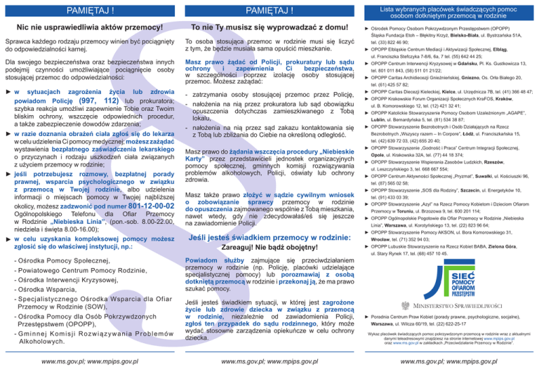 § PAMIĘTAJ ! PAMIĘTAJ ! Nic nie usprawiedliwia aktów przemocy! To nie Ty musisz się wyprowadzać z domu! Sprawca każdego rodzaju przemocy winien być pociągnięty do odpowiedzialności karnej. To osoba stosująca przemoc w rodzinie musi się liczyć z tym, że będzie musiała sama opuścić mieszkanie. Dla swojego bezpieczeństwa oraz bezpieczeństwa innych podejmij czynności umożliwiające pociągnięcie osoby stosującej przemoc do odpowiedzialności: Masz prawo żądać od Policji, prokuratury lub sądu ochrony i zapewnienia Ci bezpieczeństwa, w szczególności poprzez izolację osoby stosującej przemoc. Możesz zażądać: ► w sytuacjach zagrożenia życia lub zdrowia powiadom Policję (997, 112) lub prokuratora; szybka reakcja umożliwi zapewnienie Tobie oraz Twoim bliskim ochrony, wszczęcie odpowiednich procedur, a także zabezpieczenie dowodów zdarzenia; ► w razie doznania obrażeń ciała zgłoś się do lekarza w celu udzielenia Ci pomocy medycznej; możesz zażądać wystawienia bezpłatnego zaświadczenia lekarskiego o przyczynach i rodzaju uszkodzeń ciała związanych z użyciem przemocy w rodzinie; ► jeśli potrzebujesz rozmowy, bezpłatnej porady prawnej, wsparcia psychologicznego w związku z przemocą w Twojej rodzinie, albo udzielenia informacji o miejscach pomocy w Twojej najbliższej okolicy, możesz zadzwonić pod numer 801-12-00-02 Ogólnopolskiego Telefonu dla Ofiar Przemocy w Rodzinie „Niebieska Linia”, (pon.-sob. 8.00-22.00, niedziela i święta 8.00-16.00); ► w celu uzyskania kompleksowej pomocy możesz zgłosić się do właściwej instytucji, np.: - zatrzymania osoby stosującej przemoc przez Policję, - nałożenia na nią przez prokuratora lub sąd obowiązku opuszczenia dotychczas zamieszkiwanego z Tobą lokalu, - nałożenia na nią przez sąd zakazu kontaktowania się z Tobą lub zbliżania do Ciebie na określoną odległość. - Ośrodka Pomocy Społecznej, - Powiatowego Centrum Pomocy Rodzinie, - Ośrodka Interwencji Kryzysowej, - Ośrodka Wsparcia, - Specjalistycznego Ośrodka Wsparcia dla Ofiar Przemocy w Rodzinie (SOW), - Ośrodka Pomocy dla Osób Pokrzywdzonych Przestępstwem (OPOPP), - Gminnej Komisji Rozwiązywania Problemów Alkoholowych. Powiadom służby zajmujące się przeciwdziałaniem przemocy w rodzinie (np. Policję, placówki udzielające specjalistycznej pomocy) lub porozmawiaj z osobą dotkniętą przemocą w rodzinie i przekonaj ją, że ma prawo szukać pomocy. www.ms.gov.pl; www.mpips.gov.pl Masz prawo do żądania wszczęcia procedury „Niebieskie Karty” przez przedstawicieli jednostek organizacyjnych pomocy społecznej, gminnych komisji rozwiązywania problemów alkoholowych, Policji, oświaty lub ochrony zdrowia. Masz także prawo złożyć w sądzie cywilnym wniosek o zobowiązanie sprawcy przemocy w rodzinie do opuszczenia zajmowanego wspólnie z Tobą mieszkania, nawet wtedy, gdy nie zdecydowałaś/eś się jeszcze na zawiadomienie Policji. Jeśli jesteś świadkiem przemocy w rodzinie: Zareaguj! Nie bądź obojętny! Jeśli jesteś świadkiem sytuacji, w której jest zagrożone życie lub zdrowie dziecka w związku z przemocą w rodzinie, niezależnie od zawiadomienia Policji, zgłoś ten przypadek do sądu rodzinnego, który może wydać stosowne zarządzenia opiekuńcze w celu ochrony dziecka. www.ms.gov.pl; www.mpips.gov.pl Lista wybranych placówek świadczących pomoc osobom dotkniętym przemocą w rodzinie ► Ośrodek Pomocy Osobom Pokrzywdzonym Przestępstwem (OPOPP) Śląska Fundacja Etoh – Błękitny Krzyż, Bielsko-Biała, ul. Bystrzańska 51A, tel. (33) 822 46 90; ► OPOPP Elbląskie Centrum Mediacji i Aktywizacji Społecznej, Elbląg, ul. Franciszka Stefczyka 7-8/6, 6a, 7 tel. (55) 642 44 25; ► OPOPP Centrum Interwencji Kryzysowej w Gdańsku, Pl. Ks. Gustkowicza 13, tel. 801 011 843, (58) 511 01 21/22; ► OPOPP Caritas Archidiecezji Gnieźnieńskiej, Gniezno, Os. Orła Białego 20, tel. (61) 425 57 82; ► OPOPP Caritas Diecezji Kieleckiej, Kielce, ul. Urzędnicza 7B, tel. (41) 366 48 47; ► OPOPP Krakowskie Forum Organizacji Społecznych KraFOS, Kraków, ul. B. Komorowskiego 12, tel. (12) 421 32 41; ► OPOPP Katolickie Stowarzyszenie Pomocy Osobom Uzależnionym „AGAPE”, Lublin, ul. Bernardyńska 5, tel. (81) 534 38 87; ► OPOPP Stowarzyszenie Bezrobotnych i Osób Działających na Rzecz Bezrobotnych „Wszyscy razem – In Corpore”, Łódź, ul. Franciszkańska 15, tel. (42) 639 72 03, (42) 655 20 40; ► OPOPP Stowarzyszenie „Godność i Praca” Centrum Integracji Społecznej, Opole, ul. Krakowska 32A, tel. (77) 44 18 374; ► OPOPP Stowarzyszenie Wspierania Zasobów Ludzkich, Rzeszów, ul. Leszczyńskiego 3, tel. 668 667 554; ► OPOPP Centrum Aktywności Społecznej „Pryzmat”, Suwałki, ul. Kościuszki 96, tel. (87) 565 02 58; ► OPOPP Stowarzyszenie „SOS dla Rodziny”, Szczecin, ul. Energetyków 10, tel. (91) 433 03 39; ► OPOPP Stowarzyszenie „Azyl” na Rzecz Pomocy Kobietom i Dzieciom Ofiarom Przemocy w Toruniu, ul. Brzozowa 9, tel. 600 201 114; ► OPOPP Ogólnopolskie Pogotowie dla Ofiar Przemocy w Rodzinie „Niebieska Linia”, Warszawa, ul. Korotyńskiego 13, tel. (22) 823 96 64; ► OPOPP Stowarzyszenie Pomocy AKSON, ul. Bora Komorowskiego 31, Wrocław, tel. (71) 352 94 03; ► OPOPP Lubuskie Stowarzyszenie na Rzecz Kobiet BABA, Zielona Góra, ul. Stary Rynek 17, tel. (68) 457 10 45. ► Poradnia Centrum Praw Kobiet (porady prawne, psychologiczne, socjalne), Warszawa, ul. Wilcza 60/19, tel. (22) 622-25-17 Wykaz placówek świadczących pomoc pokrzywdzonym przemocą w rodzinie wraz z aktualnymi danymi teleadresowymi znajdziesz na stronie internetowej www.mpips.gov.pl oraz www.ms.gov.pl w zakładkach „Przeciwdziałanie Przemocy w Rodzinie”. www.ms.gov.pl; www.mpips.gov.pl Lista wybranych placówek świadczących pomoc osobom dotkniętym przemocą w rodzinie ► Specjalistyczny Ośrodek Wsparcia dla Ofiar Przemocy w Rodzinie (SOW), Białoga