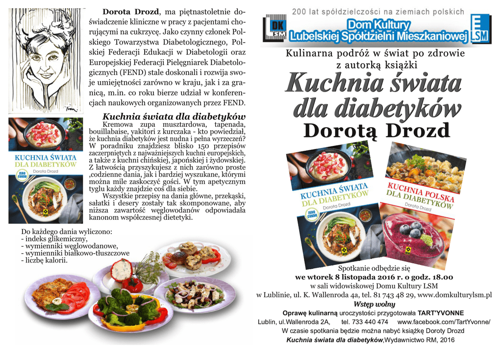 Dorota Drozd, ma piętnastoletnie do świadczenie kliniczne w pracy z pacjentami cho rującymi na cukrzycę. Jako czynny członek Pol skiego Towarzystwa Diabetologicznego, Pol skiej Federacji Edukacji w Diabetologii oraz Europejskiej Federacji Pielęgniarek Diabetolo gicznych (FEND) stale doskonali i rozwija swo je umiejętności zarówno w kraju, jak i za gra nicą, m.in. co roku bierze udział w konferen cjach naukowych organizowanych przez FEND. Kuchnia świata dla diabetyków Kremowa zupa musztardowa, tapenada, bouillabaise, yakitori z kurczaka kto powiedział, że kuchnia diabetyków jest nudna i pełna wyrzeczeń? W poradniku znajdziesz blisko 150 przepisów zaczerpniętych z najważniejszych kuchni europejskich, a także z kuchni chińskiej, japońskiej i żydowskiej. Z łatwością przyszykujesz z nich zarówno proste ,codzienne dania, jak i bardziej wyszukane, którymi można mile zaskoczyć gości. W tym apetycznym tyglu każdy znajdzie coś dla siebie. Wszystkie przepisy na dania główne, przekąski, sałatki i desery zostały tak skomponowane, aby niższa zawartość węglowodanów odpowiadała kanonom współczesnej dietetyki. Do każdego dania wyliczono: indeks glikemiczny, wymienniki węglowodanowe, wymienniki białkowotłuszczowe liczbę kalorii. Kulinarna podróż w świat po zdrowie z autorką książki Kuchnia świata dla diabetyków Dorotą Drozd Spotkanie odbędzie się we wtorek 8 listopada 2016 r. o godz. 18.00 w sali widowiskowej Domu Kultury LSM w Lublinie, ul. K. Wallenroda 4a, tel. 81 743 48 29, www.domkulturylsm.pl W s t ę p w ol n y Oprawę kulinarną uroczystości przygotowała TART'YVONNE Lublin, ul.Wallenroda 2A, tel. 733 440 474 www.facebook.com/TartYvonne/ W czasie spotkania będzie można nabyć książkę Doroty Drozd Kuchnia świata dla diabetyków,Wydawnictwo RM, 201 6 Ciekawostki do przepisów japońskich Wakame to odmiana wodorostów należąca do grupy brunatnic. Glony te rosną w wodzie do głę bokości sześciu metrów i mają kolor oliwkowy. Najczęściej występują w kształcie cienkich, skręconych pasm. Są lekko słodkie w smaku. Największą popularnością cieszą się w Japonii, gdzie najchętniej ja dane są w formie sałatek lub jako dodatek do zup. Jod zawarty w glonach wakame ma wpływ na gospodarkę hormonalną człowieka. Odnotowano w badaniach korzystny wpływ na pracę tarczycy. Glony jadane systematycznie pobudzają przemianę materii. Wysoka zawartość magnezu w glonach wakame zwiększa wykorzystanie białka przez orga nizm, wspomagając procesy wzrostu i naprawy komórek. Zawierają one również miedź, cynk, fosfor oraz sporo witaminy B12, A, C, E, K, PP. Aby uzupeł nić niedobory witamin i minerałów wystarczy włączyć do codziennej diety zaledwie 5g glonów. Inne popularne glony to: Nori (sałata morska) – najbardziej lekkostrawne, o barwie czerwonej lub zielonej. Obniżają po ziom cholesterolu i wysokie ciśnienie, wpływają dobroczynnie na stan skóry i włosów. Arame – czarne wodorosty , źródło jodu, żelaza i wapnia. Pomocne w łagodzeniu wysokiego ci śnienia, stosowane w leczeniu dolegliwości kobiecych i chorób jamy ustnej. Dulse – o czerwonym i niebieskim zabarwieniu oraz specyficznym ostrym smaku. Posiadają du że stężenie jodu, manganu i żelaza. Hijiki – czarne algi o ostrym smaku, bogate w wapń wzmacniający kości, normalizują też poziom cukru oraz korzystnie działają na tarczycę. Agar – dzięki „żelującej” formie stanowi konkurencję dla żelatyny pochodzenia zwierzęcego. Za wiera żelazo, krzem i fosfor. Wspomaga trawienie i ma dobroczynny wpływ na płuca i wątrobę. Francja krajem tartyciekawostki Kuchnia francuska z Alzacji odziedziczyła tradycje kulinarne z dwóch państw. Historycy kuli nariów mawiają,że smak potraw pochodzi z tradycji francuskiej, natomiast wielkość porcji z kuchni niemieckiej. Słynna alzacka Tarte flambée zyskała wielu fanów, z powodu prostych składników i szybkiego wykonania. O tartach mówi się ,że są wiejskimi posiłkami. Ciasto tarty jest ciastem chlebowym. Historia tego dania mówi ,że chleb pieczono w domu, a tarta służyła do wykrywania temperatu ry pieca. Do wypieku chleba piec nie mógł być zbyt gorący, dlatego jego nagrzanie sprawdzano poprzez obserwację brzegów tarty. Rodzaje tart: *Au Munster z serem Munster, *Aux pommes tarta na słodko, z jabłkami, śmietaną lub bia łym serem, *Traditionelle boczek +cebula, *Gratinee tradycyjna+ser gruyère Przepis na Tartę z jabłkami(„złamany”dla diabetyków i nie tylko) Składniki: porcja dla 8 osób Ciasto: •165 gram mąki (150 gram mąki żytniej+15 gram mąki pszennej), •szczypta soli, •120 g masła o temperaturze pokojowej, •1 żółtko, •3 łyżki zimnej wody. Nadzienie: •120 g masła o temperaturze pokojowej, •50 gram cukru trzcinowego, •1 jajko, •1 żółt ko, •120 g drobno pokrojonych migdałów, •2 łyżeczki mąki migdałowej, •550 g jabłek, obranych, bez gniazd nasiennych i pokrojonych na plasterki, •1 łyżeczka cynamonu, •szczypta mielonych goździków Wykonanie: •1. W średniej misce wymieszaj mąkę z solą. Dodaj masło, żółtko, wodę i mieszaj do uzyskania dużych grudek. •2. Wyrób ciasto i pozostaw na dnie miski przykryte folią aluminiową. •3. Pozostaw ciasto w lodówce na godzinę. •4. Przygotuj nadzienie: *w średniej misce utrzyj masło z cukrem do uzyskania lekkiej i miękkiej masy * stopniowo dodawaj po jednym jajku oraz pozostałe żółtka. *dodaj 2 łyżki mąki do posiekanych migdałów, wymieszaj , a następnie dodaj do masy •5. Rozwałkuj ciasto na posypanej mąką stolnicy na okrągły placek o średnicy około 36 cm. •6. Złóż dwa razy na pół i prze nieść do okrągłej foremki o średnicy 30 cm. Rozłóż ciasto równomiernie na dnie i bokach formy. Nakłuj widelcem i wstaw do lodówki na przynajmniej pół godziny. •7.Nagrzać piekarnik do 200°C. •8.Nakładaj nadzienie ró