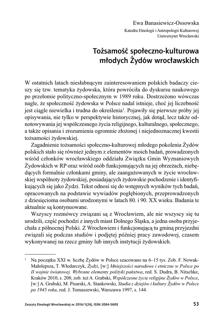 Ewa Banasiewicz-Ossowska Katedra Etnologii i Antropologii Kulturowej Uniwersytet Wrocławski Tożsamość społeczno-kulturowa młodych Żydów wrocławskich W ostatnich latach niesłabnącym zainteresowaniem polskich badaczy cieszy się tzw. tematyka żydowska, która powróciła do dyskursu naukowego po przełomie polityczno-społecznym w 1989 roku. Dostrzeżono wówczas nagle, że społeczność żydowska w Polsce nadal istnieje, choć jej liczebność jest ciągle niewielka i trudna do określenia1. Pojawiły się pierwsze próby jej opisywania, nie tylko w perspektywie historycznej, jak dotąd, lecz także odnotowywania jej współczesnego życia religijnego, kulturalnego, społecznego, a także opisania i zrozumienia ogromnie złożonej i niejednoznacznej kwestii tożsamości żydowskiej. Zagadnienie tożsamości społeczno-kulturowej młodego pokolenia Żydów polskich stało się również jednym z elementów moich badań, prowadzonych wśród członków wrocławskiego oddziału Związku Gmin Wyznaniowych Żydowskich w RP oraz wśród osób funkcjonujących na jej obrzeżach, niebędących formalnie członkami gminy, ale zaangażowanych w życie wrocławskiej wspólnoty żydowskiej, posiadających żydowskie pochodzenie i identyfikujących się jako Żydzi. Tekst odnosi się do wstępnych wyników tych badań, opracowanych na podstawie wywiadów pogłębionych, przeprowadzonych z dziesięcioma osobami urodzonymi w latach 80. i 90. XX wieku. Badania te aktualnie są kontynuowane. Wszyscy rozmówcy związani są z Wrocławiem, ale nie wszyscy się tu urodzili, część pochodzi z innych miast Dolnego Śląska, a jedna osoba przyjechała z północnej Polski. Z Wrocławiem i funkcjonującą tu gminą przyjezdni związali się podczas studiów i podjętej później pracy zawodowej, czasem wykonywanej na rzecz gminy lub innych instytucji żydowskich. 1 Na początku XXI w. liczbę Żydów w Polsce szacowano na 6–15 tys. Zob. F. NowakMałolepsza, T. Włodarczyk, Żydzi, [w:] Mniejszości narodowe i etniczne w Polsce po II wojnie światowej. Wybrane elementy polityki państwa, red. S. Dudra, B. Nitschke, Kraków 2010, s. 208; zob. też A. Grabski, Współczesne życie religijne Żydów w Polsce, [w:] A. Grabski, M. Pisarski, A. Stankowski, Studia z dziejów i kultury Żydów w Polsce po 1945 roku, red. J. Tomaszewski, Warszawa 1997, s. 144. Zeszyty Etnologii Wrocławskiej nr 2016/1(24), ISSN 2084-560X 53 Ewa Banasiewicz-Ossowska Jak zauważyły badaczki zajmujące się problematyką tożsamości żydowskiej, Helena Datner i Małgorzata Melchior, po zmianie ustroju w Polsce rozpoczął się proces deasymilacji osób pochodzenia żydowskiego. Obserwowany jest on przede wszystkim wśród bardzo młodych i tych nieco starszych – trzydziestokilkulatków, dzięki czemu społeczność żydowska w Polce bardzo powoli się odradza, zwiększa się jej liczebność, powstają także nowe instytucje i organizacje mające zaspokajać potrzeby tej mniejszości2. Zarówno badacze zajmujący się współcześnie tematyką tożsamości żydowskiej, jak i członkowie społeczności żydowskiej, stają jednak przed niełatwym do rozwiązania problemem określenia tego, kto jest Żydem i jakie kryteria należy przyjąć, aby odpowiedzieć na tak postawione pytanie. Jeszcze w latach międzywojennych, mimo widocznych już od okresu oświecenia żydowskiego, czyli haskali, silnych tendencji odśrodkowych, definiowanie kategorii „Żyd” było znacznie prostsze. Wówczas uznawano bowiem, że „Żydem był ten, kto formalnie wyznawał judaizm”, czyli należał do wyznaniowej gminy żydowskiej, której członkami były zarówno osoby religijne, jak i niereligijne, poczuwające się do narodowości żydowskiej, oraz te, które identyfikowały się z narodowością polską, ale były nieochrzczone3. Jednoznacznie na ten temat wypowiada się żydowskie prawo religijne – halacha –precyzując, że Żydem jest ten, kogo matka była Żydówką lub kto przeszedł konwersję na judaizm. Holokaust, powojenne alije, a później wydarzenia marca 1968 r. spowodowały jednak drastyczne zmniejszenie się w Polsce liczby Żydów halachicznych. Gmina żydowska we Wrocławiu, jako pierwsza w kraju, w latach 90. XX w. odeszła od halachicznego kryterium przynależności do narodu żydowskiego, zastępując je kryterium etnicznym. Zgodnie z definicją etniczną, pochodzenie żydowskie przypisuje się osobie, której przynajmniej jeden z czworga dziadków miał takie pochodzenie4. Podobnie jak w przypadku obowiązującego w Izraelu Prawa powrotu. Członkiem żydowskiej gminy wy2 3 4 54 H. Datner, M. Melchior, Żydzi we współczesnej Polsce – nieobecność i powroty, [w:] Mniejszości narodowe w Polsce, red. Z. Kurcz, Wrocław 1997, s. 77; zob. też S. Krajewski, Wyznaczniki tożsamości żydowskiej w Polsce, „Przegląd Powszechny” 2009, nr 6, s. 45. I. Nowakowska, Fenomen żydowskiej mniejszości narodowej w okresie międzywojennym na przykładzie Polski w latach 1918–1939, „Biuletyn Żydowskiego Instytutu Historycznego” 1989, nr 1–2, s. 46. A. Grabski, op. cit., s. 177; zob. też Gmina żydowska nigdy nie była organizacją wyznaniową <www.fzp.net.pl/judaizm/gmina-zydowska-nigdy-nie-byla-organizacja-wyznaniowa> (data dostępu: 29.04.2016). Tożsamość społeczno-kulturowa młodych Żydów wrocławskich znaniowej może być więc dziś osoba niebędąca Żydem zgodnie z halachą oraz niebędąca wyznawcą judaizmu. Nie może być jednak wyznawcą innej religii5. Wymaganym warunkiem jest potwierdzenie i udokumentowanie żydowskiego pochodzenia zgodnie z definicją etniczną. Poza organizacją gminy funkcjonuje duża grupa osób niebędących jej członkami, często nieposiadających formalnego potwierdzenia swego pochodzenia, choć mocno zaangażowanych w życie społeczności i uczestniczących w wielu jej działaniach. Analizując kategorię „Żyd”, można oczywiście posłużyć się obiektywnymi k