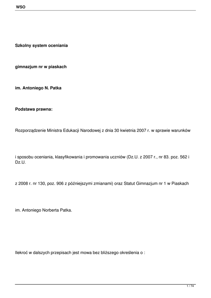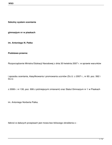 WSO Szkolny system oceniania gimnazjum nr w piaskach im. Antoniego N. Patka Podstawa prawna: Rozporządzenie Ministra Edukacji Narodowej z dnia 30 kwietnia 2007 r. w sprawie warunków i sposobu oceniania, klasyfikowania i promowania uczniów (Dz.U. z 2007 r., nr 83. poz. 562 i Dz.U. z 2008 r. nr 130, poz. 906 z późniejszymi zmianami) oraz Statut Gimnazjum nr 1 w Piaskach im. Antoniego Norberta Patka. Ilekroć w dalszych przepisach jest mowa bez bliższego określenia o : 1 / 74 WSO 1. Szkole - należy przez to rozumieć Gimnazjum nr 1 w Piaskach im. Antoniego Norberta Patka, 2. Statucie - należy przez to rozumieć Statut Gimnazjum nr 1 w Piaskach im. Antoniego Norberta Patka, 3. Radzie - należy przez to rozumieć Radę Pedagogiczną Gimnazjum nr 1 w Piaskach im. Antoniego Norberta Patka, 4. Dyrektorze - należy przez to rozumieć Dyrektora Gimnazjum nr 1 w Piaskach im. Antoniego Norberta Patka, 5. Rodzicu - należy przez to rozumieć prawnego opiekuna, 6. Nauczycielu 2 / 74 WSO - należy przez to rozumieć nauczycieli i innych pracowników pedagogicznych zatrudnionych w Gimnazjum 7. Wychowawcy - należy przez to rozumieć wychowawcę klasy. §1 Założenia ogólne systemu oceniania 1. Ocenianie osiągnięć edukacyjnych i zachowania uczniów odbywa się w ramach oceniania wewnątrzszkolnego. 2. Wewnątrzszkolny system oceniania uczniów Gimnazjum nr 1 w Piaskach ma na celu: 1) informowanie o poziome osiągnięć edukacyjnych ucznia i jego zachowaniu oraz o postępach w tym zakresie, 2) motywowanie do dalszych postępów w nauce i zachowaniu, 3) udzielenie uczniowi pomocy w samodzielnym planowaniu swojego rozwoju, 4) umożliwienie nauczycielom doskonalenia organizacji i metod pracy 3 / 74 WSO dydaktyczno-wychowawczej, 5) dostarczenie rodzicom i nauczycielom informacji o postępach, trudnościach i w nauce zachowaniu, 4. Ocenianie osiągnięć uczniów polega na rozpoznawaniu przez nauczycieli poziomu postępów w opanowaniu przez ucznia wiadomości i umiejętności w stosunku do wymagań edukacyjnych wynikających z podstawy programowej i realizowanych w szkole programów nauczania. 5. Ocenianie zachowania ucznia polega na rozpoznaniu przez wychowawcę klasy, nauczycieli oraz uczniów danej klasy stopnia respektowania przez ucznia zasad współżycia społecznego i norm etycznych oraz obowiązków ucznia określonych w statucie szkoły. 6. Ocenianie wewnątrzszkolne obejmuje: 1) formułowanie przez nauczycieli wymagań edukacyjnych niezbędnych do uzyskania poszczególnych śródrocznych i rocznych ocen klasyfikacyjnych z obowiązkowych i dodatkowych zajęć edukacyjnych, 2) ustalenie kryteriów oceniania zachowania, 3) ocenianie bieżące i ustalenie śródrocznych i rocznych ocen klasyfikacyjnych z obowiązkowych i dodatkowych zajęć edukacyjnych oraz śródrocznej i rocznej oceny klasyfikacyjnej, według skali o której mowa w § 2 ust. 2 i 3, 4) przeprowadzenie egzaminów klasyfikacyjnych, 4 / 74 WSO 5) ustalenie warunków i trybu uzyskania wyższych niż przewidywane rocznych ocen klasyfikacyjnych z obowiązkowych i dodatkowych zajęć edukacyjnych oraz rocznej oceny klasyfikacyjnej zachowania, 6) ustalenie warunków i sposobu przekazania rodzicom (prawnym opiekunom) informacji o postępach i trudnościach ucznia w nauce. §2 Skala ocen 1. Oceny dzielą się na: - bieżące (cząstkowe) - klasyfikacyjne śródroczne i roczne 2. Oceny bieżące oraz klasyfikacyjne śródroczne i roczne osiągnięć edukacyjnych ustala się według następującej skali: - celujący -cel -6 bardzo dobry -bdb -5 dobry -db -4 dostateczny -dst -3 dopuszczający -dop -2 ü niedostateczny - ndst -1 5 / 74 WSO 3. Ocenę zachowania śródroczną i roczną ustala się według następującej skali: - wzorowe -wz bardzo dobre -bdb dobre -db poprawne -popr nieodpowiednie -ndp naganne -ng §3 Terminy klasyfikacji i formy informowania rodziców 1. Terminy klasyfikacji. 1) Rok szkolny trwa od 1 września danego roku kalendarzowego do 31 sierpnia następnego roku kalendarzowego. 2) Klasyfikowanie śródroczne przeprowadza się raz w ciągu roku szkolnego. 3) Ustala się następujące terminy (zwane dalej semestrami) sprawdzania i podsumowywania osiągnięć edukacyjnych ucznia: a) semestr pierwszy, od 1 września do ostatniego piątku stycznia następnego roku kalendarzowego, 6 / 74 WSO b) semestr drugi, od pierwszego poniedziałku przypadającego po ostatnim piątku stycznia do 31 sierpnia danego roku kalendarzowego. 2. Formy informowania uczniów i rodziców (prawnych opiekunów) o wymaganiach edukacyjnych. 1) Nauczyciele przedmiotów są zobowiązani do opracowania wymagań edukacyjnych dla każdej nauczanej klasy na dany rok szkolny. 2) Nauczyciele przedmiotów na początku każdego roku szkolnego informują uczniów oraz rodziców (prawnych opiekunów) o wymaganiach edukacyjnych wynikających z zatwierdzonego w szkolnym zestawie programu nauczania, w następujących formach: a) ustnej, przekazywanej na pierwszych zajęciach edukacyjnych i spotkaniach wychowawców klas z rodzicami, b) zbiorowego spisu dostępnego u dyrektora szkoły, wychowawcy klasy bibliotece szkolnej lub nauczyciela danych zajęć. §4 Wymagania edukacyjne 7 / 74 WSO 1. Wymagania edukacyjne opracowują nauczyciele na bazie obowiązujących podstaw programowych i realizowanych programów nauczania dla poszczególnych zajęć edukacyjnych dopuszczonych przez Dyrektora szkoły dla danego roku szkolnego. 2. Na pierwszej lekcji w danym roku szkolnym nauczyciele informują uczniów o wymaganiach edukacyjnych niezbędnych do uzyskania poszczególnych śródrocznych i rocznych ocen klasyfikacyjnych z obowiązkowych i dodatkowych zajęć edukacyjnych, wynikających z realizowanego przez siebie programu nauczania. 3. Wychowawca klasy na początku roku szkolnego informuje uczniów oraz ich rodziców o warunkach i sposobie oraz kryteriach oceniania zachowania oraz warunkach i trybie uzyskania wyższej niż przewidywana rocznej oceny klasyfikacyjnej za