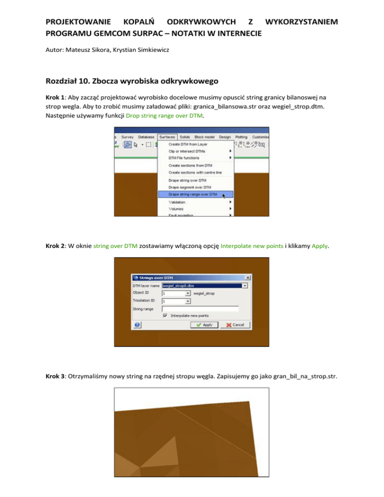 PROJEKTOWANIE KOPALŃ ODKRYWKOWYCH Z WYKORZYSTANIEM PROGRAMU GEMCOM SURPAC – NOTATKI W INTERNECIE Autor: Mateusz Sikora, Krystian Simkiewicz Rozdział 10. Zbocza wyrobiska odkrywkowego Krok 1: Aby zacząd projektowad wyrobisko docelowe musimy opuscid string granicy bilanoswej na strop wegla. Aby to zrobid musimy załadowad pliki: granica_bilansowa.str oraz wegiel_strop.dtm. Następnie używamy funkcji Drop string range over DTM. Krok 2: W oknie string over DTM zostawiamy włączoną opcję Interpolate new points i klikamy Apply. Krok 3: Otrzymaliśmy nowy string na rzędnej stropu węgla. Zapisujemy go jako gran_bil_na_strop.str. Krok 4: Używając funkcji z menu głównego Design > Pit disign, wybierając Set slope gradient możemy dowolnie zadawad nachylenie skarp. Krok 5: Teraz będziemy generowad dolną krawędź skarpy węglowej, klikając w przycisk 1 in 100000000.000 znajdujący się w dolnym lewym rogu okna i ustawiając nachylenie 1:1. Zatwierdzamy przyciskiem Apply. Krok 6: Plik gran_bil_na_strop.str będziemy opuszczad na spag wyrobiska. Wybieramy narzędzie Expand segment > To DTM surface. Krok 7: Po zaznaczeniu odpowiedniego pliku string kursorem myszy w oknie Expand segment to DTM w opcji Horizontal direction wybieramy do środka (contract) i klikamy Apply. Krok 8: W polu graficznym została wygenerowana dolna krawędź skarpy węglowej. Zapisujemy plik jako pietro4.str. Krok 9: W następnym kroku będziemy projektowad dolną krawędź trzeciej skarpy nadkładowej. Po zmianie nachylenia na 1:2 funkcją Set slope gradient, wybieramy z menu Design narzędzie Expand segment > By berm width. Krok 10: Zaznaczamy górną krawędź skarpy weglowej. Krok 11: Pojawia się okno Expand segment by berm width w którym zadajemy wyliczoną wcześniej szerokośd półki (odległośd na którą ma zostad odsuniety string), z opcją "na zewnątrz" (expand) i zatwierdzamy Apply. Krok 12: Aby utworzyd górną krawędź skarpy nadkładowej z menu głównego Design wybieramy Expand segment > By bench height. Krok 13: W oknie Expand segment by bench height wpisujemy wysokośd skarpy (25) oraz zaznaczamy odsunięcie do góry (up) oraz na zewnątrz (expand), następnie klikamy Apply. Plik zapisujemy jako pietro2.str. Krok 14: Postępując analogicznie generujemy pozostałe krawędzie skarp wyrobiska, pamietając o kierunku odsunięcia stringów oraz nachyleniu skarp. Ostatnią skarpę tworzymy używając funkcji Expand segment > To DTM surface podobnie jak robiliśmy w przypadku spągu wyrobiska. Chodzi o to aby górna krawędź wyrobiska połączyła się z terenem. Każde piętro zapisujemy jako odzielny string. Krok 15: Jeśli mamy wygenerowane już wszystkie skarpy wyrobiska, zapisujemy je jako wyrobisko_docelowe.str.