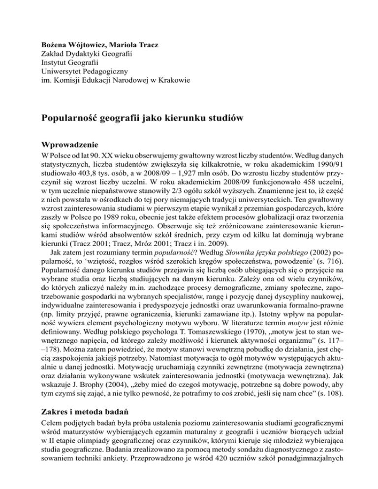 Bożena Wójtowicz, Mariola Tracz Zakład Dydaktyki Geografii Instytut Geografii Uniwersytet Pedagogiczny im. Komisji Edukacji Narodowej w Krakowie Popularność geografii jako kierunku studiów Wprowadzenie W Polsce od lat 90. XX wieku obserwujemy gwałtowny wzrost liczby studentów. Według danych statystycznych, liczba studentów zwiększyła się kilkakrotnie, w roku akademickim 1990/91 studiowało 403,8 tys. osób, a w 2008/09 – 1,927 mln osób. Do wzrostu liczby studentów przyczynił się wzrost liczby uczelni. W roku akademickim 2008/09 funkcjonowało 458 uczelni, w tym uczelnie niepaństwowe stanowiły 2/3 ogółu szkół wyższych. Znamienne jest to, iż część z nich powstała w ośrodkach do tej pory niemających tradycji uniwersyteckich. Ten gwałtowny wzrost zainteresowania studiami w pierwszym etapie wynikał z przemian gospodarczych, które zaszły w Polsce po 1989 roku, obecnie jest także efektem procesów globalizacji oraz tworzenia się społeczeństwa informacyjnego. Obserwuje się też zróżnicowane zainteresowanie kierunkami studiów wśród absolwentów szkół średnich, przy czym od kilku lat dominują wybrane kierunki (Tracz 2001; Tracz, Mróz 2001; Tracz i in. 2009). Jak zatem jest rozumiany termin popularność? Według Słownika języka polskiego (2002) popularność, to ‘wziętość, rozgłos wśród szerokich kręgów społeczeństwa, powodzenie’ (s. 716). Popularność danego kierunku studiów przejawia się liczbą osób ubiegających się o przyjęcie na wybrane studia oraz liczbą studiujących na danym kierunku. Zależy ona od wielu czynników, do których zaliczyć należy m.in. zachodzące procesy demograficzne, zmiany społeczne, zapotrzebowanie gospodarki na wybranych specjalistów, rangę i pozycję danej dyscypliny naukowej, indywidualne zainteresowania i predyspozycje jednostki oraz uwarunkowania formalno-prawne (np. limity przyjęć, prawne ograniczenia, kierunki zamawiane itp.). Istotny wpływ na popularność wywiera element psychologiczny motywu wyboru. W literaturze termin motyw jest różnie definiowany. Według polskiego psychologa T. Tomaszewskiego (1970), „motyw jest to stan wewnętrznego napięcia, od którego zależy możliwość i kierunek aktywności organizmu” (s. 117– –178). Można zatem powiedzieć, że motyw stanowi wewnętrzną pobudkę do działania, jest chęcią zaspokojenia jakiejś potrzeby. Natomiast motywacja to ogół motywów występujących aktualnie u danej jednostki. Motywację uruchamiają czynniki zewnętrzne (motywacja zewnętrzna) oraz działania wykonywane wskutek zainteresowania jednostki (motywacja wewnętrzna). Jak wskazuje J. Brophy (2004), „żeby mieć do czegoś motywację, potrzebne są dobre powody, aby tym czymś się zająć, a nie tylko pewność, że potrafimy to coś zrobić, jeśli się nam chce” (s. 108). Zakres i metoda badań Celem podjętych badań była próba ustalenia poziomu zainteresowania studiami geograficznymi wśród maturzystów wybierających egzamin maturalny z geografii i uczniów biorących udział w II etapie olimpiady geograficznej oraz czynników, którymi kieruje się młodzież wybierająca studia geograficzne. Badania zrealizowano za pomocą metody sondażu diagnostycznego z zastosowaniem techniki ankiety. Przeprowadzono je wśród 420 uczniów szkół ponadgimnazjalnych Popularność geografii jako kierunku studiów 89 – zdających geografię na maturze w 2010 roku w 4 województwach: małopolskim, podkarpackim, świętokrzyskim i pomorskim oraz wśród 150 uczestników 2 etapu olimpiady geograficznej (rejonowej) w okręgu katowickim i krakowskim. W badaniach posłużono się kwestionariuszem ankiety, który zawierał 19 pytań pogrupowanych w 3 główne zagadnienia: informacje dotyczące ankietowanej osoby, zainteresowania geografią i dalsze plany związane ze studiami. Badaniami diagnostycznymi objęto także studentów, łącznie 240 osób, z kilku ośrodków akademickich kształcących geografów (Uniwersytet Jagielloński, Uniwersytet Warszawski, Uniwersytet Marii Curie-Skłodowskiej, Uniwersytet Pedagogiczny, Uniwersytet im. Jana Kochanowskiego, Akademia Pomorska). W badanej grupie kobiety stanowiły 62,5%, a mężczyźni 39,5%. Respondentami byli studenci 3 roku studiów licencjackich (85,5% stacjonarnych), 5-letnich magisterskich (8,9%) i studiów II stopnia – magisterskich (5,6%). W celu zebrania materiału empirycznego posłużono się kwestionariuszem ankiety, który miał za zadanie dostarczyć danych na temat motywów wyboru geografii jako kierunku studiów i jej popularności. Kwestionariusz zawierał 17 pytań pogrupowanych w 4 grupy tematyczne. Wśród pytań były pytania zamknięte (12) i otwarte, w których ankietowani mieli możliwość samodzielnego udzielenia odpowiedzi (5). Zaprezentowane w ankiecie pytania uporządkowano w następujące grupy tematyczne: zainteresowania geografią w szkole średniej, motyw wyboru studiów geograficznych, a także opinia ankietowanych o jakości kształcenia (kadra naukowa, baza dydaktyczna, zasoby biblioteki geograficznej i zbiory kartograficzne) i oceny opanowania wybranych umiejętności w czasie studiów geograficznych oraz dalszych planów zawodowych. Ryc. 1. Struktura płci ankietowanych studentów geografii według uczelni (w %) Źródło: opracowanie własne. W niniejszym opracowaniu zdecydowano się na zeprezentowanie wybranych wyników, tj. tych, które uznano za szczególnie ważne z punktu widzenia poruszanej problematyki. Liczba studentów geografii na tle ogólnej liczby studentów w kraju i popularnych kierunków studiów Liczba kandydatów ubiegających się o przyjęcie na dany kierunek studiów jest po części wyrazem popularności danej dyscypliny i odzwierciedleniem zapotrzebowania rynku na specja- 90 bożena wójtowicz, mariola tracz listów tego kierunku. Należy jednak zauważyć, iż na liczbę kandydatów mają także wpływ uwarunkowania formalne, np.: limity przy
