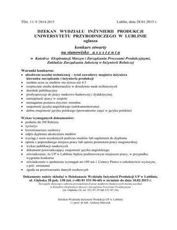 TDz. 11/ 9 /2014-2015 Lublin, dnia 28.01.2015 r. DZEKAN WYDZIAŁU INŻYNIERII PRODUKCJI UNIWERSYTETU PRZYRODNICZEGO W LUBLINIE ogłasza konkurs otwarty na stanowisko a s y s t e n t a w Katedrze Eksploatacji Maszyn i Zarządzania Procesami Produkcyjnymi, Zakładzie Zarządzania Jakością w Inżynierii Rolniczej Warunki konkursu: absolwent uczelni technicznej – tytuł zawodowy magistra inżyniera kierunku zarządzanie i inżynieria produkcji średnia ocen ze studiów nie niższa niż 4,5 rozpoczęte studia doktoranckie w dziedzinie nauk technicznych dorobek publikacyjny predyspozycje do pracy naukowo-badawczej i dydaktycznej umiejętność pracy w zespole nienaganna postawa etyczno–moralna znajomość języka angielskiego (udokumentowana) dobra znajomość języka polskiego (prowadzenie zajęć w języku polskim) Wykaz wymaganych dokumentów: podanie do JM Rektora życiorys kwestionariusz osobowy odpis dyplomu ukończenia studiów wyciąg z ocen uzyskanych podczas studiów lub suplement do dyplomu opinia z poprzedniego miejsca pracy lub opinia promotora pracy magisterskiej wykaz publikacji naukowych dokument poświadczający znajomość języka angielskiego oświadczenie, że UP w Lublinie będzie podstawowym miejscem pracy, w przypadku wygrania konkursu oświadczenie o spełnieniu wymagań art.109 ust.1 Ustawy Prawo o szkolnictwie wyższym, z póź. zmianami zgoda na przetwarzanie danych osobowych Dokumenty należy składać w Dziekanacie Wydziału Inżynierii Produkcji UP w Lublinie, ul. Głęboka 28 pok. 138 (tel. (+48) 81 531-96-60) w terminie do dnia 10.02.2015 r. Szczegóły dotyczące zakresu prowadzonych prac naukowo-badawczych można uzyskać w Katedrze Eksploatacji Maszyn i Zarządzania Procesami Produkcyjnymi (ul. Głęboka 28, tel. 531-97-35 lub 531-97-34). Dziekan Wydziału Inżynierii Produkcji UP w Lublinie (-) prof. dr hab. Andrzej Marczuk