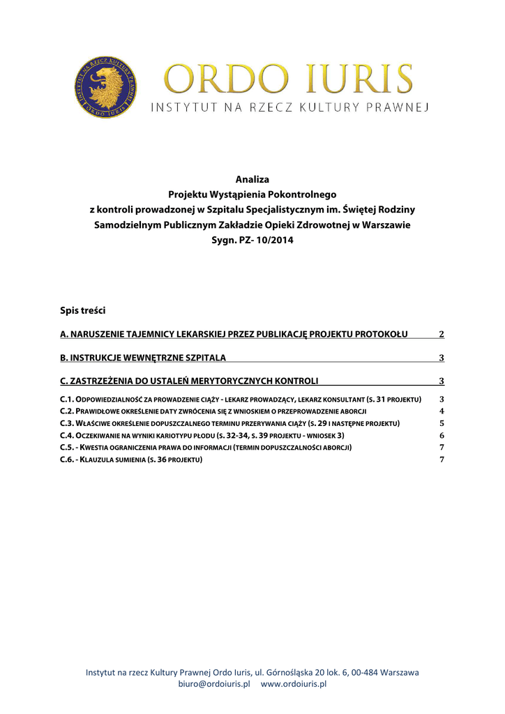Analiza Projektu Wystąpienia Pokontrolnego z kontroli prowadzonej w Szpitalu Specjalistycznym im. Świętej Rodziny Samodzielnym Publicznym Zakładzie Opieki Zdrowotnej w Warszawie Sygn. PZ- 10/2014 Spis treści A. NARUSZENIE TAJEMNICY LEKARSKIEJ PRZEZ PUBLIKACJĘ PROJEKTU PROTOKOŁU 2 B. INSTRUKCJE WEWNĘTRZNE SZPITALA 3 C. ZASTRZEŻENIA DO USTALEŃ MERYTORYCZNYCH KONTROLI 3 C.1. ODPOWIEDZIALNOŚĆ ZA PROWADZENIE CIĄŻY - LEKARZ PROWADZĄCY, LEKARZ KONSULTANT (S. 31 PROJEKTU) C.2. PRAWIDŁOWE OKREŚLENIE DATY ZWRÓCENIA SIĘ Z WNIOSKIEM O PRZEPROWADZENIE ABORCJI C.3. WŁAŚCIWE OKREŚLENIE DOPUSZCZALNEGO TERMINU PRZERYWANIA CIĄŻY (S. 29 I NASTĘPNE PROJEKTU) C.4. OCZEKIWANIE NA WYNIKI KARIOTYPU PŁODU (S. 32-34, S. 39 PROJEKTU - WNIOSEK 3) C.5. - KWESTIA OGRANICZENIA PRAWA DO INFORMACJI (TERMIN DOPUSZCZALNOŚCI ABORCJI) C.6. - KLAUZULA SUMIENIA (S. 36 PROJEKTU) 3 4 5 6 7 7 Instytut na rzecz Kultury Prawnej Ordo Iuris, ul. Górnośląska 20 lok. 6, 00-484 Warszawa [email protected] www.ordoiuris.pl A. Naruszenie tajemnicy lekarskiej przez publikację projektu protokołu Na podstawie art. 40 ustawy o zawodzie lekarza i lekarza dentysty (Dz.U. 2011, Nr 277, poz. 1634 ze zm.), art. 14 ustawy o prawach pacjenta i Rzeczniku Praw Pacjenta (Dz.U. 2009, Nr 52, poz. 417 ze zm.), stosownie do art. 23 Kodeksu Etyki Lekarskiej, lekarze udzielający odpowiedzi w toku kontroli zobowiązani są do zachowania w tajemnicy informacji związanych z pacjentem, a uzyskanych w związku z wykonywaniem zawodu. Zwolnienie z obowiązku zachowania tajemnicy lekarskiej dotyczy nielicznych sytuacji, w tym postępowania kontrolnego toczącego się w ramach upoważnienia ustawowego. Niezależnie od obowiązków lekarzy, prawo pacjenta (zarówno matki, jak i dziecka) do zachowania w tajemnicy informacji z nim związanych zostało określone w art. 13 ustawy o prawach pacjenta i Rzeczniku Praw Pacjenta. Jednocześnie należy podkreślić, że podmiot kontrolujący (m.st.) nie jest uprawniony do ujawnienia tajemnicy lekarskiej pozyskanej na podstawie ustawowego upoważnienia jedynie w celu realizacji celów i zakresu kontroli. Ujawnienie, w szczególności upublicznienie in extenso wypowiedzi lekarzy składanych w trakcie kontroli stanowi naruszenie tajemnicy lekarskiej oraz prowadzi do ujawnienia tej tajemnicy, co stanowi nie tylko naruszenie praw pacjentów (matki oraz dziecka), ale również może być kwalifikowane jako przestępstwo z art. 266 Kodeksu Karnego. Wskazane zasady znali niewątpliwie autorzy projektu wystąpienia pokontrolnego, opatrując dokument adnotacją „tylko do użytku służbowego” (s. 1). Właściwy poziom ochrony danych pacjentki zapewniło w tym zakresie Ministerstwo Zdrowia, które w odpowiedzi na wniosek pracownika Instytutu Ordo Iuris o udostępnienie informacji publicznej w przedmiocie wyników kontroli przeprowadzonej przez Konsultanta Krajowego d.s. ginekologii w Szpitalu Specjalistycznym im. Św. Rodziny w Warszawie (znak: MZ-DNP-024-21211-2/LS/14) zasadnie dokonało anonimizacji większości treści projektu wystąpienia pokontrolnego oraz odmówiło udostępnienia informacji dotyczącej m.in. ustaleń szczegółowych, wskazując na konieczność ochrony danych osobowych pacjentki i jej prywatności. Ministerstwo Zdrowia wskazało zasadnie, że konieczna jest również anonimizacja (zaczernienie) danych dotyczących procesu diagnostycznoterapeutycznego zastosowanego wobec pacjentki, bowiem udostępnienie tych danych mogłoby umożliwić jej identyfikację, cytując przy tym wyrok Sądu Najwyższego z 8.11.2012r. (sygn. akt I CSK 190/12) do sfery życia prywatnego zalicza się przede wszystkim zdarzenia i okoliczności tworzące sferę życia osobistego i rodzinnego. Szczególny charakter tej dziedziny życia człowieka uzasadnia udzielenie jej silnej ochrony prawnej (…) w określonych sytuacjach faktycznych przetworzenie danych osobowych może spowodować naruszenie dobra osobistego w postaci prawa do prywatności. Ponadto Ministerstwo Zdrowia wskazało, że zgodnie z treścią art. 23 ust. 2 ustawy o prawach pacjenta i Rzeczniku Praw Pacjenta, ochronie podlegają wszelkie dane zawarte w dokumentacji medycznej, w tym Instytut na rzecz Kultury Prawnej Ordo Iuris, ul. Górnośląska 20 lok. 6, 00-484 Warszawa [email protected] www.ordoiuris.pl również dane związane ze stanem zdrowia pacjenta oraz dotyczące udzielonych pacjentowi świadczeń zdrowotnych. Mając powyższe na uwadze, zasadny jest wniosek o ustalenie przez Prezydenta m.st. Warszawy osób odpowiedzialnych za ujawnienie danych zawartych w dokumentacji medycznej Pacjentki oraz ujawnienie tajemnicy lekarskiej przez upublicznienie projektu wystąpienia pokontrolnego, zawierającego szczegółowy opis procesu diagnostycznoterapeutycznego i udzielonych świadczeń medycznych oraz innych informacji związanych z pacjentami, które nie zostały wcześniej ujawnione publicznie, a które pozwalają nieokreślonej grupie osób na ustalenie danych osobowych pacjentów i przypisanie do nich informacji dotyczących ich zdrowia i udzielanych im świadczeń medycznych. B. Instrukcje wewnętrzne Szpitala Stwierdzenie, że wewnętrzne regulaminy Szpitala odwołują się do nieistniejących dokumentów (konferencja prasowa z 9.07.2014) jest bezzasadne. Jak wynika z informacji uzyskanej od Szpitala, od chwili wejścia w życie ustawy o działalności leczniczej (2012) rolę regulaminu porządkowego m.in. w zakresie określenia przebiegu procesu udzielania świadczeń zdrowotnych z zapewnieniem właściwej dostępności i jakości tych świadczeń (art. 18a pkt. 1a. 1 uchylonej Ustawy o zakładach opieki zdrowotnej) przejął regulamin organizacyjny (art. 24 Ustawy o działalności leczniczej). Należy jednak pokreślić, że poza formalną zmianą nazwy dokumentu nadrzędnego treść samych zapisów w procedurze nie uległa zmianie pod względem merytorycznym. Powyższe wyjaśnienie naszym zdaniem powinno znaleźć się z protokole
