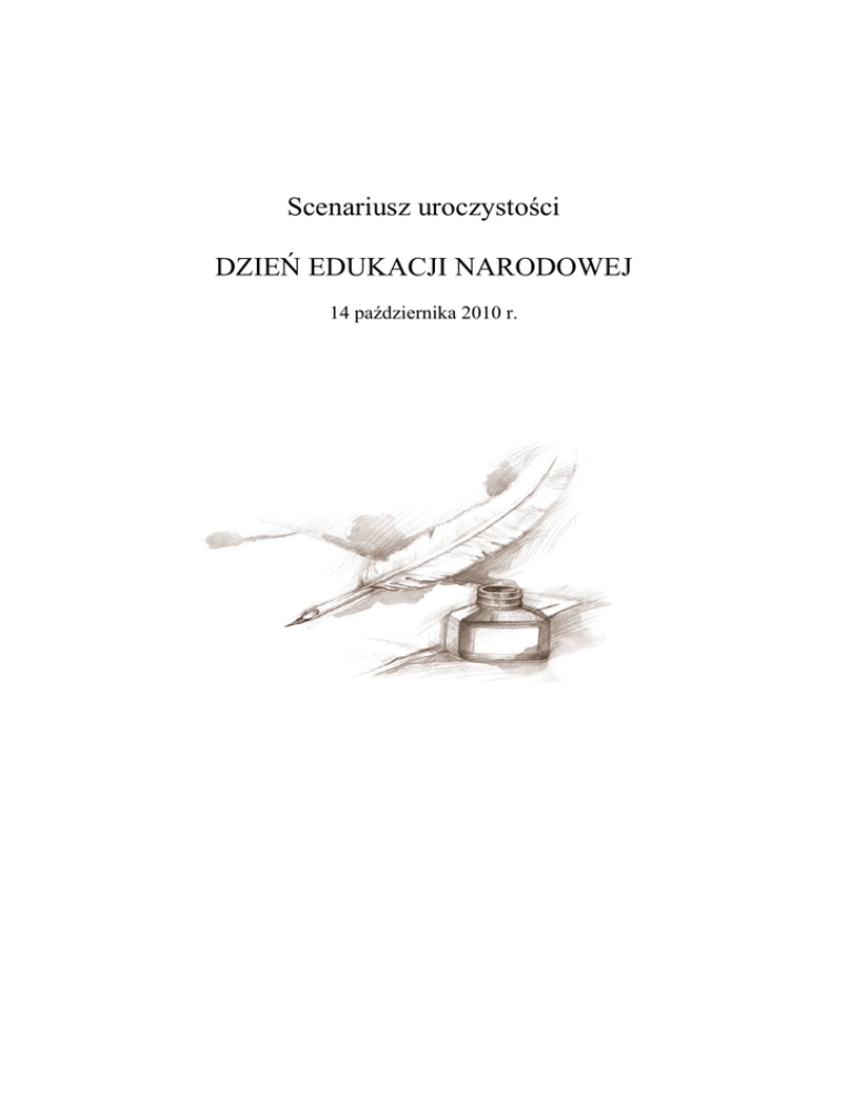 Scenariusz uroczystości DZIEŃ EDUKACJI NARODOWEJ 14 października 2010 r. PRZEBIEG UROCZYSTOŚCI: PROWADZĄCA-DOROTA W imieniu Samorządu Szkolnego mam zaszczyt przywitać na dzisiejszej uroczystości zaproszonych gości, dyrekcję, nauczycieli, rodziców, pracowników administracji oraz uczniów. Spotykamy się dziś, aby choć raz w roku podziękować naszym nauczycielom za ich trud i wysiłek włożony w nauczanie i wychowanie. Nasze gorące, płynące z serca życzenia wyrazimy poprzez taniec, piosenki, wiersze. Proszę teraz Panią Dyrektor Beatę Brzostek o zabranie głosu. Powitanie zebranych gości przez Panią Dyrektor Beatę Brzostek. MAŁGOSIA Jeszcze troszeczkę lata I już- troszeczkę jesieni. Jeszcze zielenią się liście, Lecz kilka się już czerwieni. Pożegnaliśmy bociany I w lesie coraz ciszej. Tylko leszczyna szeleści, Bo do niej rudy gość przyszedł. Dojrzały sady, a pola W skibach zaoranej ziemi. Jeszcze troszeczkę lata Na powitanie jesieni. PROWADZĄCA-DOROTA Wspomnijmy w tym jesiennym świątecznym dniu niedawno minione lato. Przed Państwem Klaudia Szpilska wraz zespołem AKORD zaśpiewa piosenkę „Tyle słońca w całym mieście” 1. Piosenka „Tyle słońca w całym mieście” PROWADZĄCA-DOROTA Dzieci z kółka recytatorskiego „Rytm” prowadzonego przez p. Teresę Sucharę przedstawią Państwu bukiet życzeń wierszem pisany. Jako pierwsza wystąpi przed nami Anita Lisicka. KASIA Wysłuchajmy teraz wiersza pod tytułem „Kwiaty dla naszej Pani” w wykonaniu Iwonki Szpilskiej. KASIA W czas złotej jesieni To święto przypada Gdy wśród drzew podcieni Grad kasztanów spada. Kiedy liście z wiatrem Tańczą bossanowę, A świt wiesza mokre mgły październikowe. KASIA Grupa taneczna ZODIAK pod kierunkiem p. Elżbiety Marczak zaprezentuje układ taneczny „Taniec jesiennych liści”. PROWADZĄCA-DOROTA Dla Was drodzy goście mamy serdeczne życzenia: zdrowia, wszelkiej pomyślności oraz uśmiechu i wiele radości. A oto specjalnie dla Was wiersz w wykonaniu Adriana Szczuczyńskiego, aktora Koła Teatralnego. Tak niedawno świętowaliśmy uroczyste nadanie imienia naszemu Ośrodkowi. Może nie wszyscy wiedzą, że od czerwca nosimy imię Kawalerów Orderu Uśmiechu, naszym symbolem jest słoneczko. Wysłuchajmy piosenki „Słoneczko uśmiechnij się” w wykonaniu K.Szpilskej wraz z zespołem AKORD. PASOWANIE PROWADZĄCA-DOROTA Szczególnie serdecznie pragniemy przywitać uczniów, którzy niedawno przekroczyli po raz pierwszy próg naszej szkoły. A są to: 1. 2. 3. 4. 5. 6. 7. 8. Kamil Kwaśnik Tomasz Urbański Przemysław Bandolko Michał Haus Iwona Szpilska Andżelika Szpilska Krzysztof Murawski Dorota Mikołajczyk WIOLA Od pierwszego września tworzycie wraz z nami wielką szkolną rodzinę. Wiecie, że w rodzinie każdy obok praw ma także obowiązki, które powinien solidnie wypełniać. Naszym wspólnym obowiązkiem jest pilna nauka. My starsi koledzy podamy wam pomocną dłoń. Uśmiechajcie się, bo w naszej szkole jest bezpiecznie i radośnie. Cieszymy się, że powiększyła się nasza szkolna rodzina. Jeszcze raz serdecznie witamy ! KASIA Kiedy smutny jesteś czasem I samotność Ci doskwiera My cię zawsze pocieszym, Tutaj znajdziesz przyjaciela PROWADZĄCA-DOROTA Wysłuchajmy piosenki o przyjaźni „Najlepiej razem” Zapraszamy na środek naszych nowych uczniów: 1. Kamil Kwaśnik 2. Tomasz Urbański 3. 4. 5. 6. 7. 8. Przemysław Bandolko Michał Haus Iwona Szpilska Andżelika Szpilska Krzysztof Murawski Dorota Mikołajczyk PROWADZĄCA-DOROTA Prosimy Panią Dyrektor Beatę Brzostek o dokonanie uroczystego ślubowania i pasowania nowych wychowanków na uczniów. Ślubuję uroczyście: a. wypełniać sumiennie obowiązki ucznia b. c. d. e. uczyć się pilnie i być dobrym kolegą dbać o dobre imię swojej klasy i szkoły dawać powody do dumy swoim nauczycielom i rodzicom swoim zachowaniem i nauką sprawiać im radość Ślubujemy ! (wszyscy uczniowie) (Pani Dyrektor dokonuje pasowania uczniów i wręcza im upominki) 3.Wręczenie wyróżnień i nagród pracownikom Ośrodka. PROWADZĄCA - DOROTA Dziękujemy wszystkim za udział w naszej uroczystości i serdecznie zapraszamy na poczęstunek. Opracowała: Małgorzata Tyszkiewicz