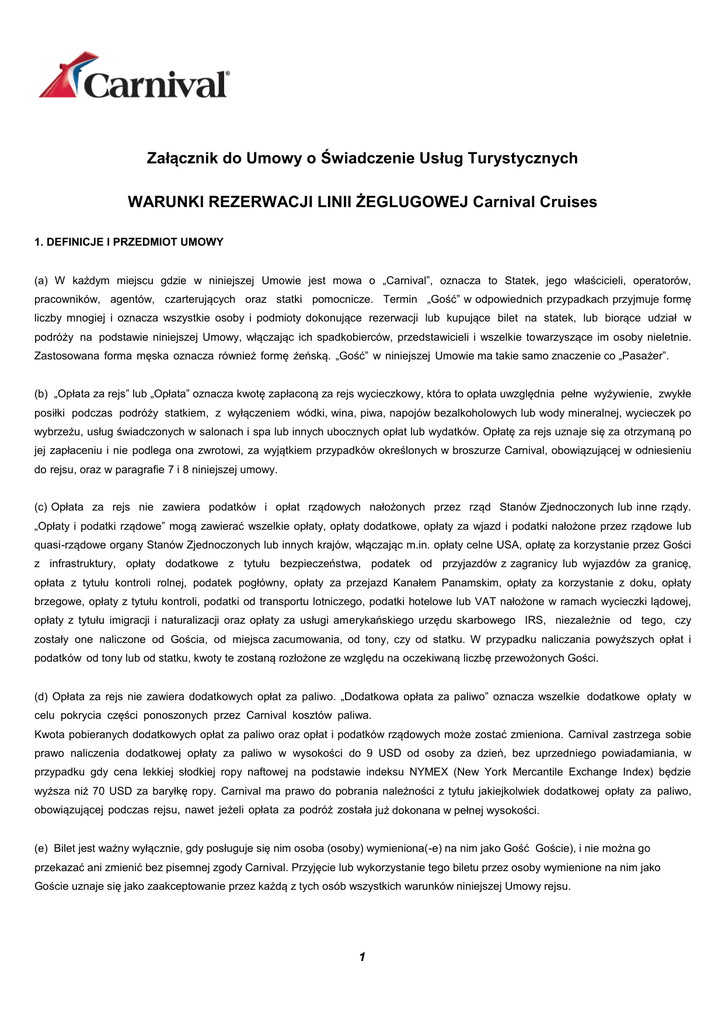 Załącznik do Umowy o Świadczenie Usług Turystycznych WARUNKI REZERWACJI LINII ŻEGLUGOWEJ Carnival Cruises 1. DEFINICJE I PRZEDMIOT UMOWY (a) W każdym miejscu gdzie w niniejszej Umowie jest mowa o „Carnival”, oznacza to Statek, jego właścicieli, operatorów, pracowników, agentów, czarterujących oraz statki pomocnicze. Termin „Gość” w odpowiednich przypadkach przyjmuje formę liczby mnogiej i oznacza wszystkie osoby i podmioty dokonujące rezerwacji lub kupujące bilet na statek, lub biorące udział w podróży na podstawie niniejszej Umowy, włączając ich spadkobierców, przedstawicieli i wszelkie towarzyszące im osoby nieletnie. Zastosowana forma męska oznacza również formę żeńską. „Gość” w niniejszej Umowie ma takie samo znaczenie co „Pasażer”. (b) „Opłata za rejs” lub „Opłata” oznacza kwotę zapłaconą za rejs wycieczkowy, która to opłata uwzględnia pełne wyżywienie, zwykłe posiłki podczas podróży statkiem, z wyłączeniem wódki, wina, piwa, napojów bezalkoholowych lub wody mineralnej, wycieczek po wybrzeżu, usług świadczonych w salonach i spa lub innych ubocznych opłat lub wydatków. Opłatę za rejs uznaje się za otrzymaną po jej zapłaceniu i nie podlega ona zwrotowi, za wyjątkiem przypadków określonych w broszurze Carnival, obowiązującej w odniesieniu do rejsu, oraz w paragrafie 7 i 8 niniejszej umowy. (c) Opłata za rejs nie zawiera podatków i opłat rządowych nałożonych przez rząd Stanów Zjednoczonych lub inne rządy. „Opłaty i podatki rządowe” mogą zawierać wszelkie opłaty, opłaty dodatkowe, opłaty za wjazd i podatki nałożone przez rządowe lub quasi-rządowe organy Stanów Zjednoczonych lub innych krajów, włączając m.in. opłaty celne USA, opłatę za korzystanie przez Gości z infrastruktury, opłaty dodatkowe z tytułu bezpieczeństwa, podatek od przyjazdów z zagranicy lub wyjazdów za granicę, opłata z tytułu kontroli rolnej, podatek pogłówny, opłaty za przejazd Kanałem Panamskim, opłaty za korzystanie z doku, opłaty brzegowe, opłaty z tytułu kontroli, podatki od transportu lotniczego, podatki hotelowe lub VAT nałożone w ramach wycieczki lądowej, opłaty z tytułu imigracji i naturalizacji oraz opłaty za usługi amerykańskiego urzędu skarbowego IRS, niezależnie od tego, czy zostały one naliczone od Gościa, od miejsca zacumowania, od tony, czy od statku. W przypadku naliczania powyższych opłat i podatków od tony lub od statku, kwoty te zostaną rozłożone ze względu na oczekiwaną liczbę przewożonych Gości. (d) Opłata za rejs nie zawiera dodatkowych opłat za paliwo. „Dodatkowa opłata za paliwo” oznacza wszelkie dodatkowe opłaty w celu pokrycia części ponoszonych przez Carnival kosztów paliwa. Kwota pobieranych dodatkowych opłat za paliwo oraz opłat i podatków rządowych może zostać zmieniona. Carnival zastrzega sobie prawo naliczenia dodatkowej opłaty za paliwo w wysokości do 9 USD od osoby za dzień, bez uprzedniego powiadamiania, w przypadku gdy cena lekkiej słodkiej ropy naftowej na podstawie indeksu NYMEX (New York Mercantile Exchange Index) będzie wyższa niż 70 USD za baryłkę ropy. Carnival ma prawo do pobrania należności z tytułu jakiejkolwiek dodatkowej opłaty za paliwo, obowiązującej podczas rejsu, nawet jeżeli opłata za podróż została już dokonana w pełnej wysokości. (e) Bilet jest ważny wyłącznie, gdy posługuje się nim osoba (osoby) wymieniona(-e) na nim jako Gość Goście), i nie można go przekazać ani zmienić bez pisemnej zgody Carnival. Przyjęcie lub wykorzystanie tego biletu przez osoby wymienione na nim jako Goście uznaje się jako zaakceptowanie przez każdą z tych osób wszystkich warunków niniejszej Umowy rejsu. 1 (f) Wszelkie prawa, wyłączenia odpowiedzialności, prawa Carnival do obrony i prawa zabezpieczające Carnival przed odpowiedzialnością, wynikające z niniejszej umowy, będą także obowiązywać z korzyścią dla infrastruktury Carnival, zarówno na morzu, jak i na lądzie, obsługi, agentów, kierowników, spółek stowarzyszonych lub powiązanych, dostawców, budowniczych statku, producentów części składowych statku, niezależnych wykonawców, włączając m.in. operatorów wycieczek po wybrzeżu lub innych wycieczek, lekarza pokładowego, pielęgniarki pokładowej, obsługę sklepu detalicznego, personel ds. zdrowia i urody, personel ds. fitnessu, personel odpowiedzialny za dziennik wideo, oraz innych koncesjonariuszy, którzy nie ponoszą żadnej odpowiedzialności względem Gościa, zarówno kontraktowej, jak i deliktowej, w zakresie większym lub innym niż zakres odpowiedzialności Carnival. (g) Niniejsza umowa stanowi całość umowy pomiędzy Carnival a Gościem i zastępuje wszelkie pozostałe umowy, zarówno ustne, jak i pisemne. Wszelkie zmiany jakichkolwiek warunków niniejszej umowy muszą być sporządzone na piśmie i zatwierdzone przez Carnival. Za wyjątkiem przypadków przewidzianych w paragrafie 13 poniżej, jeżeli którykolwiek z przepisów niniejszej umowy będzie sprzeczny z prawem obowiązującym w danej jurysdykcji lub nieważny z mocy prawa obowiązującego w danej jurysdykcji, w której niniejsza umowa ma zostać wyegzekwowana lub zostanie za taką uznana przez właściwy sąd, taki(-e) przepis(-y) uznaje się za usunięty(-e) z Umowy i nieskuteczny(-e), a wszystkie pozostałe przepisy zawarte w Umowie pozostaną w mocy i będą stanowić umowę przewozu. 2. CHARAKTER REJSU I OBOWIĄZKI GOŚCIA (a) Gość potwierdza, że w pełni rozumie naturę Statku i przejmuje na siebie wszelkie ryzyko związane z podróżowaniem i transportem oraz obsługą Gości i ładunku. Na Statku może, ale nie musi, znajdować się lekarz pokładowy lub inny personel medyczny, co zależy od uznania Carnival. Zarówno na morzu, jak i w porcie, dostęp do opieki medycznej może być ograniczony lub opóźniony. Gość przyjmuje do wiadomości, że jego/jej pod