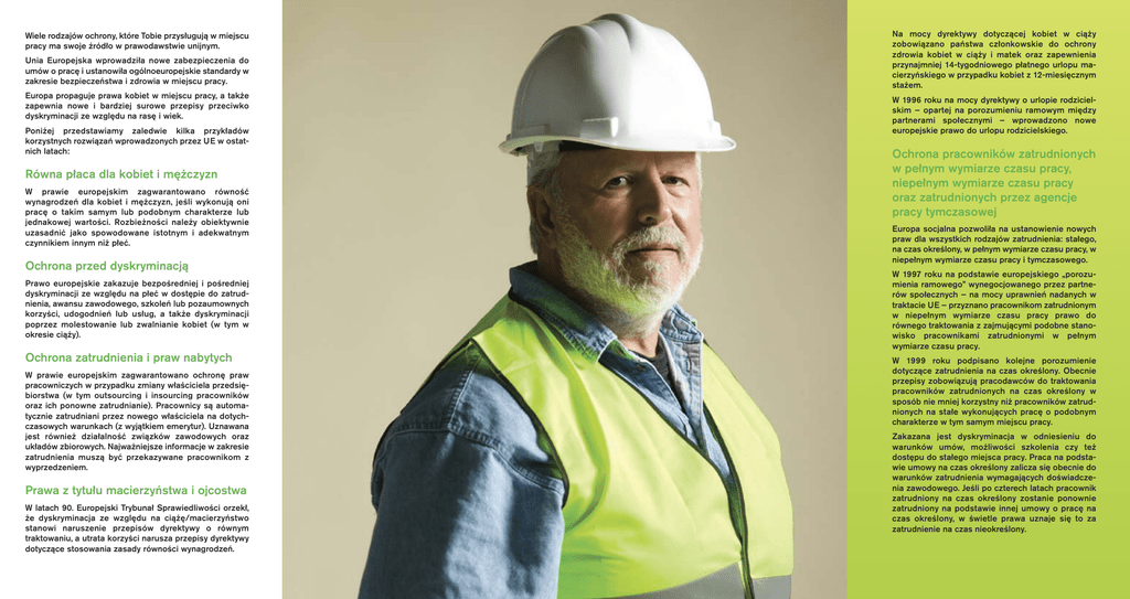 Wiele rodzajów ochrony, które Tobie przysługują w miejscu pracy ma swoje źródło w prawodawstwie unijnym. Unia Europejska wprowadziła nowe zabezpieczenia do umów o pracę i ustanowiła ogólnoeuropejskie standardy w zakresie bezpieczeństwa i zdrowia w miejscu pracy. Europa propaguje prawa kobiet w miejscu pracy, a także zapewnia nowe i bardziej surowe przepisy przeciwko dyskryminacji ze względu na rasę i wiek. Poniżej przedstawiamy zaledwie kilka przykładów korzystnych rozwiązań wprowadzonych przez UE w ostatnich latach: Równa płaca dla kobiet i mężczyzn W prawie europejskim zagwarantowano równość wynagrodzeń dla kobiet i mężczyzn, jeśli wykonują oni pracę o takim samym lub podobnym charakterze lub jednakowej wartości. Rozbieżności należy obiektywnie uzasadnić jako spowodowane istotnym i adekwatnym czynnikiem innym niż płeć. Ochrona przed dyskryminacją Prawo europejskie zakazuje bezpośredniej i pośredniej dyskryminacji ze względu na płeć w dostępie do zatrudnienia, awansu zawodowego, szkoleń lub pozaumownych korzyści, udogodnień lub usług, a także dyskryminacji poprzez molestowanie lub zwalnianie kobiet (w tym w okresie ciąży). Ochrona zatrudnienia i praw nabytych W prawie europejskim zagwarantowano ochronę praw pracowniczych w przypadku zmiany właściciela przedsiębiorstwa (w tym outsourcing i insourcing pracowników oraz ich ponowne zatrudnianie). Pracownicy są automatycznie zatrudniani przez nowego właściciela na dotychczasowych warunkach (z wyjątkiem emerytur). Uznawana jest również działalność związków zawodowych oraz układów zbiorowych. Najważniejsze informacje w zakresie zatrudnienia muszą być przekazywane pracownikom z wyprzedzeniem. Prawa z tytułu macierzyństwa i ojcostwa W latach 90. Europejski Trybunał Sprawiedliwości orzekł, że dyskryminacja ze względu na ciążę/macierzyństwo stanowi naruszenie przepisów dyrektywy o równym traktowaniu, a utrata korzyści narusza przepisy dyrektywy dotyczące stosowania zasady równości wynagrodzeń. Na mocy dyrektywy dotyczącej kobiet w ciąży zobowiązano państwa członkowskie do ochrony zdrowia kobiet w ciąży i matek oraz zapewnienia przynajmniej 14-tygodniowego płatnego urlopu macierzyńskiego w przypadku kobiet z 12-miesięcznym stażem. W 1996 roku na mocy dyrektywy o urlopie rodzicielskim – opartej na porozumieniu ramowym między partnerami społecznymi – wprowadzono nowe europejskie prawo do urlopu rodzicielskiego. Ochrona pracowników zatrudnionych w pełnym wymiarze czasu pracy, niepełnym wymiarze czasu pracy oraz zatrudnionych przez agencje pracy tymczasowej Europa socjalna pozwoliła na ustanowienie nowych praw dla wszystkich rodzajów zatrudnienia: stałego, na czas określony, w pełnym wymiarze czasu pracy, w niepełnym wymiarze czasu pracy i tymczasowego. W 1997 roku na podstawie europejskiego „porozumienia ramowego” wynegocjowanego przez partnerów społecznych – na mocy uprawnień nadanych w traktacie UE – przyznano pracownikom zatrudnionym w niepełnym wymiarze czasu pracy prawo do równego traktowania z zajmującymi podobne stanowisko pracownikami zatrudnionymi w pełnym wymiarze czasu pracy. W 1999 roku podpisano kolejne porozumienie dotyczące zatrudnienia na czas określony. Obecnie przepisy zobowiązują pracodawców do traktowania pracowników zatrudnionych na czas określony w sposób nie mniej korzystny niż pracowników zatrudnionych na stałe wykonujących pracę o podobnym charakterze w tym samym miejscu pracy. Zakazana jest dyskryminacja w odniesieniu do warunków umów, możliwości szkolenia czy też dostępu do stałego miejsca pracy. Praca na podstawie umowy na czas określony zalicza się obecnie do warunków zatrudnienia wymagających doświadczenia zawodowego. Jeśli po czterech latach pracownik zatrudniony na czas określony zostanie ponownie zatrudniony na podstawie innej umowy o pracę na czas określony, w świetle prawa uznaje się to za zatrudnienie na czas nieokreślony. tives de repos par Czas pracy W europejskim prawie zagwarantowano pracownikom: • coroczny, co najmniej czterotygodniowy, płatny urlop; • średni tygodniowy czas pracy nie dłuższy niż 48 godzin; • minimalne przerwy na odpoczynek, jeśli dzień pracy wynosi więcej niż sześć godzin; • 11 godzin nieprzerwanego odpoczynku w każdej dobie; • co najmniej 24 godziny nieprzerwanego odpoczynku w tygodniu, dodatkowo do 11-godzinnej przerwy. Konsultacje z pracownikami Prawo europejskie pozwala dojść do głosu pracownikom. Przepisy dyrektywy o zwolnieniach grupowych zobowiązują do informowania przedstawicieli pracowników i przeprowadzania z nimi konsultacji przed przystąpieniem do zwolnień grupowych. Przepisy dyrektywy o prawach nabytych nakładają na obowiązek przekazania przedstawicielom pracowników kluczowych informacji przed przeniesieniem własności przedsiębiorstwa. Ochrona pracowników delegowanych do innego państwa członkowskiego W Europie socjalnej chronione są prawa wszystkich europejskich pracowników na terenie całej Unii Europejskiej. Dlatego na mocy europejskiej legislacji państwa członkowskie zobowiązały się do usunięcia wymogów związanych z narodowością lub miejscem zamieszkania, które utrudniały tymczasowe oddelegowanie pracowników do pracy w innych państwach członkowskich. Pracodawca powinien zagwarantować delegowanym pracownikom równe traktowanie w odniesieniu do zasadniczych warunków pracy przysługujących pracownikom w państwie członkowskim, do którego pracodawca deleguje swoich pracowników. W swoich orzeczeniach wydanych w 2007 i 2008 roku Europejski Trybunał Sprawiedliwości wskazał na poważne luki prawne w związanej z tym legislacji. Grupa Socjalistyczna w Parlamencie Europejskim, wraz z europejskimi związkami zawodowymi, zainicjowała kampanię o szerokim zasięgu mającą na celu naprawienie tego stanu rzeczy i zapewnienie wydelegowanym pracownikom „równe
