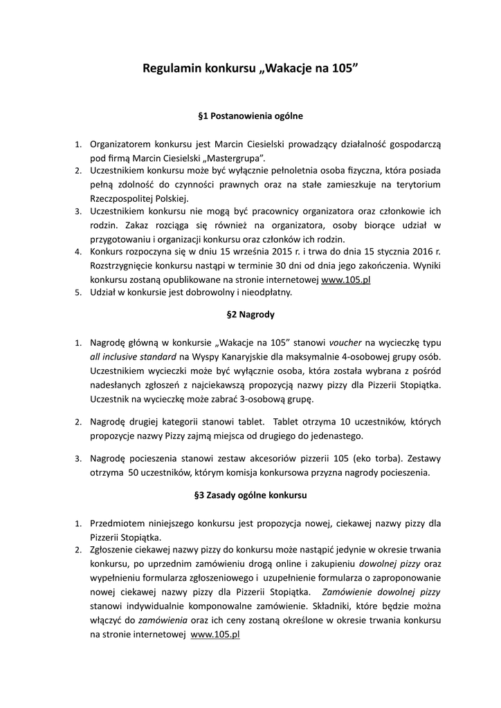 Regulamin konkursu „Wakacje na 105” §1 Postanowienia ogólne 1. Organizatorem konkursu jest Marcin Ciesielski prowadzący działalność gospodarczą pod firmą Marcin Ciesielski „Mastergrupa”. 2. Uczestnikiem konkursu może być wyłącznie pełnoletnia osoba fizyczna, która posiada pełną zdolność do czynności prawnych oraz na stałe zamieszkuje na terytorium Rzeczpospolitej Polskiej. 3. Uczestnikiem konkursu nie mogą być pracownicy organizatora oraz członkowie ich rodzin. Zakaz rozciąga się również na organizatora, osoby biorące udział w przygotowaniu i organizacji konkursu oraz członków ich rodzin. 4. Konkurs rozpoczyna się w dniu 15 września 2015 r. i trwa do dnia 15 stycznia 2016 r. Rozstrzygnięcie konkursu nastąpi w terminie 30 dni od dnia jego zakończenia. Wyniki konkursu zostaną opublikowane na stronie internetowej www.105.pl 5. Udział w konkursie jest dobrowolny i nieodpłatny. §2 Nagrody 1. Nagrodę główną w konkursie „Wakacje na 105” stanowi voucher na wycieczkę typu all inclusive standard na Wyspy Kanaryjskie dla maksymalnie 4-osobowej grupy osób. Uczestnikiem wycieczki może być wyłącznie osoba, która została wybrana z pośród nadesłanych zgłoszeń z najciekawszą propozycją nazwy pizzy dla Pizzerii Stopiątka. Uczestnik na wycieczkę może zabrać 3-osobową grupę. 2. Nagrodę drugiej kategorii stanowi tablet. Tablet otrzyma 10 uczestników, których propozycje nazwy Pizzy zajmą miejsca od drugiego do jedenastego. 3. Nagrodę pocieszenia stanowi zestaw akcesoriów pizzerii 105 (eko torba). Zestawy otrzyma 50 uczestników, którym komisja konkursowa przyzna nagrody pocieszenia. §3 Zasady ogólne konkursu 1. Przedmiotem niniejszego konkursu jest propozycja nowej, ciekawej nazwy pizzy dla Pizzerii Stopiątka. 2. Zgłoszenie ciekawej nazwy pizzy do konkursu może nastąpić jedynie w okresie trwania konkursu, po uprzednim zamówieniu drogą online i zakupieniu dowolnej pizzy oraz wypełnieniu formularza zgłoszeniowego i uzupełnienie formularza o zaproponowanie nowej ciekawej nazwy pizzy dla Pizzerii Stopiątka. Zamówienie dowolnej pizzy stanowi indywidualnie komponowalne zamówienie. Składniki, które będzie można włączyć do zamówienia oraz ich ceny zostaną określone w okresie trwania konkursu na stronie internetowej www.105.pl 3. Formularz zgłoszeniowy powinien być wypełniony w sposób zupełny. Brak 4. 5. 6. jakiegokolwiek elementu lub niezałączenie zaproponowaniej nazwy na nową pizzę spowoduje nieuwzględnienie uczestnictwa w konkursie. Zgłoszenie do konkursu jest dokonane z chwilą odbioru przez organizatora konkursu prawidłowo wypełnionego formularza zgłoszeniowego wraz z załączoną propozycją nowej nazwy pizzy; Jedno zgłoszenie może obejmować jedno zdjęcie. Ta sama osoba fizyczna może dokonać dowolnej liczby zgłoszeń. Każde zgłoszenie musi być poprzedzone dokonaniem zamówienia drogą online i zakupieniu dowolnej pizzy. Uczestnicy dokonują zgłoszeń indywidualnie. 7. 8. Celem niniejszego konkursu jest rozpowszechnianie informacji o firmie i przedmiocie działalności gospodarczej organizatora konkursu oraz popularyzacja produktów dostępnych w Pizzeriach Stopiątka, jak również prezentowanie oferty Pizzerii Stopiątka potencjalnym klientom. §4 Zasady szczegółowe konkursu 1. Uczestnicy, którzy zostaną wytypowani przez komisję konkursową jako laureaci, będą 2. 3. 4. 5. 6. 7. powiadomieni o wygranej na wskazane przy zgłoszeniu adresy e-mailowe oraz telefonicznie. Nagrody zostaną przekazane laureatom osobiście w siedzibie organizatora, w terminie określonym przez organizatora. Laureaci są zobowiązani do pisemnego potwierdzenia odbioru nagród oraz podpisanie umowy w której będą określone warunki wyjazdu. Podpisanie umowy musi nastąpić najpóźniej 30 dni przed wyjazdem. Nie podpisanie umowy przez laureata jest równoznaczne z nieprzyjęciem nagrody. Laureaci konkursu są zobowiązani do przeniesienia autorskich praw majątkowych do zaproponowanej przez siebie nowej ciekawej nazwy pizzy dla Pizzerii Stopiatka na organizatora z zachowaniem formy pisemnej. Nagrody zostaną przekazane z poszanowaniem powszechnie obowiązującego prawa podatkowego. Organizator informuje, że nagrody przyznawane osobom fizycznym w konkursach podlegają obowiązkowej zapłacie zryczałtowanego podatku dochodowego od osób fizycznych w wysokości 10% ich wartości. Zwolnieniu od podatku dochodowego podlega wartość wygranych w konkursach i grach organizowanych i ogłaszanych przez środki masowego przekazu (prasa, radio i telewizja) oraz konkursach z dziedziny nauki, kultury, sztuki, dziennikarstwa i sportu, a także nagród związanych ze sprzedażą premiową - jeżeli jednorazowa wartość tych wygranych lub nagród nie przekracza kwoty 760 zł. Najpóźniej w chwili odbioru nagrody, laureat zobowiązany jest podać organizatorowi dane niezbędne do złożenia deklaracji dla celów podatkowych. W wypadku nieprzyjęcia nagrody przez laureata, organizator wybierze nowego laureata. Ta sama sytuacja nastąpi w wypadku niestawienia się laureata po odbiór nagrody lub odmowy przeniesienia autorskich praw majątkowych na organizatora. §5 Warunki techniczne konkursu 1. Aby wziąć udział w konkursie, należy podczas składania zamówienia na dowolną pizzę poprzez zamówienia online na stronie www.105.pl, należy w rubryce: „Weź udział w konkursie” wpisać propozycję nowej ciekawej nazwy pizzy. §6 Komisja konkursowa 1. Konkurs „Wakacje na 105” zostanie rozstrzygnięty przez trzyosobową komisję 2. 3. 4. 5. konkursową, w której skład wejdą osoby wskazane przez organizatora. Przy rozstrzyganiu konkursu komisja konkursowa kieruje się kryteriami estetyki, kreatywności oraz oryginalności. Komisja konkursowa podejmuje decyzje większością głosów w obecności wszystkich jej członków. Organizator jest uprawniony do dokonywania zmian w składzie komisji konkursowej w 
