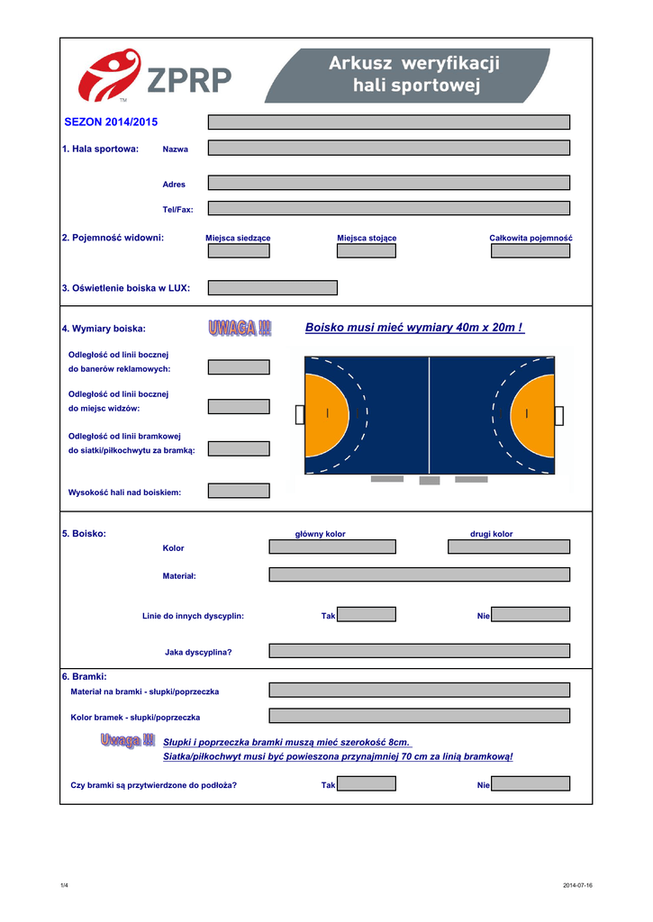 SEZON 2014/2015 1. Hala sportowa: Nazwa Adres Tel/Fax: 2. Pojemność widowni: Miejsca siedzące Miejsca stojące Całkowita pojemność 3. Oświetlenie boiska w LUX: Boisko musi mieć wymiary 40m x 20m ! 4. Wymiary boiska: Odległość od linii bocznej do banerów reklamowych: Odległość od linii bocznej do miejsc widzów: Odległość od linii bramkowej do siatki/piłkochwytu za bramką: Wysokość hali nad boiskiem: główny kolor 5. Boisko: drugi kolor Kolor Materiał: Linie do innych dyscyplin: Tak Nie Jaka dyscyplina? 6. Bramki: Materiał na bramki - słupki/poprzeczka Kolor bramek - słupki/poprzeczka Słupki i poprzeczka bramki muszą mieć szerokość 8cm. Siatka/piłkochwyt musi być powieszona przynajmniej 70 cm za linią bramkową! Czy bramki są przytwierdzone do podłoża? 1/4 Tak Nie 2014-07-16 7. Strefa zmian: musi być 16 miejsc musi być 16 miejsc Stolik 8. Jaki rodzaj zegara boiskowego jest zainstalowany w hali (analogowy/cyfrowy)? Ile tablic z wynikami znajduje się w hali? Gdzie są usytuowane? Jakich są rozmiarów? (.. x .. m)? W przypadku, gdy w hali dostępna jest tylko jedna tablica wyników nie może się ona znajdować z tyłu za strefami zmian Gdzie znajduje się miejsce dla spikera? Przy stoliku sędziów w innym miejscu Ilość pomieszczeń dla drużyny: 9. Szatnie: Każdy zespół musi posiadać własną szatnię! Wymiary: X Sanitariaty i prysznic: Tak Nie (Czy znajdują się w szatni?) Tak Nie Dostępne wyposażenie do masażu: Tak Nie Tak Nie Czy jest bezpośrednie wyjście z szatni na boisko? 10. Szatnie dla sędziów: Wymiary: X Sanitariaty i prysznic: Tak Nie (Czy znajdują się w szatni?) Tak Nie Stół i krzesła: Tak Nie 11. Pomieszczenie dla kontroli antydopingowej: (Rozgrywki Pucharów Europejskich podlegają przepisom antydopingowym) Czy znajduje się pomieszczenie do kontroli antydopingowej wyposażone w sanitariaty? Tak Wymiary: Nie X 12. Temperatura: Czy jest zapewnione, że temperatura w hali podczas treningów i meczu wynosi 2/4 minimum 16°C? Tak Nie Czy w hali dostępna jest klimatyzacja? Tak Nie 2014-07-16 13. Serwis medyczny: Czy dostępne są nosze ? Tak Nie Tak Nie Czy standardem jest, że w hali znajduje się zespół medyczny? 14. Serwis prasowy: Ile jest dostępnych w hali miejsc pracy Ilość miejsc: dla prasy? Gdzie jest możliwy dostęp do Tel/Fax/Internet ? Przy miejscach dla prasy Tak Nie W specjalnym pomieszczeniu Tak Nie Tak Nie Czy jest oddzielne pomieszczenie dla konferencji prasowej? Gdzie jest miejsce dla fotografów w czasie meczu? 15. Bandy reklamowe w hali: Jaki system jest używany? Stałe bandy Bandy obrotowe Bandy elektroniczne Wysokość: Wymiary band: Długość (całkowita długość w m - wzdłuż linii bocznej Długość (całkowita długość w m - wzdłuż linii bramkowej) 16. Reklamy na podłodze w hali sportowej: Czy na boisku znajdują się stałe kolorowe pola Tak Ile ? (na przykład: inne sporty, logo sponsorów, kolorowe Nie pola bramkowe,etc.) Czy posiadasz ważny kontrakt sponsorski na miejsca w polu bramkowym na nowy sezon? Tak Sezon 2014 / 2015 Partner Nie 17. Miejsca parkingowe wokół hali: Tak Nie Ile jest dostępnych miejsc parkingowych? 18. Czy w hali dostępne są pomieszczenia do spotkań/biurowe? 3/4 Pomieszczenia do spotkań: Tak Ilość Nie Biura: Tak Ilość Nie 2014-07-16 ! Ochrona ! 19. Ochrona: Ile osób z ochrony jest obecnych w czasie zawodów ? Zawsze, gdy pokazany jest symbol aparatu należy wykonać zdjęcia. Proszę sprawdzić czy załączono zdjęcia, gdy zwracany jest wypełniony formularz hali! Zdjęcia szczegółowe: 1) Hala sportowa Widok budynku z zewnątrz (1 zdjęcie) 2) 6 zdjęć ze środka boiska w różnych kierunkach (zobacz grafikę) 3) Ogólny widok całego boiska (1 zdjęcie) 4) Zdjęcie całej strefy zmian (1 zdjęcie) 5) Zdjęcia szatni i sanitariatów (1-3 zdjęć) wypełnia WZPR Data weryfikacji hali sportowej przez WZPR: Skład Komisji Weryfikacyjnej WZPR: podpis 1. 2. 3. Decyzja Komisji Weryfikacyjnej WZPR: Miejscowość i data: pieczątka WZPR pieczątka imienna i podpis pieczątka ZPRP pieczątka imienna i podpis wypełnia KOL ZPRP Data weryfikacji hali sportowej przez KOL ZPRP: Decyzja KOL ZPRP: Miejscowość i data: 4/4 WARSZAWA, 2014-07-16