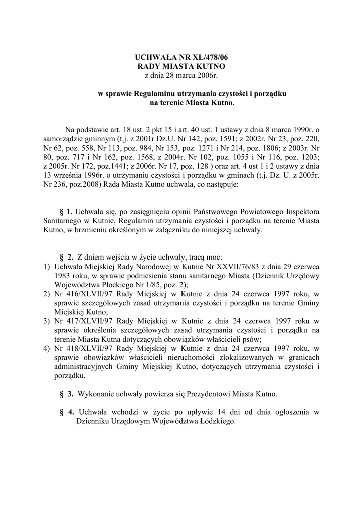 UCHWAŁA NR XL/478/06 RADY MIASTA KUTNO z dnia 28 marca 2006r. w sprawie Regulaminu utrzymania czystości i porządku na terenie Miasta Kutno. Na podstawie art. 18 ust. 2 pkt 15 i art. 40 ust. 1 ustawy z dnia 8 marca 1990r. o samorządzie gminnym (t.j. z 2001r Dz.U. Nr 142, poz. 1591; z 2002r. Nr 23, poz. 220, Nr 62, poz. 558, Nr 113, poz. 984, Nr 153, poz. 1271 i Nr 214, poz. 1806; z 2003r. Nr 80, poz. 717 i Nr 162, poz. 1568, z 2004r. Nr 102, poz. 1055 i Nr 116, poz. 1203; z 2005r. Nr 172, poz.1441; z 2006r. Nr 17, poz. 128 ) oraz art. 4 ust 1 i 2 ustawy z dnia 13 września 1996r. o utrzymaniu czystości i porządku w gminach (t.j. Dz. U. z 2005r. Nr 236, poz.2008) Rada Miasta Kutno uchwala, co następuje: § 1. Uchwala się, po zasięgnięciu opinii Państwowego Powiatowego Inspektora Sanitarnego w Kutnie, Regulamin utrzymania czystości i porządku na terenie Miasta Kutno, w brzmieniu określonym w załączniku do niniejszej uchwały. 1) 2) 3) 4) § 2. Z dniem wejścia w życie uchwały, tracą moc: Uchwała Miejskiej Rady Narodowej w Kutnie Nr XXVII/76/83 z dnia 29 czerwca 1983 roku, w sprawie podniesienia stanu sanitarnego Miasta (Dziennik Urzędowy Województwa Płockiego Nr 1/85, poz. 2); Nr 416/XLVII/97 Rady Miejskiej w Kutnie z dnia 24 czerwca 1997 roku, w sprawie szczegółowych zasad utrzymania czystości i porządku na terenie Gminy Miejskiej Kutno; Nr 417/XLVII/97 Rady Miejskiej w Kutnie z dnia 24 czerwca 1997 roku w sprawie określenia szczegółowych zasad utrzymania czystości i porządku na terenie Miasta Kutna dotyczących obowiązków właścicieli psów; Nr 418/XLVII/97 Rady Miejskiej w Kutnie z dnia 24 czerwca 1997 roku, w sprawie obowiązków właścicieli nieruchomości zlokalizowanych w granicach administracyjnych Gminy Miejskiej Kutno, dotyczących utrzymania czystości i porządku. § 3. Wykonanie uchwały powierza się Prezydentowi Miasta Kutno. § 4. Uchwała wchodzi w życie po upływie 14 dni od dnia ogłoszenia w Dzienniku Urzędowym Województwa Łódzkiego. Załącznik do uchwały Nr XL/478/06 Rady Miasta Kutno z 28.03.06r REGULAMIN UTRZYMANIA CZYSTOŚCI I PORZĄDKU NA TERENIE MIASTA KUTNO Rozdział I Postanowienia ogólne § 1. Regulamin utrzymania czystości i porządku na terenie Miasta Kutno, zwany dalej „Regulaminem” określa szczegółowe zasady dotyczące: 1) wymagań w zakresie utrzymania czystości i porządku na terenie nieruchomości obejmujących: a) prowadzenie we wskazanym zakresie selektywnego zbierania i odbierania odpadów komunalnych, w tym powstających w gospodarstwach domowych, odpadów niebezpiecznych, odpadów wielkogabarytowych i odpadów z remontów, b) uprzątanie błota, śniegu, lodu i innych zanieczyszczeń z części nieruchomości służących do użytku publicznego, c) mycie i naprawy pojazdów samochodowych poza myjniami i warsztatami naprawczymi, 2) rodzaju i minimalnej pojemności urządzeń przeznaczonych do zbierania odpadów komunalnych na terenie nieruchomości oraz na drogach publicznych, warunków rozmieszczania tych urządzeń i ich utrzymania w odpowiednim stanie sanitarnym, porządkowym i technicznym, przy uwzględnieniu: a) średniej ilości odpadów komunalnych wytwarzanych w gospodarstwach domowych bądź w innych źródłach, b) liczby osób korzystających z tych urządzeń, 3) częstotliwości i sposobu pozbywania się odpadów komunalnych i nieczystości ciekłych z terenu nieruchomości oraz z terenów przeznaczonych do użytku publicznego; 4) maksymalnego poziomu odpadów komunalnych ulegających biodegradacji dopuszczonych do składowania na składowiskach odpadów; 5) innych wymagań wynikających z gminnego planu gospodarki odpadami; 6) obowiązków osób utrzymujących zwierzęta domowe, mających na celu ochronę przed zagrożeniem lub uciążliwością dla ludzi oraz przed zanieczyszczeniem terenów przeznaczonych do wspólnego użytku; 7) wymagań utrzymywania zwierząt gospodarskich na terenach wyłączonych z produkcji rolniczej, w tym także zakazu ich utrzymywania na określonych obszarach lub w poszczególnych nieruchomościach; 8) wyznaczania obszarów podlegających obowiązkowej deratyzacji i terminów jej przeprowadzania. § 2. Ilekroć w Regulaminie jest mowa o: 1) firmach wywozowych – rozumie się przez to przedsiębiorców posiadających wydane przez Prezydenta Miasta zezwolenia na wykonywanie usług związanych z odbiorem i transportem odpadów komunalnych, odpadów wielkogabarytowych, odpadów gromadzonych selektywnie, odpadów roślinnych lub/i opróżnianiem zbiorników bezodpływowych i transportem nieczystości ciekłych; 2) nieczystościach ciekłych – rozumie się przez to ścieki gromadzone przejściowo w zbiornikach bezodpływowych; 3) odpadach komunalnych – rozumie się przez to odpady powstające w gospodarstwach domowych a także odpady niezawierające odpadów niebezpiecznych pochodzące od innych wytwórców odpadów, które ze względu na swój charakter lub skład są podobne do odpadów powstających w gospodarstwach domowych, zbierane do typowych pojemników; 4) odpadach niebezpiecznych - rozumie się przez to odpady, zaliczane do tej grupy zgodnie z ustawą o odpadach; 5) odpadach roślinnych – rozumie się przez to odpady powstające na prywatnych lub publicznych terenach zielonych, wskutek ich pielęgnacji lub uprawiania oraz odpady pochodzenia roślinnego z targowisk; 6) odpadach wielkogabarytowych – rozumie się przez to odpady komunalne, które nie mogą być umieszczone, ze względu na swoje rozmiary lub masę, w typowych pojemnikach lub workach; 7) selektywnym gromadzeniu odpadów - rozumie się przez to gromadzenie odpadów z grup odpadów opakowaniowych – w sposób selektywny, w tym: makulatury, aluminium, tworzyw sztucznych, opakowań wielowarstwowych, stłuczki szklanej oraz odpadów niebezpiecznych, odpadów wielkogabarytowych i odpadów roślinnych; 8) składowisku odpadów – rozumie się przez to składowiska odpadów spełniające 