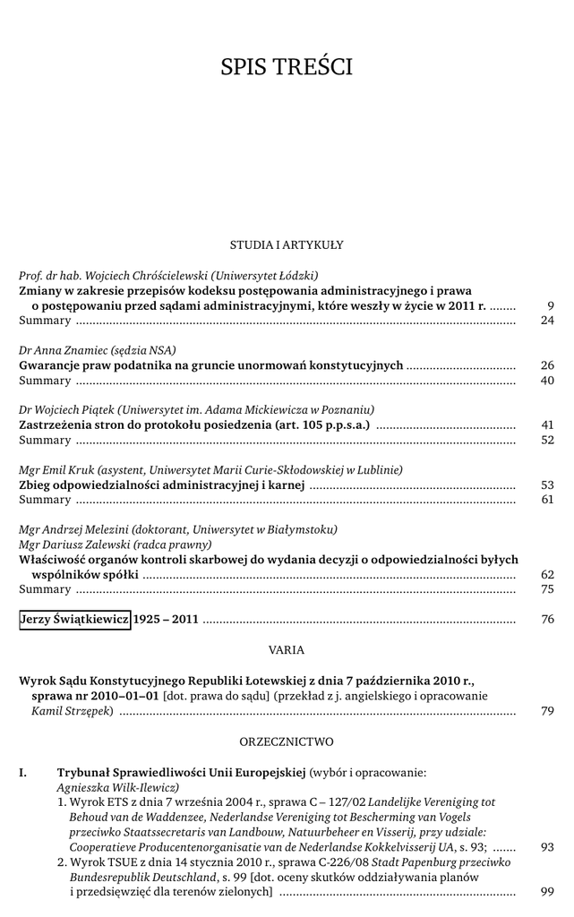 SPIS TREŚCI STUDIA I ARTYKUŁY Prof. dr hab. Wojciech Chróścielewski (Uniwersytet Łódzki) Zmiany w zakresie przepisów kodeksu postępowania administracyjnego i prawa o postępowaniu przed sądami administracyjnymi, które weszły w życie w 2011 r. ........ Summary .................................................................................................................................... 9 24 Dr Anna Znamiec (sędzia NSA) Gwarancje praw podatnika na gruncie unormowań konstytucyjnych ................................. Summary .................................................................................................................................... 26 40 Dr Wojciech Piątek (Uniwersytet im. Adama Mickiewicza w Poznaniu) Zastrzeżenia stron do protokołu posiedzenia (art. 105 p.p.s.a.) .......................................... Summary .................................................................................................................................... 41 52 Mgr Emil Kruk (asystent, Uniwersytet Marii Curie-Skłodowskiej w Lublinie) Zbieg odpowiedzialności administracyjnej i karnej .............................................................. Summary .................................................................................................................................... 53 61 Mgr Andrzej Melezini (doktorant, Uniwersytet w Białymstoku) Mgr Dariusz Zalewski (radca prawny) Właściwość organów kontroli skarbowej do wydania decyzji o odpowiedzialności byłych wspólników spółki ................................................................................................................ Summary .................................................................................................................................... 62 75 Jerzy Świątkiewicz 1925 – 2011 .............................................................................................. 76 VARIA Wyrok Sądu Konstytucyjnego Republiki Łotewskiej z dnia 7 października 2010 r., sprawa nr 2010–01–01 [dot. prawa do sądu] (przekład z j. angielskiego i opracowanie Kamil Strzępek) ....................................................................................................................... 79 ORZECZNICTWO I. Trybunał Sprawiedliwości Unii Europejskiej (wybór i opracowanie: Agnieszka Wilk-Ilewicz) 1. Wyrok ETS z dnia 7 września 2004 r., sprawa C – 127/02 Landelijke Vereniging tot Behoud van de Waddenzee, Nederlandse Vereniging tot Bescherming van Vogels przeciwko Staatssecretaris van Landbouw, Natuurbeheer en Visserij, przy udziale: Cooperatieve Producentenorganisatie van de Nederlandse Kokkelvisserij UA, s. 93; ....... 2. Wyrok TSUE z dnia 14 stycznia 2010 r., sprawa C-226/08 Stadt Papenburg przeciwko Bundesrepublik Deutschland, s. 99 [dot. oceny skutków oddziaływania planów i przedsięwzięć dla terenów zielonych] ....................................................................... 93 99 4 Zeszyty Naukowe Sądownictwa Administracyjnego 4 (37)/2011 II. Europejski Trybunał Praw Człowieka (wybór i opracowanie: Agnieszka Wilk-Ilewicz) Wyrok ETPC z dnia 19 kwietnia 2011 r. w sprawie ELCOMP sp. z o.o. przeciwko Polsce (skarga nr 37492/05) [dot. ograniczenia prawa do sądu] ................................................ III. IV. Trybunał Konstytucyjny (wybór: Irena Chojnacka, opracowanie: Mieszko Nowicki) 1. Wyrok TK z dnia 20 kwietnia 2011 r. sygn. akt Kp 7/09 [dot. przepisów prawa budowlanego znoszących pozwolenia na budowę i zastępujących je obowiązkiem zgłoszenia i rejestracji budowy oraz przepisów o legalizacji samowoli budowlanej] ................................................................................................................. 2. Wyrok TK z dnia 5 kwietnia 2011 r. sygn. akt P 26/09 [dot. sytuacji prawnej przedsiębiorcy w świetle zasad sprzedaży napojów alkoholowych osobom nieletnim] .................................................................................................................... Sąd Najwyższy (wybór: Andrzej Wróbel, opracowanie: Dawid Miąsik) Wyrok SN z dnia 9 marca 2011 r. sygn. akt. III SK 37/10 [dot. prawa energetycznego – braku okoliczności wyłączającej możliwość zmiany decyzji o zatwierdzeniu taryfy] ............................................................................................................................. 102 105 115 120 V. Naczelny Sąd Administracyjny i wojewódzkie sądy administracyjne A. Orzecznictwo Naczelnego Sądu Administracyjnego (wybór: Stefan Babiarz, opracowanie: Marcin Wiącek) 1. Uchwała składu siedmiu sędziów NSA z dnia 10 stycznia 2011 r. sygn. akt I OPS 4/10 [dot. skargi do sądu administracyjnego na orzeczenie dyscyplinarne o upomnieniu strażaka] ........................................................................................... 125 2. Uchwała składu siedmiu sędziów NSA z dnia 15 czerwca 2011 r. sygn. akt I OPS 1/11 [dot. soboty jako dnia równorzędnego z dniem wolnym od pracy] ........ 128 B. Orzecznictwo wojewódzkich sądów administracyjnych (wybór: Bogusław Gruszczyński, opracowanie: Marcin Wiącek) ...................................................................................... 1. Wyrok WSA w Warszawie z dnia 27 kwietnia 2010 r. sygn. akt VIII SA/Wa 840/09 [dot. przesłanek tzw. ulgi rehabilitacyjnej w podatku dochodowym od osób fizycznych] ............................................................................................................... 134 2. Wyrok WSA w Rzeszowie z dnia 28 kwietnia 2010 r. sygn. akt II SA/Rz 384/09 [dot. skutków prawnych wyroku Trybunału Konstytucyjnego, w którym odroczono utratę mocy obowiązującej niekonstytucyjnego przepisu] ....................................... 138 3. Wyrok WSA w Gdańsku z dnia 10 czerwca 2010 r. sygn. akt III SA/Gd 114/10 [dot. sprostowania wpisu do ewidencji gruntów] ..................................................... 140 4. Wyrok WSA