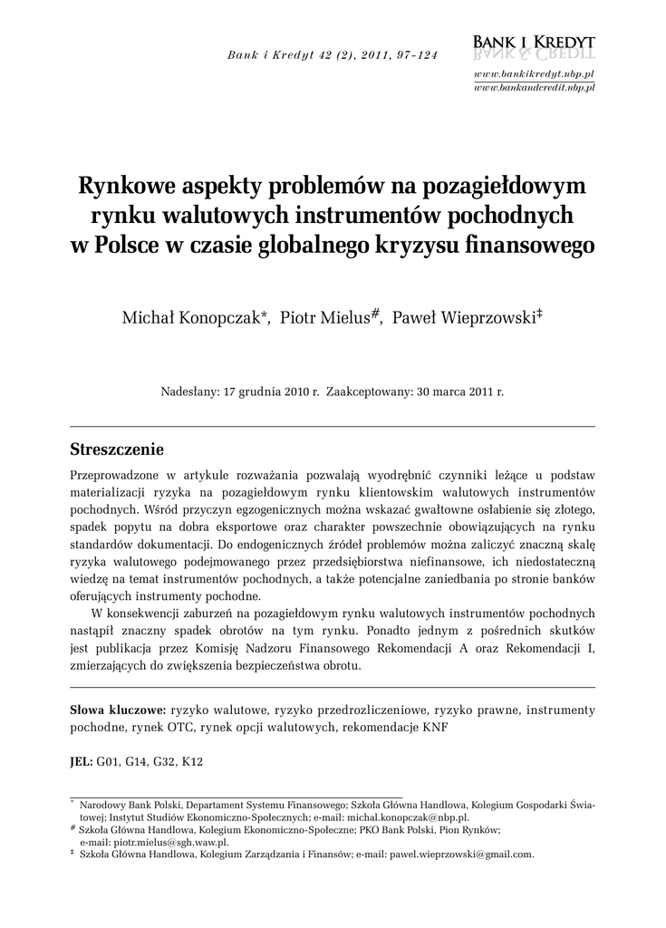 Ba n k i K r e d y t 4 2 (2 ), 2 0 1 1 , 9 7 –1 2 4 www.bankikredyt.nbp.pl www.bankandcredit.nbp.pl Rynkowe aspekty problemów na pozagiełdowym rynku walutowych instrumentów pochodnych w Polsce w czasie globalnego kryzysu finansowego Michał Konopczak*, Piotr Mielus#, Paweł Wieprzowski‡ Nadesłany: 17 grudnia 2010 r. Zaakceptowany: 30 marca 2011 r. Streszczenie Przeprowadzone w artykule rozważania pozwalają wyodrębnić czynniki leżące u podstaw materializacji ryzyka na pozagiełdowym rynku klientowskim walutowych instrumentów pochodnych. Wśród przyczyn egzogenicznych można wskazać gwałtowne osłabienie się złotego, spadek popytu na dobra eksportowe oraz charakter powszechnie obowiązujących na rynku standardów dokumentacji. Do endogenicznych źródeł problemów można zaliczyć znaczną skalę ryzyka walutowego podejmowanego przez przedsiębiorstwa niefinansowe, ich niedostateczną wiedzę na temat instrumentów pochodnych, a także potencjalne zaniedbania po stronie banków oferujących instrumenty pochodne. W konsekwencji zaburzeń na pozagiełdowym rynku walutowych instrumentów pochodnych nastąpił znaczny spadek obrotów na tym rynku. Ponadto jednym z pośrednich skutków jest publikacja przez Komisję Nadzoru Finansowego Rekomendacji A oraz Rekomendacji I, zmierzających do zwiększenia bezpieczeństwa obrotu. Słowa kluczowe: ryzyko walutowe, ryzyko przedrozliczeniowe, ryzyko prawne, instrumenty pochodne, rynek OTC, rynek opcji walutowych, rekomendacje KNF JEL: G01, G14, G32, K12 * Narodowy Bank Polski, Departament Systemu Finansowego; Szkoła Główna Handlowa, Kolegium Gospodarki Światowej; Instytut Studiów Ekonomiczno-Społecznych; e-mail: [email protected]. # Szkoła Główna Handlowa, Kolegium Ekonomiczno-Społeczne; PKO Bank Polski, Pion Rynków; e-mail: [email protected]. ‡ Szkoła Główna Handlowa, Kolegium Zarządzania i Finansów; e-mail: [email protected]. 98 M . Ko n o p c za k , P. Mi elus, P. Wi eprzow ski 1. Wstęp1 W ostatnich latach globalny kryzys finansowy z różnym natężeniem wpływał na poszczególne segmenty polskiego rynku finansowego. W odniesieniu do niektórych z nich jego oddziaływanie było stosunkowo krótkotrwałe i niegroźne w skutkach. Jednak w przypadku krajowego rynku walutowego zaburzenia wywołane kryzysem przyczyniły się do silnej i gwałtownej deprecjacji złotego, która wywarła istotny wpływ nie tylko na podmioty sektora finansowego, ale również na ich kontrahentów z sektora realnego. Szczególnie jaskrawym przykładem negatywnych konsekwencji współzależności pomiędzy uczestnikami rynku z sektora finansowego i realnego były wydarzenia na rynku opcji walutowych na kurs złotego w IV kwartale 2008 r. i w I połowie 2009 r. Specyfika oraz okoliczności zawierania przez przedsiębiorstwa niefinansowe umów opcyjnych z bankami, jak również skutki silnego osłabienia się złotego wzbudziły żywe zainteresowanie nie tylko uczestników i obserwatorów sytuacji na rynku finansowym, ale także szerokiej opinii publicznej, a nawet parlamentarzystów. Ponadto od przełomu 2008 i 2009 r. omawiana tematyka jest przedmiotem zainteresowania zarówno w publikacjach stricte publicystycznych, jak i opracowaniach naukowych – artykułach, raportach, książkach. Przykładowo Karkowski (2009) przedstawia bardzo ciekawe ujęcie zagadnienia, podając m.in. liczne przykłady rzeczywistych transakcji zawieranych na rynku opcji walutowych. Gontarski (2009) dokonuje z kolei wszechstronnej analizy aspektów prawnych zawieranych umów. Na temat potencjalnych rozwiązań problemów wynikających z transakcji opcjami walutowymi pisze m.in. Niedziółka (2009). Liczne wzmianki na temat sytuacji w tym segmencie rynku walutowych instrumentów pochodnych, w tym próby pomiaru pozycji zajmowanych przez jego poszczególnych uczestników, można znaleźć w opracowaniach Narodowego Banku Polskiego (np. NBP 2009c) czy Komisji Nadzoru Finansowego (np. KNF 2009a; 2009b; 2009d). Problemy na rynku opcji walutowych prezentowane są również w szerszym kontekście – przy okazji omawiania przebiegu kryzysu finansowego w Polsce (np. Konopczak, Sieradzki, Wiernicki 2010). W artykule opublikowanym przez Międzynarodowy Fundusz Walutowy Dodd (2009) prezentuje negatywne skutki wykorzystywania instrumentów pochodnych w ujęciu międzynarodowym, posługując się przykładami krajów mających problemy podobne do tych, które wystąpiły w Polsce2. Trudno wskazać jedną pozycję literatury przedmiotu, która łączyłaby w spójną całość wszystkie aspekty rynku instrumentów pochodnych. Przyczyną jest wysoki stopień skomplikowania zagadnienia, odwołującego się do specjalistycznej wiedzy z zakresu finansów, prawa, ekonomii, a także wymagającego dogłębnej znajomości praktycznych uwarunkowań transakcji zawieranych na pozagiełdowym rynku instrumentów pochodnych, Co więcej, temperatura debaty na temat „problemu opcji walutowych”, mnogość jej uczestników oraz zróżnicowany poziom ich wiedzy przyczyniły się do powstania i narastania wokół tego zagadnienia wielu niejasności i nieporozumień. 1 Tekst wyraża poglądy autorów, niekoniecznie odzwierciedlające oficjalne stanowiska instytucji, w których pracują. się, że od rozpoczęcia globalnego kryzysu finansowego do kwietnia 2009 r. łączne straty związane z transakcjami walutowymi instrumentami pochodnymi wyniosły około 530 mld USD i wystąpiły w przynajmniej 12 krajach: na Sri Lance, Tajwanie, w Indiach, Malezji, Indonezji, Japonii, Korei, Hongkongu, Chinach, Brazylii, Meksyku i Polsce (Dodd 2009, s. 3; zob. także Kamil, Sutton, Walker 2009 oraz Parkiet 2010). Chociaż poziom strat przedsiębiorstw był zróżnicowany i różnie radzono sobie z rozwiązywaniem tego problemu, mechanizm powstawania wysokich ujemnych wycen z tytułu transakcji tymi instrumentami był podobny na wszystkich rynkach wschodzących. 2 Szacuje Rynkowe aspekty problemów na poz