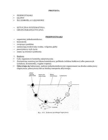 PROTISTA • • • PIERWOTNIAKI GLONY ŚLUZOROŚLA I LĘGNIOWE – – SZTUCZNA SYSTEMATYKA GRUPA PARAFILETYCZNA PIERWOTNIAKI – – – – – – organizmy jednokomórkowe heterotrofy zwięrzęco podobne zamieszują środowiska wodne, wilgotne gleby pasożytniczy tryb życia znane są również symbionty 1. Budowa • Cały organizm to komórka eukariotyczna. • Zewnetrzną warstwą jest błona komórkowa, pellikula (włókna białkowe) albo pancerzyk (celuloza, krzemionka, węglan wapnia). • Odzywiaja się bakteriami, małymi jednokomórkowymi organizmami na drodze endocytozy (fagocytoza, pinocytoza) lub na drodzę transportu aktywnego. • Wodniczki tętniące- wydalają nadmiar wody z organizmu pierwotniaka oaraz zbędne azotowe produkty orzemiany materii. Wodniczni tętniące występują przede wszytskim u słodkowodnych pierwotniaków, gdyx jsko organizmy hipertoniczne względem otoczenia, sa one narażone na cięgłę znikanie wody do ich organizmu. Gatunki morskie i pasozytnicze sa zwykle izotoniczne względem środowiska, więc nie posiadaja wodniczek tętniących. • Oddychaja głównie tlenowo- przez błonę komórkową całą powierzchnia ciała, pasozytnicze- beztlenowo. Poruszają się za pomocą wici, rzęsek albo nibynóżek (pseudopodiów). • Włókna obwodowe nikają głębiej do komórki niż włókna osiowe i tworza tzw. Ciałko podstawkowe- stanowiące zakotwiczenie undupodiów (wici, rzęsek). Ciałka podstawkowe rzęsek łączą sie pod wierzchnia błony z włóknami białkowymi, co umozliwia koordynację ich działania. Synchronizacja pracy wilu rzęsek umozliwia poruszanie się w określonym kierunku (wiosłowanie). • • • • Rozmnażanie bezpłciowe- podział poprzeczy lub podział podłużny Mezjoza postgamiczna- rekombinacja materiały genetycznego następuje podczas mejozy, którau gatunków posiadających haploidalne formy troficzne zachodzi od razu po zapłodnieniu Mejoza pregamiczna-u gatunków posiadających diploidalne formy troficzne, rekombinacja materiału genetycznego zachodzi tuż przed zapłodnieniem Anabioza- pierwotniaki moga przejść w stan życia utajonego w niekorzystnych warunkach zycia- np. brak wody czy niekorzystna temperatura otoczenia Do pierwotniaków zaliczamy: wiciowce, sporowce, zarodziowe i orzęski. WICIOWCE – poruszają się za pomocą wici – rozmnażają sie przez podział podłuzny – mejoza postgamiczna – – – zaliczamy tu swidrowca- pasozytują we krwi ssaków, przenoszone najczęściej przez owady, przykład świdrowiec gambijski (wywołuje śpiączke u ludzi) oraz świdrowiec nagany (wywołuje u bydła śmiertelna chorobe- naganę). Oba gatunki przenoszone prze muche tsetse. Zaliczmay tu także rzęsistki- bytuje w drogach rodnych ssaków, wywołuje stany zapalne, poronienia, bezpłodność, przykład rzęsistek pochwowy (bytuje w drogach rodnych kobiety, przenoszony drogą płciową) groźny jest także wiciowiec lambia-pasożytuje w układzie pokarmowym, wywołuje groźne schorzenia dwunasticy, trzustki i wątroby. SPOROWCE – mezjoza postgamiczna – cykle życiowe zazwyczaj połączone są ze zmianą żywiciela. Żywiciel pośredni- to organizm, w którym pasozyt rozmnaż się tylko i wyłącnzie bezpłciowo. Żywiciel ostateczny- to organizm, w którym dochodzi to procesu płciowego pasozyta. – Zarodziec malarii- wywołuje chorobe zwana malarią. Zywiciele pośrednim jest stałocipelny kręgowiec, a ostatecznym komar widliszek. U komara dochodzi do procesu płciowego i wytworzenia zygoty. Zygota dzieli sie mejotycznie, a powstałe haploidalne postai inwazyjne zrodźc zostają wstrzyknięte do krwi człowieka poprzez ukłucie komara widliszka. U zarazonego człowika zarodziec dzieli się intensywnie (głównie w komórkach wątroby i śledziony). Zaatakowane krwinki pękają, a wydostające sie do osocza komórki zarodźca atakują następne krwinki. Krwinki pękają równocześnie, co powoduje u zarażonego człwoieka atak malarii. Wysysając krew zarazonego człowieka, komar pobiera krwinki zawierające komórki zarodźca. W organiźmie komara komórki te przekształcają się w gamety, dochodzi do procesu płciowego i wytworzenia zygot. – Toksoplazmoza- wywołana przez pierworniaka. Zywicielem ostatecznym jest kot, a pośrednim może być człowiek. Do zakażenia dochodzi najczęsciej podczas kontaktu z zarażonym kotem. U dorosłych toksoplazmoza przebiega łagodnie, najwieksze niebezpieczeństwo stanowi dla kobiet w ciąży, gdyż pierwotniak może zaatakować płód, powodując m.in. Porażenie mózgowe. ZARODZCOWE – poruszaja sie za pomocą nibynóżek – AMEBY, inaczej pełzaki. Zamieszkuja zbiorniki wodne. Przykład- pełzak czerwony, wywołujący czerwonke amebową ( objawy krwawa biegunka) – OTWORNICE i PROMIENICE: pierwotniaki morskie. ORZĘSKI – poruszanie za pomocą rzęsek – pellikula na powierzchni komórki, dlatego fagocytoza i pinocytoza moga zachodzić tylko w określonych miejscach komórki – w cytosomie. – Strawione resztki pokarmowe usuwane są za pomocą - cytopyge – posiadaja 2 jądra: mikronukleus i makronukleus. Mikronukleus zawiera całą informację genetyczną pierwotniaka, jest to jądro diploidalne. Można porównac go do archiwum wykorzystywane podczas przekazywania materiału genetycznego organizmom potomnym. Makronukleus zawiera tylko iektóre nici chromatynowe mikronukleusa. Można uznac go za jądro robocze, wykorzystywane w procesach ekspresji informacji genetycznej. – rozmnażanie przez podział poprzeczny, przy czym mikronukleus dzieli się mitotycznie, a a makronukleus- amitotycznie. – – Mejoza pregamiczna Koniugacja- czasowe połączenie sie osobników i wymiana materiału genetycznego między nimi. Proces ropoczyna sie 1. mejozą mikronukleusów obu orzęsków 2. nastepnie jedno z 4 haploidalnych jąder dzieli sie mitotycznie 3. wymiana jąder między orzęskami.- krzyzowa kariogamia 4. Po rozdzieleniu orzęsków diploidalne j