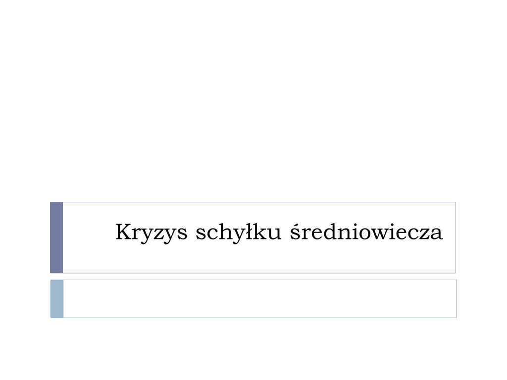Kryzys schyłku średniowiecza 1. „Czarna śmierć” Epidemia dżumy przybywa w 1347r., rozprzestrzenia się od 1348 Z Azji Środkowej kupcy przytargali ją do Azji Wschodniej i Południowej, Bliski Wschód i Afryki Podczas ataku na Kaffę Tatarzy użyli „broni biologicznej” Uciekinierzy z Kaffy dotarli do Messyny w Europie Pandemia trwała od 1348-1352 Śmierć ok. 25 000 000 ludzi; 1/3 populacji Europy W niektórych miejscach zmarło nawet ok. 50% Nie znano takich chorób, nie potrafiono sobie z nią radzić; uciekano ze wsi do miast i z miast do wsi, nie myto się, pozbywano się wszystkiego co nieładnie pachniało, palno wszystko co należało do chorych „Morowe powietrze” - „miazmaty”; zatrute powietrze powstałe z powodu czarów lub działania ciał niebieskich Polskę oszczędziło… 2. Kryzys gospodarczy Spustoszone i opuszczone obszary Europy Nie ma komu uprawiać roli = mniej żywności By nie złapać choroby nie sprzedawano towarów na rynku obcym/nieznanym = upadek handlu Upadek handlu przez prześladowania Żydów Słaba technika uprawy; nie stosowano nowych metod, jedynie zwiększano tereny pod uprawę „mała epoka lodowcowa” od pocz. XIV w = klęski nieurodzaju (1315, 1317) Zanikanie osad Kryzys agrarny i spadek populacji powoduje spadek cen produktów rolnych = to powoduje zmniejszenie dochodów właścicieli ziemskich = chęć podniesienia obciążeń feudalnych = bunty społeczne w Europie Zachodniej XIV w. psucie monety Próbowano sobie radzić z kryzysem; W rolnictwie zaczęto się specjalizować, nastawiano się na uprawy przemysłowe i pastewne, rozwój pastwisk i hodowli W produkcji miejskiej system nakładczy; pracownicy wykonywali produkty lub ich część u siebie w domu z materiałów dostarczonych przez „szefa” 3. Prześladowanie Żydów Od XII w. w Europie pojawiły się oskarżenia Żydów o dokonywanie mordów rytualnych. Pierwszy znany przykład odnotowano w Anglii; związany był z historią dwunastoletniego Wiliama, który rzekomo miał zostać uprowadzony przez nieznanego mężczyznę, a następnie w okrutny sposób zamordowany poprzez ukrzyżowanie. O dokonanie zbrodni fałszywie oskarżono Żydów, którzy – według podania – w tej sposób mieli uczcić święto Pesach. Pogłoski wywołały zamieszki wśród miejscowej ludności skierowane przeciwko Żydom. W niedługim czasie pojawiły się jeszcze w Anglii dwa oskarżenia o dokonanie mordu rytualnego. We Francji, w 1171 roku, Żydzi z Blois zostali oskarżeni o ukrzyżowanie chrześcijańskiego dziecka i wrzucenie go do rzeki; w wyniku tych oskarżeń doszło do zamieszek i zgładzenia całej społeczności żydowskiej z tego miasteczka. Podobne wydarzenia miały miejsca w latach: 1179, 1191 i 1247. W Niemczech podobne pogłoski pojawiły się w 1147 roku, ale najbardziej krwawe wydarzenie miało miejsce w 1235 roku w Fuldzie, kiedy krzyżowcy zamordowali 34 Żydów, podejrzanych o zabicie pięciu młodych chłopców, w celu wytoczenia z nich krwi. Po tych wydarzeniach papiestwo zareagowało stanowczo, wydając w 1253 roku oświadczenie, że zabrania się pomawiać Żydów o używanie ludzkiej krwi. Oprócz oskarżeń o dokonywanie mordów rytualnych, zdarzało się, że pomawiano Żydów o profanację hostii. Pierwsza tego typu sprawa miała miejsce w 1298 roku w Rottingen. Spowodowała zajścia, w wyniku których w całych Niemczech życie straciło prawie sto tysięcy Żydów. Równie tragiczne w skutkach było rozsiewanie pogłoski o zatruwaniu przez Żydów studni i źródeł. Tak stało się np. w 1321 r. w Akwitanii. Zarzuty te okazały się dla Żydów szczególnie groźne w okresie „czarnej śmierci”. Wtedy powszechnie uznawano ich za sprawców epidemii. Oświadczenia papieża, że Żydzi umierają tak samo jak chrześcijanie, nie powstrzymały tłumów. Zamieszki zakończyły się śmiercią kilku tysięcy Żydów. 4. Bunty społeczne Czarna śmierć, wojna stuletnia, kryzys gospodarczy powoduje radykalizację nastojów społecznych Flandria 1323-1328; hrabia żąda podatków, chłopi odmawiają; rabunki, grabieże, podpalenia – stłumiono przy pomocy Francji Francja 1358 „żakeria”; czarna śmierć, porażki Francji w wojnie z Anglią, nałożenie nowych podatków, by wykupić króla Jana Dobrego; rabunki, grabieże, podpalenia – stłumione Anglia 1381 „powstanie Wata Tylera”; podnoszenie podatków na wojnę z Francją; rabunki, grabieże, podpalenia; oprócz chłopów udział wzięli także ubodzy księża ludowi, rzemieślnicy; pojawiły się także hasła żądające zniesienie poddaństwa, zmniejszenia danin; udało się zdobyć i splądrować Londyn – król obiecał zrealizować program powstańców Zaproszono Tylera na negocjacje, by go tam odesłać w zaświaty; powstańcy nie mając lidera kończą bunt 5. Niewola awiniońska papieży 1307-1377 W XIII w. to papiestwo dominowało nad cesarzem, ale w XIV król Francji Filip Piękny się stawia 1302 r. papież Bonifacy VIII wydał bullę Unam sanctum, która mówi, że podporządkowanie się papieżowi jest potrzebne do zbawienia W odpowiedzi Filip oświadczył, że wybór Bonifacego jest nieważny (przy okazji oskarżył go o morderstwa, cudzołóstwo, pedofilię, konszachty z szatanem itd..) i kazał go aresztować Coraz większa rola Francji; kolegium kardynalskie głównie z Francji, papieże z Francji Siedziba papiestwa została w 1309 r. przeniesiona do Awinionu we …Francji – od tego czasu tzw. niewola awiniońska papieży Papieże zależni do władców Francji Kościół znów w kryzysie duchowym 6. Wielka Schizma Zachodnia 1378-1417 1378 r. na papieża wybrano Grzegorza XI, który powraca do Rzymu, ale po roku umiera Wybrano Włocha, Urbana VI Części (głównie francuskiej) to się nie podoba i w 1378 r. wybierają nowego papieża Klemensa VII Urban VI nie rezygnuje i mamy dwóch papieży: Papież obediencji rzymskiej – Urban VI; poparcie Anglików, Niemców, Włochów P