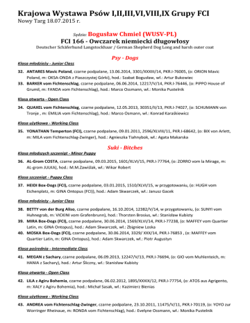 Krajowa Wystawa Psów I,II,III,VI,VIII,IX Grupy FCI Nowy Targ 18.07.2015 r. Sędzia: Bogusław Chmiel (WUSV-PL) FCI 166 - Owczarek niemiecki długowłosy Deutscher Schäferhund Langstockhaar / German Shepherd Dog Long and harsh outer coat Psy - Dogs Klasa młodzieży - Junior Class 32. ANTARES Mavic Poland, czarne podpalane, 13.06.2014, 3301/XXXIII/14, PKR.I-76005, (o: ORION Mavic Poland, m: OKSA-ONDA z Piaszczystej Górki), hod.: Szabat Bogusław, wł.: Artur Bukowiec 33. BARKER vom Fichtenschlag, czarne podpalane, 06.06.2014, 12217/V/14, PKR.I-76446, (o: PIPPO House of Grumil, m: FANDA vom Fichtenschlag), hod.: Marco Ossmann, wł.: Monika Pustelnik Klasa otwarta - Open Class 34. QUAXEL vom Fichtenschlag, czarne podpalane, 12.05.2013, 30351/II/13, PKR.I-74027, (o: SCHUMANN von Tronje , m: EMILIA vom Fichtenschlag), hod.: Marco Osmann, wł.: Konrad Karaśkiewicz Klasa użytkowa - Working Class 35. YONATHAN Temperton (FCI), czarne podpalane, 09.01.2011, 2596/XLVIII/11, PKR.I-68642, (o: BIX von Arlett, m: MILA vom Fichtenschlag-Zwinger), hod.: Agnieszka Tiahnybok, wł.: Agata Makarska Suki - Bitches Klasa młodszych szczeniąt - Minor Puppy 36. AL-Grom COSTA, czarne podpalane, 09.03.2015, 1601/XLVI/15, PKR.I-77764, (o: ZORRO vom la Mirage, m: AL-grom JULKA), hod.: M.M.Zawiślak, wł.: Wikar Robert Klasa szczeniąt - Puppy Class 37. HEIDI Box-Dogs (FCI), czarne podpalane, 03.01.2015, 1510/XLVI/15, w przygotowaniu, (o: HUGH vom Eichenplatz, m: GINA Ontopus (FCI)), hod.: Adam Skwarczek, wł.: Janusz Gacek Klasa młodzieży - Junior Class 38. BETTY von der Burg Aliso, czarne podpalane, 16.10.2014, 12382/V/14, w przygotowaniu, (o: SUNYI vom Huhnegrab, m: VICKINI vom Grafenbrunn), hod.: Thorsten Brosius, wł.: Stanisław Kubisty 39. MIRA Box-Dogs (FCI), czarne podpalane, 30.06.2014, 1569/XLVI/14, PKR.I-77238, (o: MAFFEY vom Quartier Latin, m: GINA Ontopus), hod.: Adam Skwarczek, wł.: Zbigniew Loska 40. MOSKA Box-Dogs (FCI), czarne podpalane, 30.06.2014, 3329/ XXX/14, PKR.I-76853 , (o: MAFFEY vom Quartier Latin, m: GINA Ontopus), hod.: Adam Skwarczek, wł.: Piotr Augustyn Klasa pośrednia - Intermediate Class 41. MEGAN z Sachary, czarne podpalane, 06.09.2013, 12247/V/13, PKR.I-76694, (o: GIO vom Muhlenteich, m: HANIA z Sachary), hod.: Artur Śliczny, wł.: Stanisław Kubisty Klasa otwarta - Open Class 42. LILA z Agiru Bohemia, czarne podpalane, 06.02.2012, 1895/XXXIX/12, PKR.I-77754, (o: ATOS aus Agrigento, m: XALY z Agiru Bohemia), hod.: Michał Sasak, wł.: Kazimierz Bienias Klasa użytkowa - Working Class 43. ANDREA vom Fichtenschlag-Zwinger, czarne podpalane, 23.10.2011, 11475/V/11, PKR.I-70119, (o: YOYO zur Worringer Rheinaue, m: RONDA vom Fichtenschlag), hod.: Evelyne Ossmann, wł.: Monika Pustelnik Bogusław Chmiel (WUSV-PL) FCI 166 - Owczarek niemiecki krótkowłosy Sędzia: Deutscher Schäferhund Stockhaar / German Shepherd Dog Double coat Psy - Dogs Klasa młodzieży - Junior Class 44. CHARLY Stary Samotar, czarne podpalane, 03.07.2014, 27414/IIII/14, SZB 27414, (o: MEMPHIS Solebrunnen, m: MOLLY Dzako), hod.: Jan Gocelovsky, wł.: Jozef Dupnak 415. FIDO Sądeckie Lachy, czarne podpalane, 28.09.2014, 3255/XXXIII/14, w przygotowaniu, (o: PACCO vom Langenbungert, m: IDA Sądeckie Lachy), hod.: Andrzej Woda, wł.: Andrzej Woda 45. MESSI Box-Dogs (FCI), czarne podpalane, 30.06.2014, 3297/XXXIII/14, PKR.I-75959, (o: MAFFEY vom Quartier Latin, m: GINA Ontopus), hod.: Adam Skwarczek, wł.: Marek Gołyźniak 46. WHYSKEY Adi, czarne podpalane, 01.07.2014, 3307/XXVIII/14, w przygotowaniu, (o: ENZO Wolf-Max, m: MIA vom Frankengold), hod.: Mariusz Cichostępski, wł.: Aneta Bors Klasa pośrednia - Intermediate Class 47. IRK Dobrzyków, czarne podpalane, 08.03.2014, 15227/XV/14, PKR.I-76866, (o: PAKROS van Contra, m: ILVI vom Adelschlag), hod.: Bernard Famuła, wł.: Bernard Fauła Klasa otwarta - Open Class 48. Mavic Poland YERY, czarne podpalane, 22.06.2012, 3135/XXXIII/12, PKR.I-72968, (o: LEO Mavic Poland, m: WIERA Mavic Poland), hod.: Adrian Dobrzański, wł.: Sońta Adam 49. WAIKO von der Zenteiche,czarne podpalane, 08.05.2013, 30184/II/13, PKR.I-73397, (o: OMEN vom Radhaus, m: ENYA von der Zenteiche), hod.: Christoph Ludwig, wł.: Aleksander Moscoa Zeledon Suki - Bitches Klasa szczeniąt - Puppy Class 50. HIPSI Box-Dogs (FCI), czarne podpalane, 03.01.2015, 22/XLVI/15, w przygotowaniu, (o: HUGH vom Eichenplatz, m: GINA Ontopus), hod.: Adam Skwarczek, wł.: Adam Skwarczek Klasa młodzieży - Junior Class 51. CLEO Goldberg Kraków (FCI), czarne podpalane, 31.03.2014, 13831/IV/14, PKR.I-75915, (o: VADIM von Aurelius, m: ASZKA Jarkowski Dwór), hod.: Jarosław Opozda, wł.: Czesław Suchan 52. GRETA Śmiłowickie Wilki, czarne podpalane, 05.02.2014, 6950/XXIII/14, PKR.I-75647, (o: VADIM von Aurelius, m: ANUSHKA Śmiłowickie Wilki), hod.: Renata Horzela, wł.: Hynek-Krzakowska Paulina 53. RIVIA Germanius Ortus, czarne , 22.02.2014, 1559/XLVI/14, PKR.I-76796, (o: ZIDAN of Flokish Fest, m: UMBER Germanius Ortus), hod.: Bogusław Chmiel, wł.: Zygmunt Gorczyca Klasa pośrednia - Intermediate Class 54. BERTA Wolf-Gang, czarne podpalane, 20.11.2013, 1835/XXXIX/13, PKR.I-76106, (o: ETOO aus Wattenscheid, m: FINJS von Pallas Athene), hod.: Ireneusz Kajak, wł.: Kazimierz Bienias 55. CAYENNE van Ayla's Aura, czarne podpalane, 06.12.2013, 30613/II/13, PKR.I-75339, (o: PEPE vom Kuckucksland, m: FIBY von der Zenteiche), hod.: Lelieveld Jafm, wł.: Wiesław Małek 56. DORA Sądeckie Lachy, czarne podpalane, 01.02.2014, 00000/XXXIII/14, PKR.I-74667, (o: WIGO Stary Samotar, m: GINGER aus Buddy's Meute), hod.: Andrzej Woda, wł.: Bernard Fauła 57. HABIBI von Gran Peregrino, czarne podpalane, 26.09.2013, 30457/II/13, PKR.I-74623, (o: LUGER vom Aspenhaus, m: MILLA vom Fichtenschlag Zwinger), hod.: Aleksander Moscoa Zeledon, wł.: Aleksander Moscoa Zeledon Klasa otwarta - Open Class 58. AKCJA Schwarzwald Team, czarne podpalane, 14.10.2013, 35456/XXII/13, PKR.I-25854, (o: HOREX vom Fiemereck , m: QUEEN vom Muhlenbl
