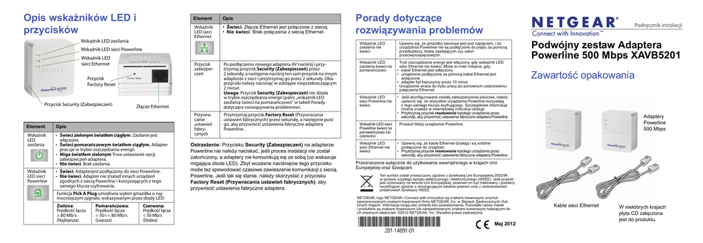Opis wskaźników LED i przycisków Wskaźnik LED zasilania Element Opis Wskaźnik LED sieci Ethernet • Świeci. Złącze Ethernet jest połączone z siecią. • Nie świeci. Brak połączenia z siecią Ethernet. Wskaźnik LED zasilania nie świeci Wskaźnik LED sieci Powerline Wskaźnik LED sieci Ethernet Przycisk zabezpieczeń Przycisk Factory Reset Przycisk Security (Zabezpieczeń) Złącze Ethernet Element Opis Wskaźnik LED zasilania • Świeci zielonym światłem ciągłym. Zasilanie jest włączone. • Świeci pomarańczowym światłem ciągłym. Adapter pracuje w trybie oszczędzania energii. • Miga światłem zielonym Trwa ustawianie opcji zabezpieczeń adaptera. • Nie świeci. Brak zasilania. Wskaźnik LED sieci Powerline • Świeci. Adapterjest podłączony do sieci Powerline. • Nie świeci. Adapter nie znalazł innych urządzeń zgodnych z siecią Powerline i korzystających z tego samego klucza szyfrowania. Funkcja Pick A Plug umożliwia wybór gniazdka o najmocniejszym sygnale, wskazywanym przez diody LED: Zielona: Prędkość łącza > 80 Mb/s (Najlepsza) Pomarańczowa: Prędkość łącza > 50 i < 80 Mb/s (Lepsza) Porady dotyczące rozwiązywania problemów Czerwona: Prędkość łącza < 50 Mb/s (Dobra) Przywracanie ustawień fabrycznych Po podłączeniu nowego adaptera AV naciśnij i przytrzymaj przycisk Security (Zabezpieczeń) przez 2 sekundy, a następnie naciśnij ten sam przycisk na innym adapterze z sieci i przytrzymaj go przez 2 sekundy. Oba przyciski należy nacisnąć w odstępie nieprzekraczającym 2 minut. Uwaga: Przycisk Security (Zabezpieczeń) nie działa w trybie oszczędzania energii (patrz „wskaźnik LED zasilania świeci na pomarańczowo” w tabeli Porady dotyczące rozwiązywania problemów). Przytrzymaj przycisk Factory Reset (Przywracania ustawień fabrycznych) przez sekundę, a następnie puść go, aby przywrócić ustawienia fabryczne adaptera Powerline. Ostrzeżenie: Przycisku Security (Zabezpieczeń) na adapterze Powerline nie należy naciskać, jeśli proces instalacji nie został zakończony, a adaptery nie komunikują się ze sobą (co wskazuje migająca dioda LED). Zbyt wczesne naciśnięcie tego przycisku może też spowodować czasowe zawieszenie komunikacji z siecią Powerline. Jeśli tak się stanie, należy skorzystać z przycisku Factory Reset (Przywracania ustawień fabrycznych), aby przywrócić ustawienia fabryczne adaptera. Podręcznik instalacji Upewnij się, że gniazdko sieciowe jest pod napięciem, i że urządzenia Powerline nie są podłączone do prądu za pomocą przedłużaczy, listew zasilających czy osłon przeciwprzepięciowych. Wskaźnik LED zasilania świeci na pomarańczowo Tryb oszczędzania energii jest włączony, gdy wskaźnik LED sieci Ethernet nie świeci. Może to mieć miejsce, gdy: • kabel Ethernet jest odłączony. • urządzenie podłączone za pomocą kabla Ethernet jest wyłączone. • adapter był bezczynny przez 10 minut. Urządzenie wraca do trybu pracy po ponownym ustanowieniu połączenia Ethernet. Wskaźnik LED sieci Powerline nie świeci • Jeśli skonfigurowane zostały zabezpieczenia sieciowe, należy upewnić się, że wszystkie urządzenia Powerline korzystają z tego samego klucza szyfrującego. Szczegółowe informacje można znaleźć w internetowej Instrukcji obsługi. • Przytrzymaj przycisk resetowania każdego urządzenia przez sekundę, aby przywrócić ustawienia fabryczne adaptera Powerline. Wskaźnik LED sieci Powerline świeci na pomarańczowo lub czerwono Wskaźnik LED sieci Ethernet nie świeci Podwójny zestaw Adaptera Powerline 500 Mbps XAVB5201 Zawartość opakowania Adaptery Powerline 500 Mbps Przesuń bliżej urządzenie Powerline. • Upewnij się, że kable Ethernet działają i są solidnie podłączone do urządzeń. • Przytrzymaj przycisk resetowania każdego urządzenia przez sekundę, aby przywrócić ustawienia fabryczne adaptera Powerline. Przeznaczone wyłącznie do użytkowania wewnętrznego w krajach Unii Europejskiej oraz Szwajcarii. Ten symbol został umieszczony zgodnie z dyrektywą Unii Europejskiej 2002/96 w sprawie zużytego sprzętu elektrycznego i elektronicznego (WEEE). Jeśli produkt jest utylizowany na terenie Unii Europejskiej, powinien on być traktowany i poddany recyklingowi zgodnie z obowiązującym lokalnie prawem oraz z zastosowaniem postanowień dyrektywy WEEE. NETGEAR, logo NETGEAR i Connect with Innovation są znakami towarowymi oraz/lub zarezerwowanymi znakami towarowymi firmy NETGEAR, Inc. w Stanach Zjednoczonych i/lub innych krajach. Informacje mogą ulec zmianie bez powiadomienia. Pozostałe nazwy marek i produktów są znakami towarowymi lub zarejestrowanymi znakami towarowymi należącymi do ich prawnych właścicieli. ©2012 NETGEAR, Inc. Wszelkie prawa zastrzeżone. Maj 2012 Kable sieci Ethernet W niektórych krajach płyta CD załączona jest do produktu. Istniejąca sieć Powerline Pokój 1 Podłącz adapter Powerline Pokój 2 Pokój 3 Informacje dotyczące bezpieczeństwa • • • Wejście sieciowe: 100-240 V~, 0,2 A (Maks.) Temperatura otoczenia podczas pracy: od 0°C do 40°C Gniazdo wyjściowe powinno być łatwodostępne i zamontowane blisko sprzętu. Pomoc techniczna Kompatybilne urządzenia Powerline i HomePlug z certyfikatem AV to między innymi NETGEAR XAV101, XAV1004, XAV2001, XAV2501, and XAVN2001. Pełną listę urządzeń posiadających certyfikat AV można znaleźć na stronie http://www.homeplug.org/certified_products Dziękujemy za wybranie produktu firmy NETGEAR. Po zainstalowaniu urządzenia odszukaj numer seryjny na etykiecie znajdującej się na spodzie produktu i użyj jej do zarejestrowania wyrobu pod adresem http://www.NETGEAR.com/register. Zarejestrowanie jest wymagane, by uzyskać dostęp do telefonicznego centrum obsługi. Zalecamy dokonanie rejestracji za pośrednictwem witryny internetowej naszej firmy. Aby uzyskać dostęp do narzędzia XAV5201 Powerline, przejdź do strony: h