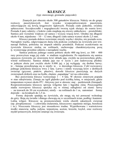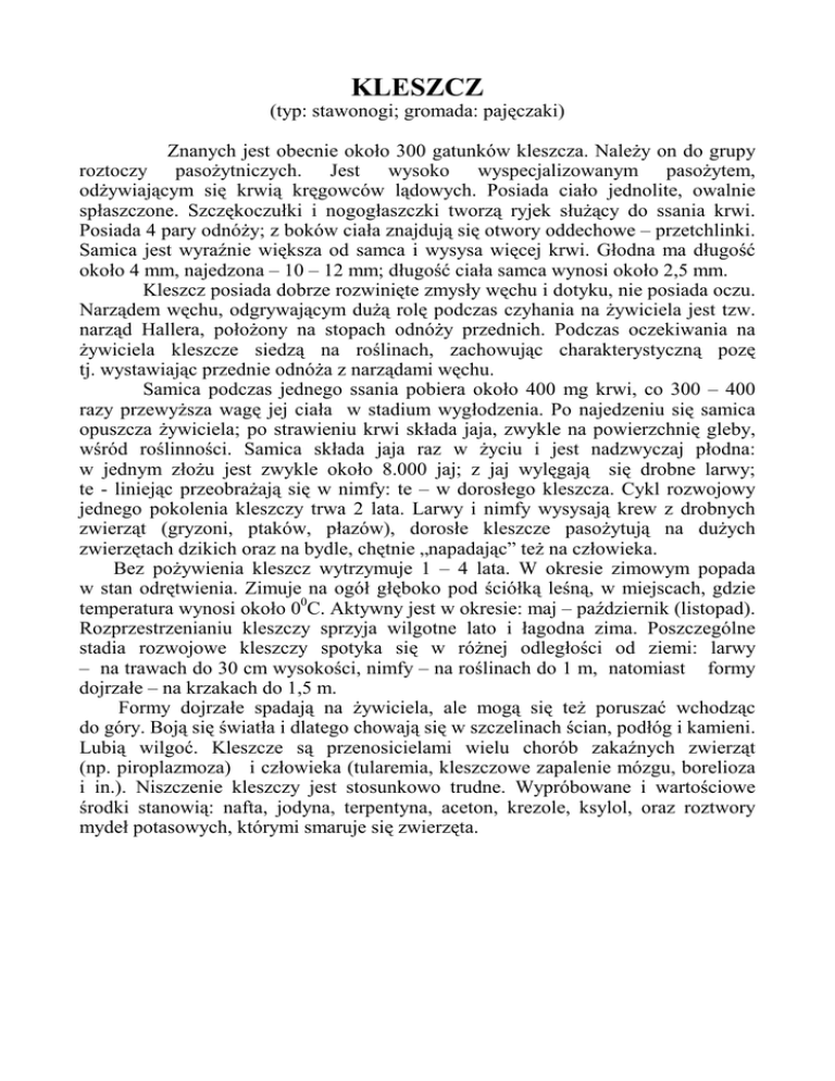 KLESZCZ (typ: stawonogi; gromada: pajęczaki) Znanych jest obecnie około 300 gatunków kleszcza. Należy on do grupy roztoczy pasożytniczych. Jest wysoko wyspecjalizowanym pasożytem, odżywiającym się krwią kręgowców lądowych. Posiada ciało jednolite, owalnie spłaszczone. Szczękoczułki i nogogłaszczki tworzą ryjek służący do ssania krwi. Posiada 4 pary odnóży; z boków ciała znajdują się otwory oddechowe – przetchlinki. Samica jest wyraźnie większa od samca i wysysa więcej krwi. Głodna ma długość około 4 mm, najedzona – 10 – 12 mm; długość ciała samca wynosi około 2,5 mm. Kleszcz posiada dobrze rozwinięte zmysły węchu i dotyku, nie posiada oczu. Narządem węchu, odgrywającym dużą rolę podczas czyhania na żywiciela jest tzw. narząd Hallera, położony na stopach odnóży przednich. Podczas oczekiwania na żywiciela kleszcze siedzą na roślinach, zachowując charakterystyczną pozę tj. wystawiając przednie odnóża z narządami węchu. Samica podczas jednego ssania pobiera około 400 mg krwi, co 300 – 400 razy przewyższa wagę jej ciała w stadium wygłodzenia. Po najedzeniu się samica opuszcza żywiciela; po strawieniu krwi składa jaja, zwykle na powierzchnię gleby, wśród roślinności. Samica składa jaja raz w życiu i jest nadzwyczaj płodna: w jednym złożu jest zwykle około 8.000 jaj; z jaj wylęgają się drobne larwy; te - liniejąc przeobrażają się w nimfy: te – w dorosłego kleszcza. Cykl rozwojowy jednego pokolenia kleszczy trwa 2 lata. Larwy i nimfy wysysają krew z drobnych zwierząt (gryzoni, ptaków, płazów), dorosłe kleszcze pasożytują na dużych zwierzętach dzikich oraz na bydle, chętnie „napadając” też na człowieka. Bez pożywienia kleszcz wytrzymuje 1 – 4 lata. W okresie zimowym popada w stan odrętwienia. Zimuje na ogół głęboko pod ściółką leśną, w miejscach, gdzie temperatura wynosi około 00C. Aktywny jest w okresie: maj – październik (listopad). Rozprzestrzenianiu kleszczy sprzyja wilgotne lato i łagodna zima. Poszczególne stadia rozwojowe kleszczy spotyka się w różnej odległości od ziemi: larwy – na trawach do 30 cm wysokości, nimfy – na roślinach do 1 m, natomiast formy dojrzałe – na krzakach do 1,5 m. Formy dojrzałe spadają na żywiciela, ale mogą się też poruszać wchodząc do góry. Boją się światła i dlatego chowają się w szczelinach ścian, podłóg i kamieni. Lubią wilgoć. Kleszcze są przenosicielami wielu chorób zakaźnych zwierząt (np. piroplazmoza) i człowieka (tularemia, kleszczowe zapalenie mózgu, borelioza i in.). Niszczenie kleszczy jest stosunkowo trudne. Wypróbowane i wartościowe środki stanowią: nafta, jodyna, terpentyna, aceton, krezole, ksylol, oraz roztwory mydeł potasowych, którymi smaruje się zwierzęta. KLESZCZOWE ZAPALENIE MÓZGU (KZM) Jest to ostra wirusowa choroba zakaźna, która występuje w różnych postaciach klinicznych i dotyczy głównie ośrodkowego układu nerwowego. Chorobę wywołują flawirusy. Do zakażenia dochodzi najczęściej w wyniku ukłucia przez zakażonego kleszcza, ale może szerzyć się także drogą pokarmową przez picie surowego mleka pochodzącego od zakażonych krów, kóz i owiec. Chorują dzieci i dorośli w wieku od 3 do 80 lat, najczęściej w wieku 15 – 50 lat. Nasilenie zachorowań obserwuje się od kwietnia do października, niekiedy ze szczytem w czerwcu i we wrześniu, co wiąże się z aktywnością kleszczy. U części osób choroba może przebiegać łagodnie i tylko badanie krwi potwierdza zakażenie. W innych przypadkach przebieg jest dwufazowy. Pierwsza faza choroby pojawia się po 7 – 14 dniach od kontaktu z kleszczem i przebiega z gorączką oraz objawami podobnymi do grypy. Objawy te utrzymują się około tygodnia. Po kilku dniach lepszego samopoczucia występuje druga faza choroby z bólami głowy, gorączką, wymiotami, nudnościami, objawami oponowymi i zmianami zapalnymi w płynie mózgowo – rdzeniowym. Objawy te zwykle ustępują po 2 – 3 tygodniach i pacjent zdrowieje. Choroba może przebiegać ciężko, gdy wystąpią objawy mózgowe, móżdżkowe lub rdzeniowe, rzadko ma przebieg śmiertelny, czasem stwierdza się następstwa pochorobowe pod postacią niedowładu lub zaniku mięśni. Zachorowania są związane na ogół z ogniskami przyrodniczymi, w których wirus krąży między zwierzętami (gryzonie, zwierzyna leśna, ptaki wędrowne) i przenosicielami wirusa, którymi są kleszcze. Cykl ten zachodzi niezależnie od człowieka. ZAPOBIEGANIE I ZWALCZANIE ZACHOROWAŃ POLEGA NA: A. Stosowaniu środków ochrony osobistej, tj.: - noszenie odpowiedniego ubrania w lesie, - wczesne i ostrożne usunięcie kleszcza ze skóry, - stosowanie środków odstraszających kleszcze (repelenty), - gotowanie mleka pochodzącego od krów, kóz i owiec, - unikanie pobytu w rejonach, gdzie kleszcze są zakażone. B. Uodpornieniu ludzi poprzez szczepienia. Szczepienia zaleca się osobom przebywającym na terenach endemicznych: zatrudnionym przy eksploatacji lasów, stacjonującemu w lasach wojsku, rolnikom, młodzieży oraz turystom, uczestnikom obozów i kolonii letnich. BORELIOZA Z LYME Borelioza z Lyme (krętkowica kleszczowa) jest przewlekłą chorobą zakaźną, wywołaną przez krętki z rodzaju Borrelia, przenoszoną przez kleszcze. Charakteryzuje się częstymi remisjami i nawrotami. Ma charakter wielonarządowy: występują rumienie skórne, uszkodzenia układu nerwowego, narządu ruchu i serca. Boreliozę w jej przebiegu dzieli się na trzy okresy: I okres: charakteryzuje się zmianami skórnymi. W miejscu ukąszenia przez zakażonego kleszcza, po upływie kilku dni lub tygodni powstaje najpierw czerwona grudka lub plamka, która następnie rozszerza się obwodowo w postaci pierścienia o nieregularnych kształtach, z nacieczeniem skóry tej okolicy, bywa, że odczyn zapalny ustępuje w centrum zmiany, a nasila się na obwodzie. Rumień jest niebole