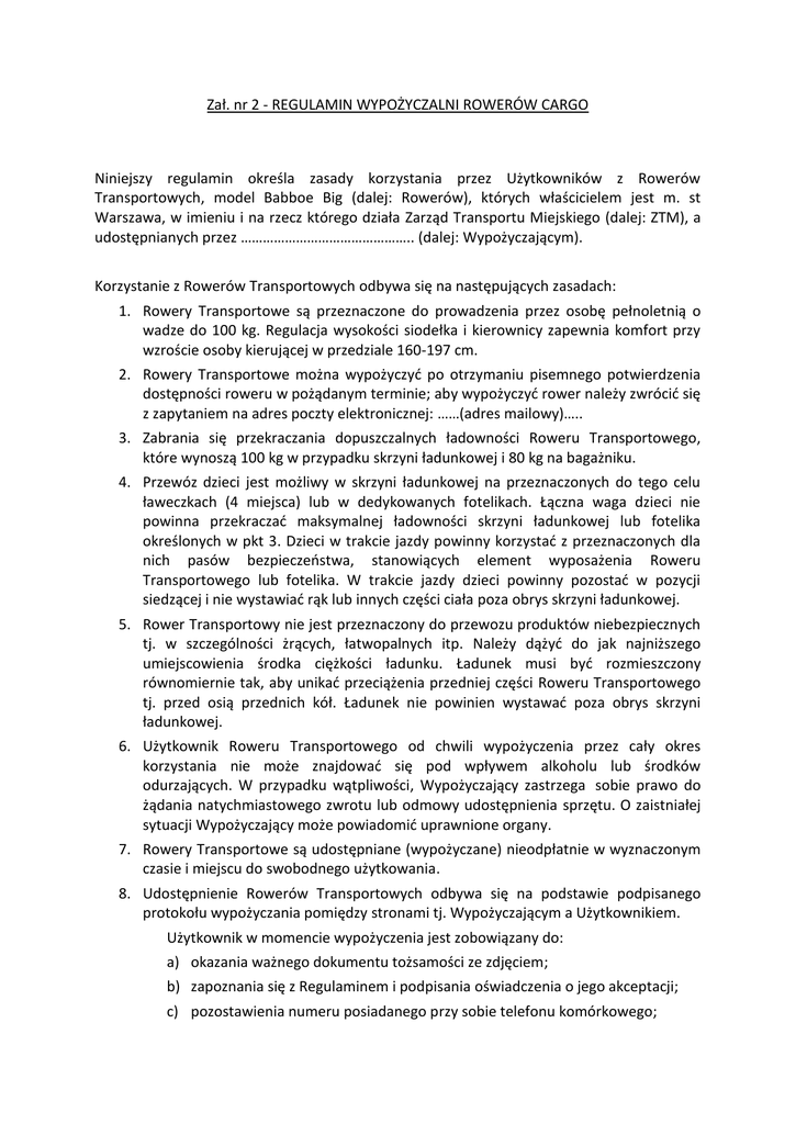 Zał. nr 2 - REGULAMIN WYPOŻYCZALNI ROWERÓW CARGO Niniejszy regulamin określa zasady korzystania przez Użytkowników z Rowerów Transportowych, model Babboe Big (dalej: Rowerów), których właścicielem jest m. st Warszawa, w imieniu i na rzecz którego działa Zarząd Transportu Miejskiego (dalej: ZTM), a udostępnianych przez ……………………………………….. (dalej: Wypożyczającym). Korzystanie z Rowerów Transportowych odbywa się na następujących zasadach: 1. Rowery Transportowe są przeznaczone do prowadzenia przez osobę pełnoletnią o wadze do 100 kg. Regulacja wysokości siodełka i kierownicy zapewnia komfort przy wzroście osoby kierującej w przedziale 160-197 cm. 2. Rowery Transportowe można wypożyczyć po otrzymaniu pisemnego potwierdzenia dostępności roweru w pożądanym terminie; aby wypożyczyć rower należy zwrócić się z zapytaniem na adres poczty elektronicznej: ……(adres mailowy)….. 3. Zabrania się przekraczania dopuszczalnych ładowności Roweru Transportowego, które wynoszą 100 kg w przypadku skrzyni ładunkowej i 80 kg na bagażniku. 4. Przewóz dzieci jest możliwy w skrzyni ładunkowej na przeznaczonych do tego celu ławeczkach (4 miejsca) lub w dedykowanych fotelikach. Łączna waga dzieci nie powinna przekraczać maksymalnej ładowności skrzyni ładunkowej lub fotelika określonych w pkt 3. Dzieci w trakcie jazdy powinny korzystać z przeznaczonych dla nich pasów bezpieczeństwa, stanowiących element wyposażenia Roweru Transportowego lub fotelika. W trakcie jazdy dzieci powinny pozostać w pozycji siedzącej i nie wystawiać rąk lub innych części ciała poza obrys skrzyni ładunkowej. 5. Rower Transportowy nie jest przeznaczony do przewozu produktów niebezpiecznych tj. w szczególności żrących, łatwopalnych itp. Należy dążyć do jak najniższego umiejscowienia środka ciężkości ładunku. Ładunek musi być rozmieszczony równomiernie tak, aby unikać przeciążenia przedniej części Roweru Transportowego tj. przed osią przednich kół. Ładunek nie powinien wystawać poza obrys skrzyni ładunkowej. 6. Użytkownik Roweru Transportowego od chwili wypożyczenia przez cały okres korzystania nie może znajdować się pod wpływem alkoholu lub środków odurzających. W przypadku wątpliwości, Wypożyczający zastrzega sobie prawo do żądania natychmiastowego zwrotu lub odmowy udostępnienia sprzętu. O zaistniałej sytuacji Wypożyczający może powiadomić uprawnione organy. 7. Rowery Transportowe są udostępniane (wypożyczane) nieodpłatnie w wyznaczonym czasie i miejscu do swobodnego użytkowania. 8. Udostępnienie Rowerów Transportowych odbywa się na podstawie podpisanego protokołu wypożyczania pomiędzy stronami tj. Wypożyczającym a Użytkownikiem. Użytkownik w momencie wypożyczenia jest zobowiązany do: a) okazania ważnego dokumentu tożsamości ze zdjęciem; b) zapoznania się z Regulaminem i podpisania oświadczenia o jego akceptacji; c) pozostawienia numeru posiadanego przy sobie telefonu komórkowego; d) wskazania planowanego czasu wypożyczenia Roweru Transportowego; czas korzystania z Roweru Transportowego nie może przekraczać 24 godzin; e) wskazania Wypożyczającemu trasy lub przybliżonego terenu, po którym będzie się poruszał na Rowerze Transportowym; f) zapoznania się z warunkami ubezpieczenia i złożenia oświadczenia o ich akceptacji. 9. Dane osobowe Użytkownika będą przetwarzane zgodnie z przepisami ustawy z dnia 29 sierpnia 1997 r. o ochronie danych osobowych (Dz.U. 1997 nr 133 poz. 883 ze zm.). Administratorem tych danych jest wyłącznie Wypożyczający. Dane osobowe Użytkowników będą przetwarzane w siedzibie Wypożyczającego dla celów związanych z wypożyczeniem Roweru. Podanie danych osobowych jest dobrowolne, jednak niezbędne dla celów związanych z wypożyczeniem Roweru. Użytkownik ma prawo wglądu w swoje dane, żądania ich poprawiania oraz usunięcia. Pismo z prośbą o usunięcie/zmianę danych powinno zostać wysłane na adres poczty elektronicznej: ………..………………………. lub listem poleconym na adres Wypożyczającego. 10. Użytkownik jest zobowiązany do: a) dbania o powierzony sprzęt, w tym o jego bezpieczeństwo (również w przypadku incydentalnego pozostawienia bez dozoru), należytego zabezpieczenia przeznaczonymi do tego akcesoriami tj. zapięcia, blokady itp. i właściwego przechowywania w przypadku wypożyczeń przekraczających 1 dzień; b) korzystania ze sprzętu zgodnie z jego przeznaczeniem; c) posiadania przy sobie przez cały czas korzystania z Roweru Transportowego sprawnego i aktywnego telefonu komórkowego wskazanego w punkcie poprzednim, jak też utrzymywania przy jego pomocy kontaktu z Wypożyczającym (przyjmowanie połączeń w czasie korzystania z Roweru, z zachowaniem zasad bezpieczeństwa w ruchu) d) przestrzegania obowiązujących przepisów ruchu drogowego, przepisów miejscowych i zaleceń Wypożyczającego; e) zobowiązuje się do pokrycia wszelkich mandatów, opłat itp. otrzymanych przez Użytkownika, związanych z korzystaniem z roweru. f) zwrotu Roweru Transportowego w określonym czasie i niepogorszonym w stosunku do stanu w jakim Rower został wydany; stanie g) poinformowania o wszelkich uszkodzeniach lub brakach w wypożyczonym Rowerze Transportowym; h) poinformowania o wszelkich szkodach zaistniałych z użyciem Roweru Transportowego w mieniu osób trzecich. i) pokrycia wszelkich kosztów napraw i odtworzenia sprzętu do stanu pierwotnego sprzed wypożyczenia w przypadku udowodnionych zniszczeń wynikłych z niewłaściwego użytkowania roweru. 11. Zabrania się Użytkownikowi udostępniania Roweru Transportowego osobom trzecim. 12. Użytkownik ponosi pełną odpowiedzialność materialną za powierzony Rower Transportowy i za szkody związane z korzystaniem z niego. Wartość ewentualnych szkód zaistniałych w Rowerze Transportowym określona będzie na podstawie danych wskazanych pr