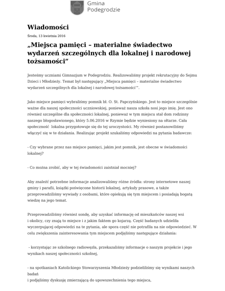 Wiadomości Środa, 13 kwietnia 2016 „Miejsca pamięci – materialne świadectwo wydarzeń szczególnych dla lokalnej i narodowej tożsamości” Jesteśmy uczniami Gimnazjum w Podegrodziu. Realizowaliśmy projekt rekrutacyjny do Sejmu Dzieci i Młodzieży. Temat był następujący „Miejsca pamięci – materialne świadectwo wydarzeń szczególnych dla lokalnej i narodowej tożsamości’”. Jako miejsce pamięci wybraliśmy pomnik bł. O. St. Papczyńskiego. Jest to miejsce szczególnie ważne dla naszej społeczności uczniowskiej, ponieważ nasza szkoła nosi jego imię. Jest ono również szczególne dla społeczności lokalnej, ponieważ w tym miejscu stał dom rodzinny naszego błogosławionego, który 5.06.2016 w Rzymie będzie wyniesiony na ołtarze. Cała społeczność lokalna przygotowuje się do tej uroczystości. My również postanowiliśmy włączyć się w te działania. Realizując projekt szukaliśmy odpowiedzi na pytania badawcze: - Czy wybrane przez nas miejsce pamięci, jakim jest pomnik, jest obecne w świadomości lokalnej? - Co można zrobić, aby w tej świadomości zaistniał mocniej? Aby znaleźć potrzebne informacje analizowaliśmy różne źródła: strony internetowe naszej gminy i parafii, książki poświęcone historii lokalnej, artykuły prasowe, a także przeprowadziliśmy wywiady z osobami, które opiekują się tym miejscem i posiadają bogatą wiedzę na jego temat. Przeprowadziliśmy również sondę, aby uzyskać informację od mieszkańców naszej wsi i okolicy, czy znają to miejsce i z jakim faktem go kojarzą. Część badanych udzieliła wyczerpującej odpowiedzi na te pytania, ale spora część nie potrafiła na nie odpowiedzieć. W celu zwiększenia zainteresowania tym miejscem podjęliśmy następujące działania: - korzystając ze szkolnego radiowęzła, przekazaliśmy informacje o naszym projekcie i jego wynikach naszej społeczności szkolnej, - na spotkaniach Katolickiego Stowarzyszenia Młodzieży podzieliliśmy się wynikami naszych badań i podjęliśmy dyskusję zmierzającą do upowszechnienia tego miejsca, - opracowaliśmy projekt zakładki do książki i widokówki, na której zamieściliśmy zdjęcie pomnika - zostały one rozdane uczniom naszej szkoły, a także przekazaliśmy je do miejscowego sklepu i Gminnego Ośrodka Kultury, - wykonaliśmy też plakat związany z pomnikiem naszego rodaka, który został umieszczony na tablicach ogłoszeń w naszej miejscowości. W związku ze zbliżającą się kanonizacją planujemy podjąć działania mające na celu umieszczenie na ogrodzeniu pomnika baneru z napisem „Miejsce narodzin św. O. Stanisława Papczyńskiego”. W zrealizowaniu tego planu liczymy na wsparcie naszego proboszcza, rady parafialnej i miejscowych władz. Patryk Olszak, Piotr Konstanty