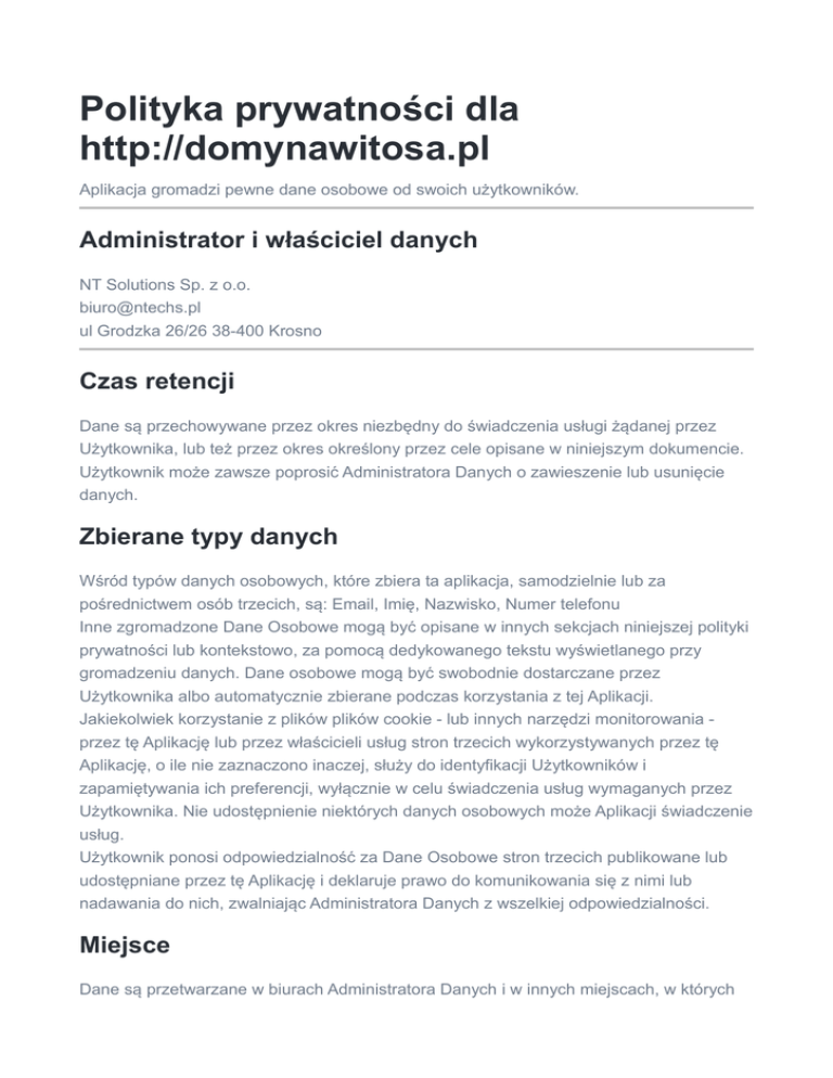 Polityka prywatności dla http://domynawitosa.pl Aplikacja gromadzi pewne dane osobowe od swoich użytkowników. Administrator i właściciel danych NT Solutions Sp. z o.o. [email protected] ul Grodzka 26/26 38-400 Krosno Czas retencji Dane są przechowywane przez okres niezbędny do świadczenia usługi żądanej przez Użytkownika, lub też przez okres określony przez cele opisane w niniejszym dokumencie. Użytkownik może zawsze poprosić Administratora Danych o zawieszenie lub usunięcie danych. Zbierane typy danych Wśród typów danych osobowych, które zbiera ta aplikacja, samodzielnie lub za pośrednictwem osób trzecich, są: Email, Imię, Nazwisko, Numer telefonu Inne zgromadzone Dane Osobowe mogą być opisane w innych sekcjach niniejszej polityki prywatności lub kontekstowo, za pomocą dedykowanego tekstu wyświetlanego przy gromadzeniu danych. Dane osobowe mogą być swobodnie dostarczane przez Użytkownika albo automatycznie zbierane podczas korzystania z tej Aplikacji. Jakiekolwiek korzystanie z plików plików cookie - lub innych narzędzi monitorowania przez tę Aplikację lub przez właścicieli usług stron trzecich wykorzystywanych przez tę Aplikację, o ile nie zaznaczono inaczej, służy do identyfikacji Użytkowników i zapamiętywania ich preferencji, wyłącznie w celu świadczenia usług wymaganych przez Użytkownika. Nie udostępnienie niektórych danych osobowych może Aplikacji świadczenie usług. Użytkownik ponosi odpowiedzialność za Dane Osobowe stron trzecich publikowane lub udostępniane przez tę Aplikację i deklaruje prawo do komunikowania się z nimi lub nadawania do nich, zwalniając Administratora Danych z wszelkiej odpowiedzialności. Miejsce Dane są przetwarzane w biurach Administratora Danych i w innych miejscach, w których znajdują się związane z przetwarzaniem strony. Aby uzyskać więcej informacji, należy skontaktować się z Administratorem Danych. Metody przetwarzania Administrator Danych przetwarza Dane Użytkowników w sposób prawidłowy i podejmuje odpowiednie środki bezpieczeństwa w celu ochrony przed nieuprawnionym dostępem, ujawnieniem, modyfikacją lub nieuprawnionym zniszczeniem danych. Przetwarzanie danych odbywa się za pomocą komputerów i/lub narzędzi IT, zgodnie z procedurami organizacyjnymi i sposobami ściśle związanymi ze wskazanymi celami. Poza Administratorem Danych, w niektórych przypadkach, dane mogą być dostępne dla określonych typów osób odpowiedzialnych za działania serwisu (administrację, sprzedaż, marketing, system prawny, administrację systemu) lub podmiotów zewnętrznych (takich jak dostawcy usług technicznych, listonosze, dostawcy hostingu, firmy informatyczne, agencje komunikacyjne) mianowanych, w razie potrzeby, Procesorami Danych przez Właściciela. Aktualny wykaz tych stron można uzyskać od Administratora Danych w każdej chwili. Wykorzystanie zgromadzonych danych Dane dotyczące Użytkownika są zbierane w celu umożliwienia Aplikacji świadczenia usług, jak również do następujących celów: Kontakt z Użytkownikiem. Dane Osobowe wykorzystywane do każdego celu są opisane w poszczególnych sekcjach niniejszego dokumentu. Informacje dotyczące przetwarzania danych osobowych Dane osobowe zebrane w następujących celach dla następujących usług: Kontakt z Użytkownikiem Formularz kontaktowy Poprzez wypełnienie formularza kontaktowego swoimi Danymi Użytkownicy upoważniają niniejszą Aplikację do używania tych danych do odpowiedzi na wnioski o informacje, wyceny lub innego rodzaju żądania wskazane na nagłówku formularza. Dostawca: Ta Aplikacja Cel: Kontakt z Użytkownikiem Dane osobowe: Email, Imię, Nazwisko, Numer telefonu Telefon kontaktowy Do Użytkowników, którzy udostępnią swój numer telefonu, mogą być wykonywane połączenia w celach komercyjnych lub promocyjnych związanych z niniejszą Aplikacją, a także w celu odpowiedzi na zapytania wsparcia. Dostawca: Ta Aplikacja Cel: Kontakt z Użytkownikiem Dane osobowe: Numer telefonu Dane dodatkowe na temat zbierania i przetwarzania danych Działania prawne Dane Osobowe Użytkownika mogą być wykorzystywane do celów prawnych przez Administratora Danych, w sądzie lub w działaniach prowadzących do możliwych działań prawnych wynikających z niewłaściwego stosowania tej Aplikacji lub związanych z nią usług. Użytkownik powinien być świadomy faktu, że Administrator Danych może być zobowiązany do ujawnienia Danych Osobowych na żądanie władz. Dodatkowe informacje o Danych Osobowych Użytkownika Oprócz informacji zawartych w niniejszej polityce prywatności, ta Aplikacja może zapewnić Użytkownikowi dodatkowe i kontekstowe informacje dotyczących określonych usług lub gromadzenia i przetwarzania Danych Osobowych na żądanie. Logi Systemowe i Konserwacja Do celów eksploatacji i konserwacji, ta aplikacja i wszelkie usługi przez stron trzecich mogą gromadzić pliki stanowiące zapis interakcji z tą Aplikacją (logi systemowe) lub użyć do tego celu innych Danych Osobowe (takich jak adres IP). Informacje nie zawarte w niniejszej polityce Więcej szczegółów dotyczących gromadzenia lub przetwarzania Danych Osobowych można uzyskać od Administratora Danych w dowolnym momencie. Informacje kontaktowe znaleźć można na początku niniejszego dokumentu. Prawa użytkowników Użytkownicy mają prawo w dowolnym momencie dowiedzieć się, czy ich Dane Osobowe były przechowywane i skonsultować się z Administratorem Danych, aby dowiedzieć się o ich zawartości i pochodzeniu w celu sprawdzenia ich dokładności lub żądania ich uzupełnienia, anulowania, aktualizacji lub poprawy, lub do ich przekształcenia do postaci anonimowej lub do zablokowania wszelkich danych przechowywanych z naruszeniem prawa, a także do sprzeciwienia się ich wykorzystaniu z wszelkich uzasadnionych powodów. Wnioski należy przesyłać do Administratora Danych, korzystając z informacji kontaktowych poda
