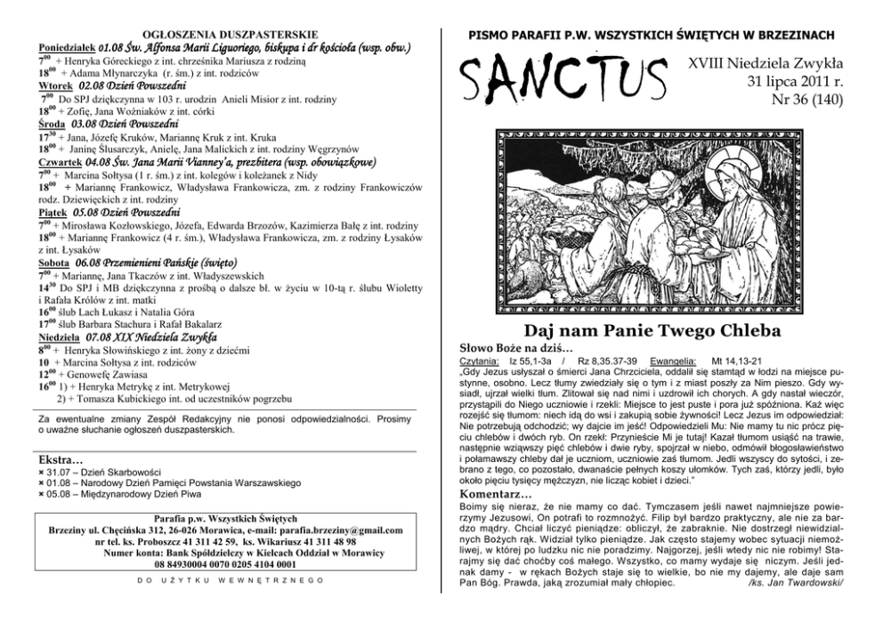 OGŁOSZENIA DUSZPASTERSKIE Poniedziałek 01.08 Św. Alfonsa Marii Liguoriego, biskupa i dr kościoła (wsp. obw.) 700 + Henryka Góreckiego z int. chrześnika Mariusza z rodziną 1800 + Adama Młynarczyka (r. śm.) z int. rodziców Wtorek 02.08 Dzień Powszedni 700 Do SPJ dziękczynna w 103 r. urodzin Anieli Misior z int. rodziny 1800 + Zofię, Jana Woźniaków z int. córki Środa 03.08 Dzień Powszedni 1730 + Jana, Józefę Kruków, Mariannę Kruk z int. Kruka 1800 + Janinę Ślusarczyk, Anielę, Jana Malickich z int. rodziny Węgrzynów Czwartek 04.08 Św. Jana Marii Vianney’a, prezbitera (wsp. obowiązkowe) 700 + Marcina Sołtysa (1 r. śm.) z int. kolegów i koleżanek z Nidy 1800 + Mariannę Frankowicz, Władysława Frankowicza, zm. z rodziny Frankowiczów rodz. Dziewięckich z int. rodziny Piątek 05.08 Dzień Powszedni 700 + Mirosława Kozłowskiego, Józefa, Edwarda Brzozów, Kazimierza Bałę z int. rodziny 1800 + Mariannę Frankowicz (4 r. śm.), Władysława Frankowicza, zm. z rodziny Łysaków z int. Łysaków Sobota 06.08 Przemienieni Przemienieni Pańskie (święto) 700 + Mariannę, Jana Tkaczów z int. Władyszewskich 1430 Do SPJ i MB dziękczynna z prośbą o dalsze bł. w życiu w 10-tą r. ślubu Wioletty i Rafała Królów z int. matki 1600 ślub Lach Łukasz i Natalia Góra 1700 ślub Barbara Stachura i Rafał Bakalarz Niedziela 07.08 XIX Niedziela Zwykła 800 + Henryka Słowińskiego z int. żony z dziećmi 10 + Marcina Sołtysa z int. rodziców 1200 + Genowefę Zawiasa 1600 1) + Henryka Metrykę z int. Metrykowej 2) + Tomasza Kubickiego int. od uczestników pogrzebu Za ewentualne zmiany Zespół Redakcyjny nie ponosi odpowiedzialności. Prosimy o uważne słuchanie ogłoszeń duszpasterskich. Ekstra… × 31.07 – Dzień Skarbowości × 01.08 – Narodowy Dzień Pamięci Powstania Warszawskiego × 05.08 – Międzynarodowy Dzień Piwa Parafia p.w. Wszystkich Świętych Brzeziny ul. Chęcińska 312, 26-026 Morawica, e-mail: [email protected] nr tel. ks. Proboszcz 41 311 42 59, ks. Wikariusz 41 311 48 98 Numer konta: Bank Spółdzielczy w Kielcach Oddział w Morawicy 08 84930004 0070 0205 4104 0001 D O U Ż Y T K U W E W N Ę T R Z N E G O PISMO PARAFII P.W. WSZYSTKICH ŚWIĘTYCH W BRZEZINACH SANC SANCTUS XVIII Niedziela Zwykła 31 lipca 2011 r. Nr 36 (140) Daj nam Panie Twego Chleba Słowo Boże na dziś… Czytania: Iz 55,1-3a / Rz 8,35.37-39 Ewangelia: Mt 14,13-21 „Gdy Jezus usłyszał o śmierci Jana Chrzciciela, oddalił się stamtąd w łodzi na miejsce pustynne, osobno. Lecz tłumy zwiedziały się o tym i z miast poszły za Nim pieszo. Gdy wysiadł, ujrzał wielki tłum. Zlitował się nad nimi i uzdrowił ich chorych. A gdy nastał wieczór, przystąpili do Niego uczniowie i rzekli: Miejsce to jest puste i pora już spóźniona. Każ więc rozejść się tłumom: niech idą do wsi i zakupią sobie żywności! Lecz Jezus im odpowiedział: Nie potrzebują odchodzić; wy dajcie im jeść! Odpowiedzieli Mu: Nie mamy tu nic prócz pięciu chlebów i dwóch ryb. On rzekł: Przynieście Mi je tutaj! Kazał tłumom usiąść na trawie, następnie wziąwszy pięć chlebów i dwie ryby, spojrzał w niebo, odmówił błogosławieństwo i połamawszy chleby dał je uczniom, uczniowie zaś tłumom. Jedli wszyscy do sytości, i zebrano z tego, co pozostało, dwanaście pełnych koszy ułomków. Tych zaś, którzy jedli, było około pięciu tysięcy mężczyzn, nie licząc kobiet i dzieci.” Komentarz… Boimy się nieraz, że nie mamy co dać. Tymczasem jeśli nawet najmniejsze powierzymy Jezusowi, On potrafi to rozmnożyć. Filip był bardzo praktyczny, ale nie za bardzo mądry. Chciał liczyć pieniądze: obliczył, że zabraknie. Nie dostrzegł niewidzialnych Bożych rąk. Widział tylko pieniądze. Jak często stajemy wobec sytuacji niemożliwej, w której po ludzku nic nie poradzimy. Najgorzej, jeśli wtedy nic nie robimy! Starajmy się dać choćby coś małego. Wszystko, co mamy wydaje się niczym. Jeśli jednak damy - w rękach Bożych staje się to wielkie, bo nie my dajemy, ale daje sam Pan Bóg. Prawda, jaką zrozumiał mały chłopiec. /ks. Jan Twardowski/ A w parafii… Boży człowiek… - św. Kajetan (7 sierpnia) ▪ W ubiegłą niedzielę została odprawiona msza św. w kaplicy w Nidzie. ▪ 27 lipca swoje 103 urodziny obchodziła pani Aniela Misior – najstarsza mieszkanka Brzezin. Z tej okazji życzymy jej błogosławieństwa Bożego i kolejnych szczęśliwych lat życia. ▪ W dniach 30-31 lipca mija trzecia rocznica peregrynacji Obrazu Matki Bożej Częstochowskiej w naszej parafii. Bądź z nami w każdy czas! ▪ Dziś po każdej mszy świętej odbywa się na parkingach przykościelnych poświęcenie pojazdów. Św. Krzysztofie módl się za nami! ▪ W poniedziałek odbędzie się odbiór prac konserwatorskich przy chórze. ▪ Zapraszamy do zakrystii po odbiór kart na Pieszą Pielgrzymkę Kielecką ▪ 21 sierpnia pani Irena Gola organizuje pielgrzymkę autokarową na Jasną Górę. W programie przewidziano także zwiedzanie sanktuariów maryjnych w Gidlach i Piekoszowie. Prosimy o zgłaszanie się telefoniczne do organizatorki wyjazdu. Intencja różańcowa na sierpień „Uśmiech „U miech Jana Pawła II” ogólna: Aby Światowy Dzień Młodzieży, który od- 3. Kiedy Kardynał Karol Wojtyła przylebywa się w Madrycie, był dla wszystkich młodych ciał z Polski do Rzymu, ażeby wziąć ludzi na świecie zachętą do tego, by swe życie złą- udział w kolejnym konklawe, wtedy peczyli i budowali z Chrystusem. wien fotoreporter włoski zrobił mu na lotmisyjna: Aby chrześcijanie krajów zachodnich byli nisku kilkanaście zdjęć. Kardynał zwrócił otwarci na działanie Ducha Świętego i na nowo do- się do fotografa ze słowami: „Po cóż mi świadczyli świeżości i entuzjazmu swej wiary. pan robi tyle zdjęć? Nie sądzi pan chyba, że to ja mógłbym zostać nowym papieZ życia wsi… żem?” Potem położył rękę na ra