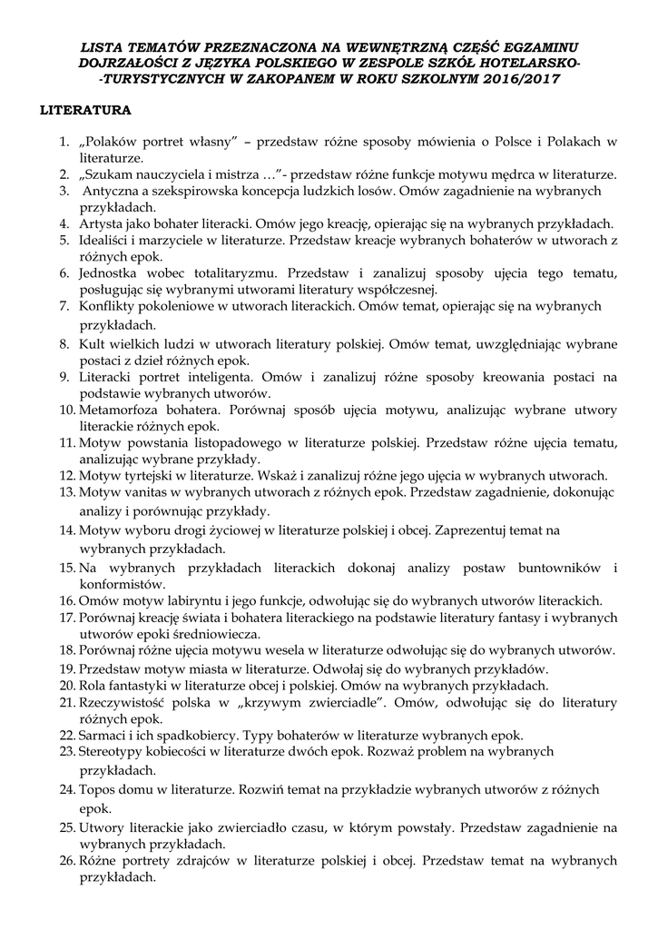 LISTA TEMATÓW PRZEZNACZONA NA WEWNĘTRZNĄ CZĘŚĆ EGZAMINU DOJRZAŁOŚCI Z JĘZYKA POLSKIEGO W ZESPOLE SZKÓŁ HOTELARSKO-TURYSTYCZNYCH W ZAKOPANEM W ROKU SZKOLNYM 2016/2017 LITERATURA 1. „Polaków portret własny” – przedstaw różne sposoby mówienia o Polsce i Polakach w literaturze. 2. „Szukam nauczyciela i mistrza …”- przedstaw różne funkcje motywu mędrca w literaturze. 3. Antyczna a szekspirowska koncepcja ludzkich losów. Omów zagadnienie na wybranych przykładach. 4. Artysta jako bohater literacki. Omów jego kreację, opierając się na wybranych przykładach. 5. Idealiści i marzyciele w literaturze. Przedstaw kreacje wybranych bohaterów w utworach z różnych epok. 6. Jednostka wobec totalitaryzmu. Przedstaw i zanalizuj sposoby ujęcia tego tematu, posługując się wybranymi utworami literatury współczesnej. 7. Konflikty pokoleniowe w utworach literackich. Omów temat, opierając się na wybranych przykładach. 8. Kult wielkich ludzi w utworach literatury polskiej. Omów temat, uwzględniając wybrane postaci z dzieł różnych epok. 9. Literacki portret inteligenta. Omów i zanalizuj różne sposoby kreowania postaci na podstawie wybranych utworów. 10. Metamorfoza bohatera. Porównaj sposób ujęcia motywu, analizując wybrane utwory literackie różnych epok. 11. Motyw powstania listopadowego w literaturze polskiej. Przedstaw różne ujęcia tematu, analizując wybrane przykłady. 12. Motyw tyrtejski w literaturze. Wskaż i zanalizuj różne jego ujęcia w wybranych utworach. 13. Motyw vanitas w wybranych utworach z różnych epok. Przedstaw zagadnienie, dokonując analizy i porównując przykłady. 14. Motyw wyboru drogi życiowej w literaturze polskiej i obcej. Zaprezentuj temat na wybranych przykładach. 15. Na wybranych przykładach literackich dokonaj analizy postaw buntowników i konformistów. 16. Omów motyw labiryntu i jego funkcje, odwołując się do wybranych utworów literackich. 17. Porównaj kreację świata i bohatera literackiego na podstawie literatury fantasy i wybranych utworów epoki średniowiecza. 18. Porównaj różne ujęcia motywu wesela w literaturze odwołując się do wybranych utworów. 19. Przedstaw motyw miasta w literaturze. Odwołaj się do wybranych przykładów. 20. Rola fantastyki w literaturze obcej i polskiej. Omów na wybranych przykładach. 21. Rzeczywistość polska w „krzywym zwierciadle”. Omów, odwołując się do literatury różnych epok. 22. Sarmaci i ich spadkobiercy. Typy bohaterów w literaturze wybranych epok. 23. Stereotypy kobiecości w literaturze dwóch epok. Rozważ problem na wybranych przykładach. 24. Topos domu w literaturze. Rozwiń temat na przykładzie wybranych utworów z różnych epok. 25. Utwory literackie jako zwierciadło czasu, w którym powstały. Przedstaw zagadnienie na wybranych przykładach. 26. Różne portrety zdrajców w literaturze polskiej i obcej. Przedstaw temat na wybranych przykładach. 27. Zaprezentuj różne sposoby wyrażania miłości, odwołując się do utworów literackich z różnych epok. 28. Dwór szlachecki w różnych tekstach literackich. Omów temat na wybranych przykładach. 29. Idealizacja ojczyzny a jej rzeczywiste obrazy. Przedstaw zagadnienie, analizując wybrane dzieła literackie. 30. Omów i zanalizuj funkcjonowanie motywu dobra i zła w różnych tekstach literackich. 31. Przedstaw i zanalizuj funkcjonowanie motywów franciszkańskich w literaturze wybranych epok. 32. Sposoby funkcjonowania motywu rozstania w różnych tekstach literackich. Rozważ zagadnienie, analizując wybrane przykłady. 33. Zaprezentuj bohaterów wyjętych spod prawa w wybranych tekstach literackich różnych epok. ZWIĄZKI LITERATURY Z INNYMI DZIEDZINAMI SZTUKI 1. Omów motyw powstania styczniowego i różne jego ujęcia w wybranych tekstach kultury. 2. Barokowe motywy w różnych tekstach kultury. Przedstaw charakterystyczne cechy, analizując wybrane przykłady. 3. Brzydota w literaturze i malarstwie jako kategoria estetyczna. Omów funkcjonowanie tego motywu, odwołując się do wybranych przykładów. 4. Góry w literaturze i sztuce. Ukaż sposoby ich obrazowania i funkcje, jakie pełnią. 5. Krajobraz wiejski w różnych tekstach kultury. Omów i zanalizuj różnorodność kreacji, odwołując się do wybranych dzieł. 6. Omów motyw powstania warszawskiego w literaturze i filmie, opierając się na analizie wybranych przykładów. 7. Omów motyw snu, odwołując się do przykładów z literatury i sztuki. 8. Porównaj różne wcielenia diabła w literaturze i sztuce, a także omów ich funkcję w wybranych tekstach kultury. 9. Przedstaw różne oblicza rewolucji ukazane w literaturze i innych sztukach (np. malarstwo, film). 10. Różne rozumienie wolności. Przedstaw motyw odwołując się do wybranych tekstów kultury. 11. Różnorodne ujęcia motywu ogrodu w literaturze i sztuce. Przedstaw zagadnienie na wybranych przykładach. 12. Rycerz i rycerska walka. Przedstaw sposoby ujęcia motywu na wybranych przykładach z różnych tekstów kultury. 13. Stroje bohaterów literackich i postaci przedstawionych na obrazach jako element charakterystyki bohatera. Omów na wybranych przykładach. 14. Surrealizm w sztuce i literaturze. Omów na wybranych przykładach. 15. Uczty i biesiady jako motyw nie tylko literacki. Omów jego funkcje na podstawie różnych tekstów kultury. 16. Władca i władza jako temat literatury i innych tekstów kultury. Odwołaj się do wybranych przykładów z różnych epok. 17. Współczesne (różne) interpretacje dramatów Szekspira – teatr żywego planu, teatr telewizji, adaptacje filmowe. Omów zagadnienie odwołując się do wybranych przykładów. 18. Zaprezentuj różne sposoby ukazywania II wojny światowej na przykładzie literatury i filmu. 19. Znaczenie tańca i muzyki w wybranych dziełach literackich, filmowych i malarskich. 20. Związki literatury i malarstwa w wybranej epoce. Przedstaw zagadnienie w oparciu o różne przykł