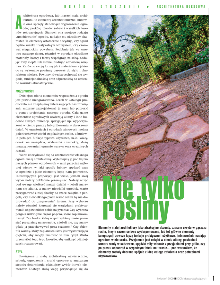 O G R Ó D I O T O C Z E N I E ARCHITEKTURA OGRODOWA rchitektura ogrodowa, lub inaczej ma∏a architektura, to elementy architektoniczne, budowle oraz sprz´ty stanowiàce wyposa˝enie ogrodów, parków, placów zabaw i wszelkich terenów rekreacyjnych. Stanowi ona swojego rodzaju „umeblowanie” ogrodu, nadajàc mu okreÊlony charakter. Te elementy ostatecznie decydujà, czy ogród b´dzie urzeka∏ rustykalnym wdzi´kiem, czy czarowa∏ eleganckim powabem. Podobnie jak we wn´trzu naszego domu, równie˝ w ogrodzie okreÊlone materia∏y, barwy i formy wspó∏grajà ze sobà, nadajàc tony ciep∏e lub zimne, budujàc atmosfer´ wn´trza. Zarówno swojà formà jak i materia∏em z jakiego sà wykonane powinny pasowaç do stylu i charakteru miejsca. Powinny równie˝ cechowaç si´ wygodà, funkcjonalnoÊcià oraz odpornoÊcià na zmienne warunki atmosferyczne. A Dzisiejsza oferta elementów wyposa˝enia ogrodu jest prawie nieograniczona. Je˝eli w katalogu producenta nie znajdujemy interesujàcych nas rozwiàzaƒ, mo˝emy zaprojektowaç je sami lub poprosiç o pomoc projektanta naszego ogrodu. Ca∏à gam´ elementów ogrodowych otwierajà altany i inne budowle s∏u˝àce rekreacji, sprzyjajàce np. wypoczynkowi w cieniu pnàczy lub grillowaniu w deszczowy dzieƒ. W oran˝eriach i ogrodach zimowych mo˝na poleniuchowaç wÊród tropikalnych roÊlin, a budowle pe∏niàce funkcje typowo u˝ytkowe, m.in. wiaty, domki na narz´dzia, szklarenki i inspekty, s∏u˝à magazynowaniu i uprawie warzyw oraz wra˝liwych rozsad. Warto zdecydowaç si´ na urozmaicenie w∏asnego ogrodu ma∏à architekturà. Wybierajmy jà pod kàtem naszych planów ogrodowych – sami przecie˝ najlepiej wiemy, w jaki sposób lubimy sp´dzaç czas w ogrodzie i jakie elementy b´dà nam potrzebne. Interesujàcych propozycji jest wiele, jednak swój wybór nale˝y dok∏adnie przemyÊleç. Nale˝y wziàç pod uwag´ wielkoÊç naszej dzia∏ki – je˝eli marzy nam si´ altana, a mamy niewielki ogródek, warto zrezygnowaç z niej choçby na rzecz zakàtka z pergolà, czy niewielkiego placu wÊród roÊlin by nie doprowadziç do „zagracenia” terenu. Przy wyborze nale˝y równie˝ kierowaç si´ wzgl´dami praktycznymi i odpowiedzieç sobie na pytania: Czy wybrana pergola udêwignie ci´˝ar pnàcza, które zaplanowaliÊmy? Czy ∏awka którà wypatrzyliÊmy mo˝e pozostaç przez zim´ na zewnàtrz, a je˝eli nie, czy mamy gdzie jà przechowywaç poza sezonem? Czy zbiornik wodny, który zaplanowaliÊmy jest wystarczajàco g∏´boki, aby mog∏y zimowaç w nim ryby? Warto przemyÊleç tego typu kwestie, aby uniknàç póêniejszych rozczarowaƒ. STYL Powiàzane z ma∏à architekturà nawierzchnie, schody, ogrodzenia i murki oporowe w znacznym stopniu determinujà póêniejszy wybór innych elementów. Dlatego du˝à wag´ przywiàzuje si´ do Nie tylko roÊliny Fot. Alexey Stiop – Fotolia.com MO˚LIWOÂCI Elementy ma∏ej architektury jako atrakcyjne akcenty, czasem ukryte w gàszczu roÊlin, innym razem celowo wyeksponowane, lub te˝ g∏ówne elementy kompozycji, zawsze ∏àczà funkcje praktyczne i u˝ytkowe, jednoczeÊnie nadajàc ogrodom wiele uroku. Przyjemnie jest usiàÊç w cieniu altany, pos∏uchaç szmeru wody w sadzawce, sp´dziç mi∏y wieczór z przyjació∏mi przy grillu, czy po prostu odpoczàç w wygodnym fotelu na tarasie… pod warunkiem, ˝e elementy zosta∏y dobrane spójnie z ideà ca∏ego za∏o˝enia oraz potrzebami u˝ytkowników. kwiecieƒ 2009 DOM dla poczàtkujàcych 1 O G R Ó D I O T O C Z E N I E ARCHITEKTURA OGRODOWA proste, drewniane meble i klasyczna altana oraz masywny, kamienny grill ogrodowy. Dope∏nieniem ogrodu w stylu angielskim mogà byç natomiast Êcie˝ki ze ˝wiru lub ceg∏y, kute bramki i pergole pod kwitnàce pnàcza oraz ˝eliwne meble ogrodowe. Nowoczesny ogród potrzebuje awangardowych rozwiàzaƒ – tu mogà pojawiç si´ proste formy odlane z betonu utrzymane w mocnej kolorystyce, akcenty ze szk∏a i aluminium oraz nieskomplikowane nawierzchnie z du˝ych p∏yt. MATERIA¸Y zintegrowanego projektowania wszystkich elementów, przechodzàc od g∏ównego stylu za∏o˝enia, szkieletu kompozycji i planu funkcjonalnego do doboru materia∏ów i elementów ma∏ej architektury. Wszystkie wspomniane elementy przybierajà rozmaite formy od najprostszych po awangardowe i artystyczne. Wybór zale˝y w∏aÊnie od stylu ogrodu, sposobu jego u˝ytkowania i oczywiÊcie upodobaƒ w∏aÊcicieli. Wa˝ne, aby utrzymaç ca∏oÊç w podobnym stylu, nawiàzujàcym do architektury i kolorystyki domu, uk∏adu oraz charakteru roÊlinnoÊci. Je˝eli decydujemy si´ na rustykalny, lekki styl, doskona∏e b´dà elementy drewniane w po∏àczeniu z kamieniem: np. nieregularna nawierzchnia z naturalnych (najlepiej wyst´pujàcych w okolicy) ska∏, Projekt nawierzchni z p∏yt kamiennych przygotowany z myÊlà o aran˝acji otoczenia domu wybudowanego wed∏ug projektu Dom w tymianku Biura Projektów Archon +. Jak kupiç? Wspó∏czesna architektura ogrodowa wykonywana jest z wielu ró˝norodnych produktów po∏àczonych na ró˝ne sposoby. Tradycyjnymi i najcz´Êciej wykorzystywanymi materia∏ami sà drewno, kamieƒ, ceg∏a i ˝eliwo. Powodem ich popularnoÊci jest trwa∏oÊç (za wyjàtkiem drewna, które wymaga regularnej impregnacji), dost´pnoÊç oraz atrakcyjny wyglàd wykonanych z danego materia∏u elementów. Z kamienia i ceg∏y wykonuje si´ nawierzchnie, murki oraz ró˝nego typu wykoƒczenia i podmurówki. ˚eliwo i drewno wykorzystuje si´ do budowy mebli, budowli ogrodowych oraz ró˝nego typu podpór i konstrukcji. Nale˝y jednak pami´taç, ˝e nie ka˝dy rodzaj drewna, kamienia, czy ceg∏y nadaje si´ do wykorzystania w ogrodzie w okreÊlonym celu. PowinniÊmy najpierw sprawdziç jakimi w∏aÊciwoÊciami oraz odpornoÊcià on si´ charakteryzuje. Niektóre rodzaje kamienia sà zbyt Êliskie, lub zbyt ∏atwo si´ Êcierajà aby mog∏y s∏u˝y