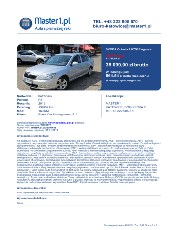 TEL. +48 222 905 570 [email protected] SKODA Octavia 1.8 TSI Elegance PROMOCJA 43 399,00 zł 35 099,00 zł brutto W leasingu już: 564.54 zł netto miesięcznie 36 miesięcy, opłata wstępna 10% Nadwozie: Paliwo: Rocznik: Przebieg: Moc: Firma: hatchback PB 2012 139952 km 160 KM Prime Car Management S.A. Lokalizacja: MASTER1 KATOWICE, BOGUCICKA 7 tel. +48 222 905 570 Sprawdź bezpłatnie auto na historiapojazdu.gov.pl podając: Numer rejestracyjny: WD7397E Numer VIN: TMBBK61Z3D2091648 Datę pierwszej rejestracji: 28.11.2012 Wyposażenie standardowe: 4/5 zagłówki, ABS - system zapobiegający blokowaniu się kół podczas hamowania, ACS - system pokolizyjny, ASR - system optymalizacji przyczepności podczas przyspieszania, Airbag 6 sztuk, Czujnik odległości przy parkowaniu - przód, Czujnik odległości przy parkowaniu - tył, DSR - system podpowiedzi ruchu kierownicą, EBV - elektroniczny rozdział sił hamowania, EDS elektroniczna blokada mechanizmu różnicowego, ESP - system stabilizacji toru jazdy, El. podnoszenie szyb, przód i tył, Felgi aluminiowe 16 CRATERIS z ogumieniem 205/55, Fotel kierowcy z manualną regulacją wysokości, Fotele przednie z regulacją lędźwiową + regulacja wysokości fotela pasażera, HBA - hydrauliczny system wspomagania nagłego hamowania, Immobilizer, Instalacja radiowa + 8 głośników, Kierownica wielofunkcyjna, skórzana z obsługą radia, Kierunkowskazy w obudowie lusterek zewnętrznych, Kieszenie w drzwiach przednich, Kieszenie w drzwiach tylnych, Kieszenie w oparciach foteli przednich, Klamki wewnętrzne chromowane, Klimatyzacja automatyczna Climatronic, Kolumna kierownicy regulowana w pionie/poziomie, Komputer pokładowy, Lampki do czytania - przód, Listwy boczne w kolorze nadwozia, Lusterka boczne regulowane elektrycznie i podgrzewane, Lusterka boczne składane elektrycznie, Lusterka i klamki w kolorze nadwozia, MSR - układ przeciwblokujący przy hamowaniu silnikiem, Pasy bezpieczeństwa z regulacją wysokości i napinaczami - przód, Podłokietnik Jumbo Box z chłodzonym schowkiem, Radio Skoda Auto Swing CD/MP3, Schowek na okulary, Schowek pod fotelem pasażera, Schowki w obudowie foteli przednich, Siatka w komorze bagażnika, Spryskiwacze lamp przednich, Sygnalizacja niezamkniętych drzwi i pokrywy bagażnika, Sygnalizacja niezapiętego pasa bezpieczeństwa kierowcy, Szyby barwione, Tapicerka materiałowa, Tempomat, Termometr zewnętrzny, Tylne oparcie składane, dzielone, Tylny podłokietnik ze schowkiem, Uchwyty ISOFIX na tylnych siedzeniach, Uchwyty na butelki w drzwiach przednich, Uchwyty na kubki z przodu, Uchwyty na kwity parkingowe, Wspomaganie układu kierowniczego, Wyłącznik poduszki powietrznej, Wyświetlacz Maxi-DOT, Zamek centralny z pilotem, Światła przeciwmgielne Wyposażenie dealerskie: Koło zapasowe pełnowymiarowe, Lakier metalik Wyposażenie dodatkowe: Alarm Opis wygenerowano 28.02.2017 o 12:02 Strona 1 z 2 Master1 to punkt sprzedaży samochodów Masterlease, pierwszego właściciela. Wszystkie auta zostały zakupione w polskim salonie, posiadają wycenę rzeczoznawcy, były regularnie serwisowane podczas użytkowania i posiadają udokumentowaną historię zdarzeń serwisowych. W Master1.pl znajdziecie Państwo szeroki wachlarz ubezpieczeń komunikacyjnych. Nasza oferta skierowana jest zarówno do klientów indywidualnych jak i firm. Wszelkich formalności można dokonać na miejscu. Opis wygenerowano 28.02.2017 o 12:02 Strona 2 z 2