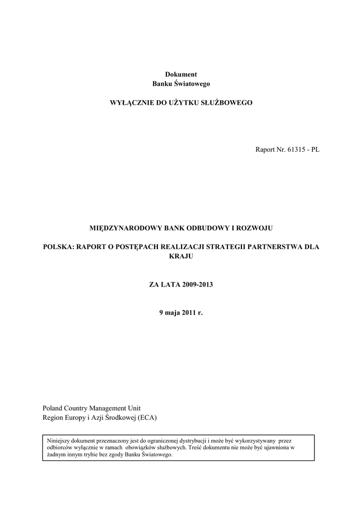 Dokument Banku Światowego WYŁĄCZNIE DO UŻYTKU SŁUŻBOWEGO Raport Nr. 61315 - PL MIĘDZYNARODOWY BANK ODBUDOWY I ROZWOJU POLSKA: RAPORT O POSTĘPACH REALIZACJI STRATEGII PARTNERSTWA DLA KRAJU ZA LATA 2009-2013 9 maja 2011 r. Poland Country Management Unit Region Europy i Azji Środkowej (ECA) Niniejszy dokument przeznaczony jest do ograniczonej dystrybucji i może być wykorzystywany przez odbiorców wyłącznie w ramach obowiązków służbowych. Treść dokumentu nie może być ujawniona w żadnym innym trybie bez zgody Banku Światowego. RZECZPOSPOLITA POLSKA RAPORT O POSTĘPACH REALIZACJI STRATEGII PARTNERSTWA DLA KRAJU KURSY WALUT (kurs wymiany walut z lutego 2011 roku) Jednostka walutowa: 1,0 USD 2,8 PLN 1,0 EUR 3,97 PLN ROK FISKALNY 1 lipca – 30 czerwca WYKAZ SKRÓTÓW I AKRONIMÓW UŻYTYCH W TEKŚCIE BGK CEB DNB DPL EBI ESW GEF IFC MBOiR MEK MFW MIGA OFE PISA PKB PWP RF SPK UE Bank Gospodarstwa Krajowego Bank Rozwoju Rady Europy (Council of Europe Development Bank) Dochód Narodowy Brutto Pożyczka na realizację polityki rozwojowej (Development Policy Loan) Europejski Bank Inwestycyjny Prace ekonomiczne i sektorowe (Economic and Sector Work) Global Environment Facility International Finance Corporation Międzynarodowy Bank Odbudowy i Rozwoju Memorandum Ekonomiczne dla Kraju Międzynarodowy Fundusz Walutowy Wielostronna Agencja Gwarancji Inwestycyjnych (Multilateral Investment Guarantee Agency) Otwarte Fundusze Emerytalne Program Międzynarodowej Oceny Umiejętności Uczniów Produkt Krajowy Brutto Przegląd Wydatków Publicznych Rok fiskalny Strategia Partnerstwa dla Kraju Unia Europejska Vice President Country Director Task Team Leader Philippe Le Houérou Peter Harrold Thomas Blatt Laursen Raport o postępach realizacji SPK został sporządzony przez zespół pracowników Banku Światowego pod kierownictwem Thomasa Laursena i ogólnym nadzorem Petera Harrolda. Przygotowanie Raportu było pracą zespołową; w jego sporządzenie włączeni byli Kaspar Richter, Ewa Korczyc, Janet Dooley, Emilia Skrok, Anna Bokina, Elisabetta Capannelli, Radoslaw Czapski, Gary Stuggins, Charles Griffin, John Pollner, Iwona Warzecha, Alberto Rodriguez, Nina Arnhold, Leszek Kąsek, Kirsten Propst, Natasha Kapil, Jan Rutkowski, Valentina Martinovic, Katarzyna Popielarska, Cathy Summers, a także inni członkowie zespołu Banku Światowego w Polsce. Autorzy pragną wyrazić wdzięczność przedstawicielom Rządu za ich współpracę przy sporządzaniu niniejszego Raportu. Spis treści 1 Wstęp...................................................................................................................................... 1 2 Najnowsze wydarzenia polityczne i gospodarcze ............................................................... 2 2.1 Wydarzenia polityczne...................................................................................................... 2 2.2 Wydarzenia gospodarcze.................................................................................................. 3 3 Realizacja programu i stopień jej zaawansowania ............................................................ 4 3.1 Realizacja programu ........................................................................................................ 4 3.2 Postęp i dotychczasowe wyniki ........................................................................................ 9 Filar 1: Integracja społeczna i przestrzenna ................................................................................ 9 Filar 2: Reforma sektora publicznego ....................................................................................... 10 Filar 3: Rozwój i konkurencyjność ........................................................................................... 10 Filar 4: Regionalne i globalne dobra publiczne ........................................................................ 11 4. Modyfikacje SPK i kluczowe problemy związane z partnerską współpracą ................ 12 4.1 Nowe obszary współpracy .............................................................................................. 12 4.2 Program ogólny.............................................................................................................. 13 4.3 Zaangażowanie we współpracę z samorządami............................................................. 14 4.4 Rozwój usług odpłatnych................................................................................................ 14 4.5 Zamknięcie statusu beneficjenta (Graduation) .............................................................. 15 5. Ryzyka .................................................................................................................................. 16 Aneks 1: Polska: zestawienie wyników SPK na lata 2009-2013 ...................................... 17 Aneks 2: Raport o postępach w podziale na filary i nowe obszary współpracy ............... 35 Aneks 3: Plan działań w zakresie współpracy z samorządami (SCAP) na lata 2010-2012 r. ........................................................................................................................................ 39 Aneks 4: Podsumowanie ostatnio realizowanych kluczowych strategicznych prac analitycznych .................................................................................................................... 43 Aneks 4a: Przejście Polski na gospodarkę niskoemisyjną................................................ 43 Aneks 4b: Dokument Transport Policy Note – w kierunku zrównoważonego sektora transportu lądowego .......................................................................................................... 45 Aneks 4c: Analiza wydatków w sektorze społecznym i płac w sektorze publicznym, zawarta w Przeglądzie Wydatków Publicznych dla Polski .............................................. 47 Aneks 4d: Europa 2020 a Polska-- Stymulowanie rozwoju i konkurency