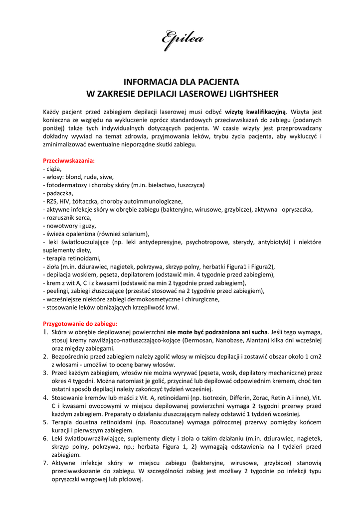 Epilea INFORMACJA DLA PACJENTA W ZAKRESIE DEPILACJI LASEROWEJ LIGHTSHEER Każdy pacjent przed zabiegiem depilacji laserowej musi odbyć wizytę kwalifikacyjną. Wizyta jest konieczna ze względu na wykluczenie oprócz standardowych przeciwwskazań do zabiegu (podanych poniżej) także tych indywidualnych dotyczących pacjenta. W czasie wizyty jest przeprowadzany dokładny wywiad na temat zdrowia, przyjmowania leków, trybu życia pacjenta, aby wykluczyć i zminimalizować ewentualne nieporządne skutki zabiegu. Przeciwwskazania: - ciąża, - włosy: blond, rude, siwe, - fotodermatozy i choroby skóry (m.in. bielactwo, łuszczyca) - padaczka, - RZS, HIV, żółtaczka, choroby autoimmunologiczne, - aktywne infekcje skóry w obrębie zabiegu (bakteryjne, wirusowe, grzybicze), aktywna opryszczka, - rozrusznik serca, - nowotwory i guzy, - świeża opalenizna (również solarium), - leki światłouczulające (np. leki antydepresyjne, psychotropowe, sterydy, antybiotyki) i niektóre suplementy diety, - terapia retinoidami, - zioła (m.in. dziurawiec, nagietek, pokrzywa, skrzyp polny, herbatki Figura1 i Figura2), - depilacja woskiem, pęseta, depilatorem (odstawić min. 4 tygodnie przed zabiegiem), - krem z wit A, C i z kwasami (odstawić na min 2 tygodnie przed zabiegiem), - peelingi, zabiegi złuszczające (przestać stosować na 2 tygodnie przed zabiegiem), - wcześniejsze niektóre zabiegi dermokosmetyczne i chirurgiczne, - stosowanie leków obniżających krzepliwość krwi. Przygotowanie do zabiegu: 1. Skóra w obrębie depilowanej powierzchni nie może być podrażniona ani sucha. Jeśli tego wymaga, stosuj kremy nawilżająco-natłuszczająco-kojące (Dermosan, Nanobase, Alantan) kilka dni wcześniej oraz między zabiegami. 2. Bezpośrednio przed zabiegiem należy zgolić włosy w miejscu depilacji i zostawić obszar około 1 cm2 z włosami - umożliwi to ocenę barwy włosów. 3. Przed każdym zabiegiem, włosów nie można wyrywać (pęseta, wosk, depilatory mechaniczne) przez okres 4 tygodni. Można natomiast je golić, przycinać lub depilować odpowiednim kremem, choć ten ostatni sposób depilacji należy zakończyć tydzień wcześniej. 4. Stosowanie kremów lub maści z Vit. A, retinoidami (np. Isotrexin, Differin, Zorac, Retin A i inne), Vit. C i kwasami owocowymi w miejscu depilowanej powierzchni wymaga 2 tygodni przerwy przed każdym zabiegiem. Preparaty o działaniu złuszczającym należy odstawić 1 tydzień wcześniej. 5. Terapia doustna retinoidami (np. Roaccutane) wymaga półrocznej przerwy pomiędzy końcem kuracji i pierwszym zabiegiem. 6. Leki światlouwrażliwiające, suplementy diety i zioła o takim działaniu (m.in. dziurawiec, nagietek, skrzyp polny, pokrzywa, np.; herbata Figura 1, 2) wymagają odstawienia na l tydzień przed zabiegiem. 7. Aktywne infekcje skóry w miejscu zabiegu (bakteryjne, wirusowe, grzybicze) stanowią przeciwwskazanie do zabiegu. W szczególności zabieg jest możliwy 2 tygodnie po infekcji typu opryszczki wargowej lub płciowej. 8. Aktywna opalenizna jest przeciwwskazaniem do zabiegu. Minimalna przerwa po insolacji naturalnej lub w solarium to 4 tygodnie chyba, że osoba wykonująca zabieg zaleci inaczej. 9. "Opalenizna" uzyskana w wyniku stosowania samoopalaczy (kremy, opalanie natryskowe) stanowi również przeciwwskazanie do zabiegu. Depilacja jest możliwa po jej ustąpieniu. 10. Zabieg kosmetycznego oczyszczania twarzy, w przypadku depilacji w tym miejscu, jest możliwy 7 dni wcześniej lub 14 dni później. Zalecenia i postępowanie po zabiegu: 1. Naturalnym objawem po zabiegu jest czasowy obrzęk i/lub zaczerwienienie depilowanego obszaru skóry, które ustępują po kilku godzinach lub utrzymuje się do 2-3 dni. W tym czasie (2-3 dni po zabiegu) należy skórę traktować delikatnie. 2. Nie wolno stosować: - leków uczulających na słońce, - dziurawca, nagietka, - kosmetyków i leków złuszczających - kremów z witaminą A, C ani z kwasami w trakcie trwania całej kuracji. 3. Między zabiegami nie opalać się!!! Insolacja naturalna lub w solarium jest bezwzględnie przeciwwskazana w trakcie całej serii zabiegów i minimum 2 tygodnie po ostatnim zabiegu w serii. W tym okresie w miejscach narażonych na bezpośrednie działanie promieni UV konieczna jest fotoprotekcja (kremy z filtrami UV A i B o wysokich wskaźnikach najlepiej 50 lub więcej). 4. Nie wyrywać włosów woskiem ani pęsetą między zabiegami. 5. Nie korzystać z basenów, saun i gorących kąpieli do 5 dni po zabiegu ze względu na ryzyko podrażnienia skóry. 6. Kolejne zabiegi – minimum 3 – należy wykonać w odstępach średnio 4-8, nie później niż 12 tygodni. 7. Między zabiegami nawilżamy skórę odpowiednimi preparatami. 8. W razie jakichkolwiek wątpliwości pozabiegowych konieczna jest konsultacja ze spacjalistą. PAMIĘTAJ!!! Rozpoczynając serię zabiegów przerwa między zabiegami nie może być dłuższa niż 12 tygodni !!! Im jaśniejsza skóra a ciemniejszy włos tym lepsze efekty depilacji laserowej!!! POWIKŁANIA Zaobserwowano wystąpienie powikłań po zabiegu depilacji laserowej u mniej niż 1% pacjentów o silniejszej pigmentacji skóry. Polegały one na wystąpieniu odbarwień lub przebarwień, które w większości przypadków znikały samoistnie po 1-3 miesiącach. Powstanie przejściowych, rzadko utrzymujących się ponad 6 miesięcy odbarwień lub przebarwień należy do najczęstszych powikłań zabiegu depilacji laserowej i ryzyka wystąpienia takiego stany należy być świadomym. Pęcherze, oparzenia, i reakcje alergiczne są również możliwe. Ryzyko powikłań znacznie się zwiększa w przypadku nieprzestrzegania zakazu opalania się przed zabiegiem oraz zażywania preparatów fotouwrażliwiających. Więcej informacji: Epilea Ewa Byczkowska tel. 505-549-199