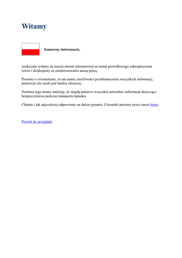 Witamy Szanowny interesencie, serdecznie witamy na naszej stronie internetowej na temat prawidłowego zabezpieczenia towru i dziękujemy za zainteresowanie naszą pracą. Prosimy o zrozumienie, że nie mamy możliwości przetłumaczenia wszystkich informacji, ponieważ ich zasób jest bardzo obszerny. Pomimo tego mamy nadzieję, że znajdą państwo wszystkie potrzebne informacje dotyczące bezpieczeństwa podczas transportu ładunku. Chętnie i jak najszybciej odpowiemy na dalsze pytania. O kontakt prosimy przez nasze biuro. Powrót do przeglądu