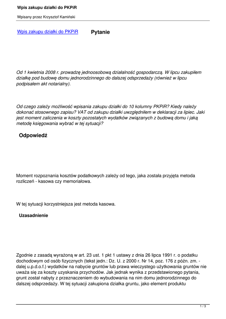 Wpis zakupu działki do PKPiR Wpisany przez Krzysztof Kamiński Wpis zakupu działki do PKPiR Pytanie Od 1 kwietnia 2008 r. prowadzę jednoosobową działalność gospodarczą. W lipcu zakupiłem działkę pod budowę domu jednorodzinnego do dalszej odsprzedaży (również w lipcu podpisałem akt notarialny). Od czego zależy możliwość wpisania zakupu działki do 10 kolumny PKPiR? Kiedy należy dokonać stosownego zapisu? VAT od zakupu działki uwzględniłem w deklaracji za lipiec. Jaki jest moment zaliczenia w koszty pozostałych wydatków związanych z budową domu i jaką metodę księgowania wybrać w tej sytuacji? Odpowiedź Moment rozpoznania kosztów podatkowych zależy od tego, jaka została przyjęta metoda rozliczeń - kasowa czy memoriałowa. W tej sytuacji korzystniejsza jest metoda kasowa. Uzasadnienie Zgodnie z zasadą wyrażoną w art. 23 ust. 1 pkt 1 ustawy z dnia 26 lipca 1991 r. o podatku dochodowym od osób fizycznych (tekst jedn.: Dz. U. z 2000 r. Nr 14, poz. 176 z późn. zm. dalej u.p.d.o.f.) wydatków na nabycie gruntów lub prawa wieczystego użytkowania gruntów nie uważa się za koszty uzyskania przychodów. Jak jednak wynika z przedstawionego pytania, grunt został nabyty z przeznaczeniem do wybudowania na nim domu jednorodzinnego do dalszej odsprzedaży. W tej sytuacji zakupiona działka gruntu, jako element produktu 1/3 Wpis zakupu działki do PKPiR Wpisany przez Krzysztof Kamiński wytwarzanego do sprzedaży stanowi towar handlowy. Fakt ten skutkuje tym, że wyłączenie z art. 23 ust. 1 pkt 1 u.p.d.o.f. nie będzie miało w tym przypadku zastosowania. W podatku dochodowym istnieją dwie metody rozpoznawania kosztów. Pierwsza z nich, tzw. kasowa przewiduje, iż koszty uzyskania przychodów są potrącane tylko w tym roku podatkowym, w którym zostały poniesione (art. 22 ust. 4 u.p.d.o.f.). Oznacza to, iż przy zastosowaniu tej metody koszty ujmuje się w księdze w dacie ich poniesienia, bez względu na fakt, jakiego dotyczą okresu. Przy drugiej metodzie, tzw. memoriałowej koszty podatkowe bezpośrednio związane z przychodami księguje się w roku podatkowym, w którym zostały osiągnięte odpowiadające im przychody (art. 22 ust. 5 u.p.d.o.f.). Warunkiem korzystania z tej metody przez podatników prowadzących podatkowe księgi przychodów i rozchodów jest prowadzenie tych ksiąg w sposób umożliwiający wyodrębnienie kosztów uzyskania przychodów odnoszących się tylko do danego roku podatkowego (art. 22 ust. 6 u.p.d.o.f.). Przy zastosowaniu metody kasowej dniem poniesienia kosztu z tytułu nabycia działki oraz pozostałych wydatków związanych z budową domu będzie dzień wystawienia faktury lub innego dokumentu stanowiącego podstawę do zaksięgowania danego wydatku (art. 22 ust. 6b u.p.d.o.f.). Z kolei wskutek zastosowania metody memoriałowej wszelkie wydatki bezpośrednio związane z budową będą stanowiły koszt uzyskania przychodu dopiero w dniu otrzymania należności za sprzedaną nieruchomość. Przy metodzie memoriałowej w dacie wystawienia faktury ewidencjonuje się jedynie wydatki inne niż bezpośrednio związane z przychodami (art. 22 ust. 5c u.p.d.o.f.). Wskazane w pytaniu rozbieżności dotyczące momentu zaliczenia wydatków do kosztów uzyskania przychodu mogą być właśnie skutkiem przyjęcia odmiennych metod księgowania. W zależności od specyfiki prowadzonej działalności, czy też samego sposobu rozliczeń z kontrahentami w jednym przypadku korzystniejsze może być zastosowanie metody kasowej, w innym zaś memoriałowej. Jednakże przy prowadzonej na niewielką skalę działalności 2/3 Wpis zakupu działki do PKPiR Wpisany przez Krzysztof Kamiński budowlanej niewątpliwe korzystniej dla podatnika będzie wybrać metodę kasową. Metoda ta pozwoli na wcześniejsze ujmowanie wydatków firmy w kosztach uzyskania przychodów. W takiej sytuacji w okresach nabywania towarów (materiałów) przedsiębiorstwo może wprawdzie wykazywać nieproporcjonalne do przychodów straty, w innych zaś wysokie dochody. Nie powinno to jednak stanowić problemu. Podatnik ma prawo w następnych latach odliczyć tę stratę od dochodu (art. 9 ust. 3 u.p.d.o.f.). Ponadto dokumentacja prowadzona przy metodzie kasowej nie wymaga wyodrębniania kosztów odnoszących się tylko do danego roku podatkowego, a zatem sposób jej prowadzenia jest znacznie mniej skomplikowany, niż przy metodzie memoriałowej. W przypadku samodzielnego prowadzenia ksiąg niewątpliwie nie jest to bez znaczenia. 3/3