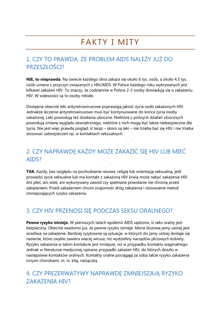 FAKTY I MITY 1. CZY TO PRAWDA, ŻE PROBLEM AIDS NALEŻY JUŻ DO PRZESZŁOŚCI? NIE, to nieprawda. Na świecie każdego dnia zakaża się około 6 tys. osób, a około 4,5 tys. osób umiera z przyczyn związanych z HIV/AIDS. W Polsce każdego roku wykrywanych jest kilkaset zakażeń HIV. To znaczy, że codziennie w Polsce 2-3 osoby dowiadują się o zakażeniu HIV. W większości są to osoby młode. Dostępne obecnie leki antyretrowirusowe poprawiają jakość życia osób zakażonych HIV. Jednakże leczenie antyretrowirusowe musi być kontynuowane do końca życia osoby zakażonej. Leki powodują też działania uboczne. Niektóre z późnych działań ubocznych powodują zmianę wyglądu zewnętrznego, niektóre z nich mogą być także niebezpieczne dla życia. Nie jest więc prawdą pogląd, iż teraz – skoro są leki – nie trzeba bać się HIV i nie trzeba stosować zabezpieczeń np. w kontaktach seksualnych. 2. CZY NAPRAWDĘ KAŻDY MOŻE ZAKAZIĆ SIĘ HIV LUB MIEĆ AIDS? TAK. Każdy, bez względu na pochodzenie rasowe, religię lub orientację seksualną, jeśli prowadzi życie seksualne lub ma kontakt z zakażoną HIV krwią może nabyć zakażenie HIV. Ani płeć, ani wiek, ani wykonywany zawód czy spełniane powołanie nie chronią przed zakażeniem. Przed zakażeniem chroni znajomość dróg zakażenia i stosowanie metod zmniejszających ryzyko zakażenia. 3. CZY HIV PRZENOSI SIĘ PODCZAS SEKSU ORALNEGO? Pewne ryzyko istnieje. W pierwszych latach epidemii AIDS sądzono, iż seks oralny jest bezpieczny. Obecnie wiadomo już, że pewne ryzyko istnieje: błona śluzowa jamy ustnej jest wrażliwa na zakażenie. Bardziej ryzykowne są sytuacje, w których do jamy ustnej dostaje się nasienie, które zwykle zawiera więcej wirusa, niż wydzieliny narządów płciowych kobiety. Ryzyko zakażenia w takim kontakcie jest mniejsze, niż w przypadku kontaktu waginalnego. Jednak w literaturze medycznej opisano przypadki zakażeń HIV, do których doszło w następstwie kontaktów oralnych. Kontakty oralne pociągają za sobą także ryzyko zakażenia innymi chorobami, m. in. kiłą, rzeżączką. 4. CZY PREZERWATYWY NAPRAWDĘ ZMNIEJSZAJĄ RYZYKO ZAKAŻENIA HIV? TAK. Prezerwatywa dobrej jakości, właściwie założona, używana od początku do końca kontaktu seksualnego zmniejsza ryzyko zakażenia HIV (prawie 100% ochrona przed zakażeniem). Nie jest prawdą, iż prezerwatywy mają „mikropory”, przez które przedostaje się wirus i plemniki. Skuteczność prezerwatyw w zapobieganiu transmisji HIV potwierdzano wielokrotnie w badaniach prowadzonych wśród stałych par heteroseksualnych, w których jedno z partnerów było zakażone HIV, a drugie nie. W parach, które konsekwentnie używały prezerwatyw przy każdym kontakcie seksualnym osoba niezakażona HIV pozostawała niezakażona. 5. CZY PRZYCZYNĄ AIDS NAPRAWDĘ JEST HIV? TAK. HIV powoduje stopniowe niszczenie układu immunologicznego (odpornościowego) osoby zakażonej aż do rozwinięcia się zespołu różnych infekcji i rodzajów nowotworów, który nazywamy AIDS. Istnieje jednak niewielka grupa uczonych, głównie zajmujących się naukami podstawowymi w medycynie, a nie pacjentami, którzy negują związek przyczynowo skutkowy między HIV a AIDS. Takie poglądy do niedawna były uznawane oficjalnie w Republice Południowej Afryki. Efektem jest to, że liczba zakażeń okołoporodowych dzieci i zgonów spowodowanych AIDS rośnie w tym kraju dramatycznie. Istnieją dane mówiące, iż około 25% młodych ludzi w RPA zakażonych jest HIV; częściej dotyczy to kobiet. 6. CZY MOŻLIWE JEST WYLECZENIE HIV? NIE. Leki antyretrowirusowe nie są w stanie usunąć wirusa z organizmu osoby zakażonej, jednak hamują namnażanie się wirusa i zwalniają przebieg zakażenia. 7. CZY ISTNIEJE SZCZEPIONKA CHRONIĄCA PRZED ZAKAŻENIEM HIV? NIE. Wprawdzie badania nad szczepionką profilaktyczną trwają, jednak dotychczasowe próby zakończyły się niepowodzeniem. Obecnie jedynym sposobem ochrony przed HIV pozostaje wiedza o drogach zakażenia, sposobach zmniejszania ryzyka i stosowanie tej wiedzy w życiu. 8. CZY HIV MOŻE PRZETRWAĆ POZA ORGANIZMEM CZŁOWIEKA? HIV jest wirusem, który do życia potrzebuje organizmu człowieka. Poza organizmem szybko ginie. Niszczą go wszelkie środki dezynfekcyjne, także woda z mydłem. Ginie w wyższych temperaturach (powyżej 56°C po kilku minutach, w 100°C – natychmiast). 9. CZY TRANSFUZJA KRWI JEST BEZPIECZNA? W krajach rozwiniętych, także w Polsce, każda porcja krwi oddanej w stacjach krwiodawstwa badana jest w kierunku zakażenia HIV. Zmniejsza to znacznie ryzyko przeniesienia zakażenia. W Polsce od 1995 r. nie stwierdzono przypadków zakażeń przez transfuzję krwi. Na początku epidemii HIV wiele osób zostało zakażonych poprzez krew lub preparaty krwiopochodne (np. używane w leczeniu chorych na hemofilię). Transfuzje krwi i czynników krwiopochodnych mogą nieść za sobą ryzyko zakażenia HIV w krajach rozwijających się. 10. CZY BYCIE DAWCĄ KRWI JEST BEZPIECZNE? W krajach rozwiniętych, w których używa się jednorazowego sprzętu nie można zakazić się w ten sposób. Polska jest krajem bezpiecznym dla krwiodawców. Jednak w krajach rozwijających się może wystąpić takie ryzyko. 11. CZY WIZYTA U DENTYSTY NIESIE RYZYKO ZAKAŻENIA? Leczenie dentystyczne nie powinno nieść ze sobą żadnego ryzyka pod warunkiem, że wszystkie narzędzia są sterylizowane po każdym użyciu oraz stosowane jest postępowanie chroniące przed przenoszeniem infekcji. 12. CZY OSOBY ZAKAŻONE HIV MOGĄ MIEĆ DZIECI? TAK. Jeśli kobieta zakażona HIV wie o swojej infekcji, podczas ciąży pozostaje pod opieką nie tylko ginekologa-położnika, ale także specjalisty terapii AIDS, wówczas szanse na urodzenie zdrowego dziecka wynoszą ponad 99%. W przypadku pary, w której mężczyzna jest zakażony HIV również możliwe jest bezpieczne posiadanie dzieci. Plemniki nie przenoszą wirusa, któr