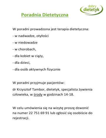 Poradnia Dietetyczna W poradni prowadzona jest terapia dietetyczna: - w nadwadze, otyłości - w niedowadze - w chorobach, - dla kobiet w ciąży, - dla dzieci, - dla osób aktywnych fizycznie W poradni przyjmuje pacjentów: dr Krzysztof Tambor, dietetyk, specjalista żywienia człowieka, w środy w godzinach 14-18. W celu umówienia się na wizytę proszę dzwonić na numer 22 751 69 91 lub zgłosić się osobiście do rejestracji. Cennik wizyt w Poradni Dietetycznej Pierwsza wizyta Badanie masy i składu ciała Szczegółowy wywiad zdrowotny Wykaz badań laboratoryjnych Szczegółowy wywiad żywieniowy Ustalenie zasad programu żywieniowego Wstępna diagnoza i omówienie problemu Czas trwania wizyty ok. 45min. Dietetyk zbiera wszystkie niezbędne dane w celu przygotowania indywidualnego Programu Żywieniowego. Czas przygotowania programu trwa do 7 dni 150 zł Pierwszy program żywieniowy Jadłospis 28 dniowy Ocena masy i składu ciała Szczegółowy raport żywienia Indywidualny plan żywienia Lista zakupów Książka zamienników produktów Dobór zadań terapeutycznych Cena obejmuje przygotowanie kompletnego Programu Żywieniowego wraz ze wszystkimi załącznikami: raporty, listy zakupów, książka zamienników produktów, inne. Program ustalany jest na okres miesiąca. 200zł Kolejny program żywieniowy Jadłospis 28 dniowy (Wizyta kontrolna) Ocena zmian w budowie ciała Kontrola wyznaczonych zadań Modyfikacja planu żywienia 150zł Cena obejmuje szczegółowe badania postępów terapii, indywidualną konsultację z dietetykiem oraz zupełnie nowy jadłospis z gotowymi przepisami, listą zakupów, nową listą zadań. Kolejny jadłospis ustalany jest na okres miesiąca. Rozpoczęcie terapii dietetycznej zwykle obejmuje Pierwszą wizytę oraz przygotowanie Pierwszego programu żywieniowego. Koszt sumaryczny 350 zł. Dodatkowe informacje dostępne są na stronie internetowej: tambor.dobrydietetyk.pl