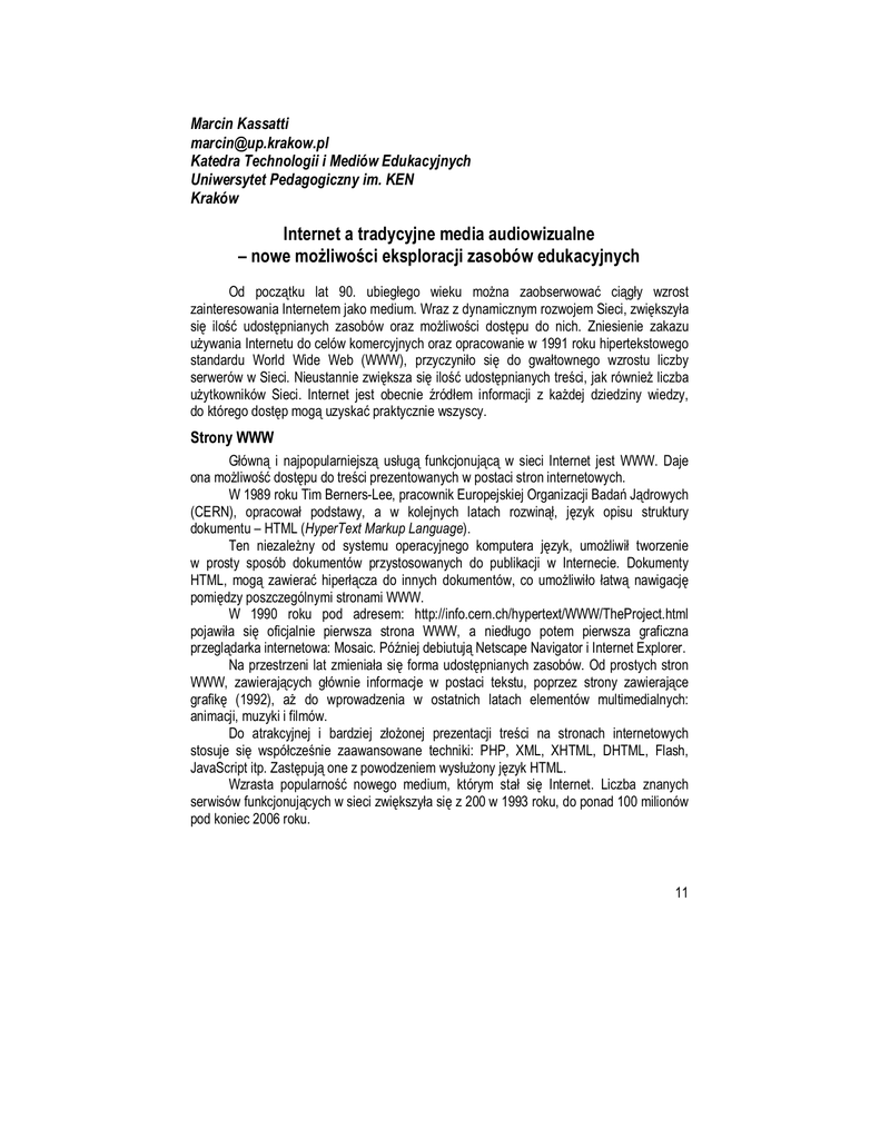 Marcin Kassatti [email protected] Katedra Technologii i Mediów Edukacyjnych Uniwersytet Pedagogiczny im. KEN Kraków Internet a tradycyjne media audiowizualne – nowe możliwości eksploracji zasobów edukacyjnych Od początku lat 90. ubiegłego wieku można zaobserwować ciągły wzrost zainteresowania Internetem jako medium. Wraz z dynamicznym rozwojem Sieci, zwiększyła się ilość udostępnianych zasobów oraz możliwości dostępu do nich. Zniesienie zakazu używania Internetu do celów komercyjnych oraz opracowanie w 1991 roku hipertekstowego standardu World Wide Web (WWW), przyczyniło się do gwałtownego wzrostu liczby serwerów w Sieci. Nieustannie zwiększa się ilość udostępnianych treści, jak również liczba użytkowników Sieci. Internet jest obecnie źródłem informacji z każdej dziedziny wiedzy, do którego dostęp mogą uzyskać praktycznie wszyscy. Strony WWW Główną i najpopularniejszą usługą funkcjonującą w sieci Internet jest WWW. Daje ona możliwość dostępu do treści prezentowanych w postaci stron internetowych. W 1989 roku Tim Berners-Lee, pracownik Europejskiej Organizacji Badań Jądrowych (CERN), opracował podstawy, a w kolejnych latach rozwinął, język opisu struktury dokumentu – HTML (HyperText Markup Language). Ten niezależny od systemu operacyjnego komputera język, umożliwił tworzenie w prosty sposób dokumentów przystosowanych do publikacji w Internecie. Dokumenty HTML, mogą zawierać hiperłącza do innych dokumentów, co umożliwiło łatwą nawigację pomiędzy poszczególnymi stronami WWW. W 1990 roku pod adresem: http://info.cern.ch/hypertext/WWW/TheProject.html pojawiła się oficjalnie pierwsza strona WWW, a niedługo potem pierwsza graficzna przeglądarka internetowa: Mosaic. Później debiutują Netscape Navigator i Internet Explorer. Na przestrzeni lat zmieniała się forma udostępnianych zasobów. Od prostych stron WWW, zawierających głównie informacje w postaci tekstu, poprzez strony zawierające grafikę (1992), aż do wprowadzenia w ostatnich latach elementów multimedialnych: animacji, muzyki i filmów. Do atrakcyjnej i bardziej złożonej prezentacji treści na stronach internetowych stosuje się współcześnie zaawansowane techniki: PHP, XML, XHTML, DHTML, Flash, JavaScript itp. Zastępują one z powodzeniem wysłużony język HTML. Wzrasta popularność nowego medium, którym stał się Internet. Liczba znanych serwisów funkcjonujących w sieci zwiększyła się z 200 w 1993 roku, do ponad 100 milionów pod koniec 2006 roku. 11 Rys. 1. Liczba stron WWW Według internetowego serwisu Netcraft, od lat prowadzącego statystyki stron WWW, liczba unikalnych adresów witryn, wynosiła na początku 2009 roku ponad 230 milionów. Serwisy wyszukiwawcze Wobec zwiększającej się ilości informacji nieustannie zamieszczanych w Sieci, konieczne stało się stworzenie wydajnych narzędzi wyszukiwawczych. Nowe możliwości eksploracji zwiększających się cyfrowych zasobów oferują wyszukiwarki internetowe. Wyszukują i indeksują one na bieżąco treści udostępniane w Internecie. Wyszukiwarki są obecne od początku istnienia stron WWW. Najpopularniejsze z nich serwisy wyszukiwawcze to obecnie: • Wyszukiwarka Google • Serwis Yahoo! • Bing (debiutująca w 2009 roku wyszukiwarka, następca Windows Live Search). Szczególnie dynamicznie rozwija się firma Google. Jej wyszukiwarka oferuje zaawansowane możliwości wyszukiwania. Ponadto zapewnia prostą, intuicyjną obsługę, ogromną bazę danych zaindeksowanych treści i największą ilość odpowiedzi na zapytania wyszukiwawcze. Google ciągle udoskonala też bieżące i wdraża kolejne, nowe usługi: • Google Maps (wirtualne mapy) • Aplikacja Google Earth (trójwymiarowe zdjęcia satelitarne) • Google Similar Image (wyszukiwarka podobnych zdjęć) • Book Search (wyszukiwarka książek) • Google Translate (tłumaczenie stron WWW) • Gmail (usługa e-mail) • Picasa (galeria zdjęć on-line) • Google Analytics (statystyki stron) 12 • • • Chrome (własna przeglądarka WWW) Google Video oraz YouTube (filmy on-line) Google AdSense (reklamy na stronach WWW). Wielka popularność Google sprawia, że stała się ona synonimem wyszukiwarki internetowej. Nieograniczony i szybki dostęp do publikowanych w Internecie informacji oraz możliwość potencjalnej nad nimi kontroli stwarza pewne niebezpieczeństwa: • dowolne filtrowanie i pozycjonowanie wyników wyszukiwania, • możliwość zbierania informacji o wyszukujących i ich preferencjach, • blokowanie dostępu do informacji, • możliwość manipulowania treścią, • blokowanie dostępu do wybranych serwisów, • stosowanie praktyk monopolistycznych. Niepokojącym również jest fakt braku znajomości przez sporą grupę internautów innych, alternatywnych wyszukiwarek. Dowodzi to jednocześnie dużej funkcjonalności i uniwersalności wyszukiwarki Google. Encyklopedie i słowniki Wiele tradycyjnych wydawnictw słownikowych i encyklopedycznych ma swoje wirtualne odpowiedniki w Sieci (np. encyklopedia Britannica). Dostęp do nich jest szybszy i wygodniejszy, powstają również nowe, inne wirtualne serwisy tego typu. Popularna, powstała w 2001 roku, wielojęzyczna Wikipedia z powodzeniem zastępuje tradycyjne encyklopedie, udostępniając hasła z każdej dziedziny wiedzy. Wikipedia realizuje ideę „wolnej encyklopedii”, gdzie hasła są tworzone i mogą być edytowane przez jej użytkowników. Wiarygodność Wikipedii ma zapewniać system autoryzacji ważniejszych haseł. Środowisko Web 2.0 Obecne wiele serwisów internetowych jest współtworzonych przez odbiorców za pomocą udostępnionych, prostych w obsłudze narzędzi – różnego rodzaju systemów CMS (Content Management System) tworzących środowisko Web 2.0. W tej technice powstają fora dyskusyjne, portale społecznościowe, galerie on-line, blogi, portale aukcyjne. Tworzone fora dyskusyjne dają możliwość wymia
