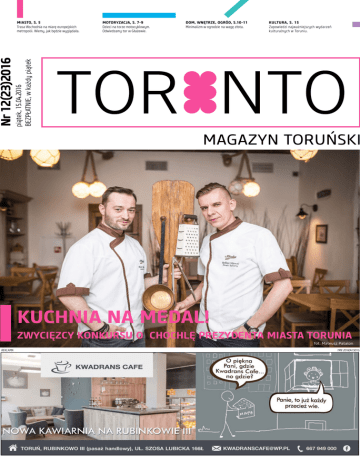 Motoryzacja, s. 7-9 Dzieci na torze motocyklowym. Odwiedzamy tor w Głażewie. Dom, wnętrze, ogród, s.10-11 Minimalizm w ogrodzie na wagę złota. Kultura, s. 15 Zapowiedzi najważniejszych wydarzeń kulturalnych w Toruniu. piątek, 15.04.2016 BEZPŁATNIE, w każdy piątek Nr 12(23)2016 Miasto, s. 5 Trasa Wschodnia na miarę europejskich metropolii. Wiemy, jak będzie wyglądała. Kuchnia na medal! zwycięzcy konkursu o Chochlę Prezydenta Miasta Torunia fot. Mateusz Patalon REKLAMA TRN 2016041501G LUDZIE TORONTO TORONTO magazyn toruński www.toronto-magazyn.pl [email protected] Adres: ul. Grudziądzka 79/6 tel. 789 191 070 red.nacz. Żaneta Lipińska-Patalon wydanie bezpłatne wydawca: Interactive-Press Żaneta Lipińska-Patalon MARCIN TREICHEL Reklama: [email protected] tel.789 223 013, tel.789 216 119, tel.789 223 339 Opracowanie graficzne: Anna Paula Szmeichel mruff design Rysowaniem i projektowaniem graficznym zajmuje się od wielu lat. Doświadczenie zdobył, pracując dla dzienników regionalnych oraz współpracując z agencjami reklamowymi przy wielu różnorodnych projektach. Pasja od małego Na swój pierwszy motocykl wsiadłam już jako studentka. Nigdy nie miałam nic wspólnego z tym światem i do motoryzacji wcale mnie nie ciągnęło. Nie mam typowego życiorysu motomaniaka, nie jeździłam Jawą, komarkiem ani nawet WSK-ą. Nie uczyłam się na podwórku ani w bocznej drodze. Nigdy o tym nawet nie marzyłam. Kiedy motocykle pojawiły się w moim życiu, wrodzona potrzeba niezależności i strach przed byciem zależnym na czy- Hejterzy są śmieszni Ostatnio przyszło mi czytać sporo forów internetowych naszych mediów toruńskich. Poznałem całkiem ciekawą grupkę psychopatów, wulgarnych szaleńców, paranoików i tym podobnych, złączonych wspólnym dążeniem do zniszczenia i wdeptania w ziemię wyimaginowanych przeciwników. To się nie uda i niestety ich wysiłki idą na marne, ale jako że żal tracić choćby minutę życia na analizowanie tych posta- Druk: Agora SA Redakcja nie ponosi odpowiedzialności za treść zamieszczonych reklam imś tylnym siedzeniu, zmusiły mnie to tego, by wziąć stery we własne ręce. I tak się zaczęło i raczej już nic tego nie zmieni. Właśnie przygotowuję kolejny wyjazd dziewczyn ze Speed Ladies. To Kobiecy Portal Motoryzacyjny zrzeszający społeczność zmotoryzowanych pań. Kiedy patrzę na listę, większość z nas to mamy. Oczywiście takie uparte jak ja, takie, które nie potrafią rezygnować ze swojej pasji, bo może „powinny” już się ustatkować (jak by to dziwnie nie zabrzmiało). I gdzie w tym wszystkim dzieci? Ja osobiście jestem przeciwnikiem jazdy na motocykl z dzieckiem. Nawet nie chcę wyobrażać sobie sytuacji – choćby parkingowej – kiedy kilkaset kilogramów przygniata malucha. A wsiadając na motocykl, akurat wyobraźnia jest ważna. Co jednak zrobić, gdy dla dziecka dwa kółka stają się czymś naturalnym? Jaką alternatywę wybrać? ci, zajmę Wam kilka chwil pewną refleksją na temat hejtu. Jeżeli ktoś jeszcze nie zna tego określenia, co chyba nie jest możliwe w Polsce po ostatnich wyborach, wyjaśnię, że chodzi o gnębienie, wyzywanie i poniżanie innych w internecie. Najczęściej zorganizowane i całkowicie świadome. Badań, opracowań i dysertacji o hejcie jest już tysiące. Ja dorzucam maleńki kamyczek do piramidy wiedzy i chcę Wam powiedzieć, że hejterzy to ludzie śmieszni. Nie „zabawni”, ale śmieszni. Z perspektywy sensu i celu życia, zajmują się najbrudniejszą i najbardziej podłą robotą – ryją pod innymi rowy wypełnione błotem, licząc, że ich wrogowie tam wpadną. Najczęściej jednak wielogodzinne siedzenie w błocie własnych kłamliwych i wściekłych wpisów brudzi tylko ich. Wyobrażam sobie ich, gdy „wychodzą” z tych Dać szanse. Co więcej torunianie mają ku temu możliwość. Dzięki kilkuosobowej ekipie z naszego miasta powstał tor, na którym trenować mogą dzieci. Wszystko oczywiście w granicach rozsądku i bezpieczeństwa. Wszystko pod okiem doświadczonych (bądź co bądź cierpliwości gratuluję) zawodników i rodziców. Ja takiej okazji nie miałam. Ale nie żałuję. Cieszę się, że mogę przenosić pasję do jednośladów dalej. A na torze w Głażewie, co jak co, pasji nie brakuje. Trzymam kciuki za rozwój tego miejsca. Oby więcej pozytywnych inicjatyw. O torze piszemy w dodatku motoryzacja, na stronie 7 tego wydania. Jeżeli znacie pasjonackie przedsięwzięcia, o których warto napisać na naszych łamach, dajcie znać: [email protected]. Nasi dziennikarze przyjrzą się każdej sprawie. Krzysztof „pARTyzan” Toczko, Mark Olbrich i Zbigniew Hołdys. Do końca nie było wiadomo, czy Zbyszek, unikający w tym czasie oficjalnych spotkań, pojawi się w Hard Rock Pubie Pamela. Nie chcąc zapeszyć, jako organizator oficjalnie nie zapowiadałem jego udziału. Okazało się jednak, że mimo kłopotów ze zdrowiem, nie odmówił prośbie swojego długoletniego przyjaciela, Marka Olbricha, i przyjechał do Torunia. Spotkanie z planowanych dwóch godzin przedłużyło się do trzech i pół. Dwieście dziesięć minut pełnych pasji opowieści o muzyce, okraszonych wieloma odniesieniami i anegdotami, przeradzające się w dyskusje. Prowadzący żadnego pytania nie zostawili bez odpowiedzi. Mimo że oficjalnie trzeba było je zakończyć, aby rozpocząć planowany koncert, rozmowy z artystami trwały nadal... W tym roku Mark Olbrich ponownie przylatuje z Londynu na Dzień Gitary. Tym razem, aby zaprezentować oficjalnie nowe winylowe wydanie swojej płyty „Live At Pamela Blues”, zrealizowane z okazji Record Store Day 2016. Miejsce i okazja są nieprzypadkowe. Wybrany przez internautów bluesową płytą roku 2014 album, został nagrany w czasie występu grupy Mark Olbrich Blues Eternity w Hard Rock Pubie Pamela. Sam Mark Olbrich od wielu lat merytorycznie wspiera Dzień Gitary. W poniedziałkowy wieczór poj