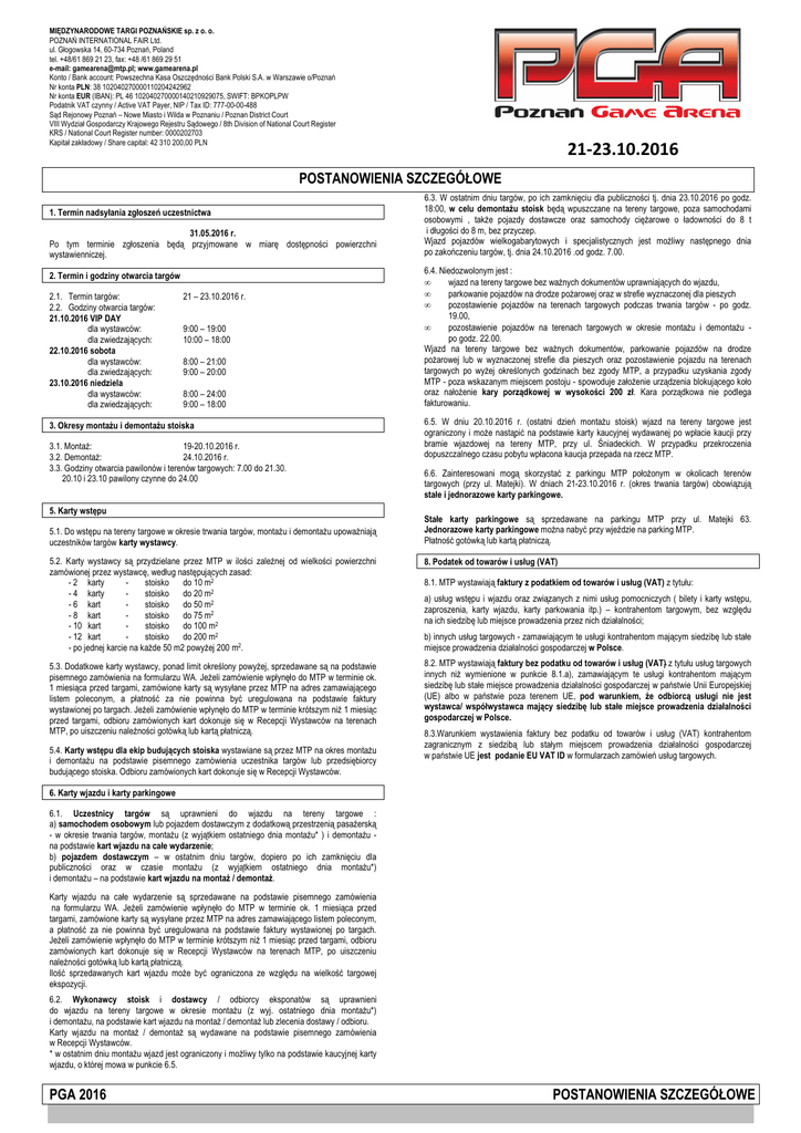 MIĘDZYNARODOWE TARGI POZNAŃSKIE sp. z o. o. POZNAŃ INTERNATIONAL FAIR Ltd. ul. Głogowska 14, 60-734 Poznań, Poland tel. +48/61 869 21 23, fax: +48 /61 869 29 51 e-mail: [email protected]; www.gamearena.pl Konto / Bank account: Powszechna Kasa Oszczędności Bank Polski S.A. w Warszawie o/Poznań Nr konta PLN: 38 102040270000110204242962 Nr konta EUR (IBAN): PL 46 102040270000140210929075, SWIFT: BPKOPLPW Podatnik VAT czynny / Active VAT Payer, NIP / Tax ID: 777-00-00-488 Sąd Rejonowy Poznań – Nowe Miasto i Wilda w Poznaniu / Poznan District Court VIII Wydział Gospodarczy Krajowego Rejestru Sądowego / 8th Division of National Court Register KRS / National Court Register number: 0000202703 Kapitał zakładowy / Share capital: 42 310 200,00 PLN 21-23.10.2016 POSTANOWIENIA SZCZEGÓŁOWE 1. Termin nadsyłania zgłoszeń uczestnictwa 31.05.2016 r. Po tym terminie zgłoszenia będą przyjmowane w miarę dostępności powierzchni wystawienniczej. 2. Termin i godziny otwarcia targów 2.1. Termin targów: 2.2. Godziny otwarcia targów: 21.10.2016 VIP DAY dla wystawców: dla zwiedzających: 22.10.2016 sobota dla wystawców: dla zwiedzających: 23.10.2016 niedziela dla wystawców: dla zwiedzających: 21 – 23.10.2016 r. 9:00 – 19:00 10:00 – 18:00 8:00 – 21:00 9:00 – 20:00 8:00 – 24:00 9:00 – 18:00 3. Okresy montażu i demontażu stoiska 3.1. Montaż: 19-20.10.2016 r. 3.2. Demontaż: 24.10.2016 r. 3.3. Godziny otwarcia pawilonów i terenów targowych: 7.00 do 21.30. 20.10 i 23.10 pawilony czynne do 24.00 5. Karty wstępu 5.1. Do wstępu na tereny targowe w okresie trwania targów, montażu i demontażu upoważniają uczestników targów karty wystawcy. 5.2. Karty wystawcy są przydzielane przez MTP w ilości zależnej od wielkości powierzchni zamówionej przez wystawcę, według następujących zasad: - 2 karty stoisko do 10 m2 - 4 karty stoisko do 20 m2 - 6 kart stoisko do 50 m2 - 8 kart stoisko do 75 m2 - 10 kart stoisko do 100 m2 - 12 kart stoisko do 200 m2 - po jednej karcie na każde 50 m2 powyżej 200 m2. 5.3. Dodatkowe karty wystawcy, ponad limit określony powyżej, sprzedawane są na podstawie pisemnego zamówienia na formularzu WA. Jeżeli zamówienie wpłynęło do MTP w terminie ok. 1 miesiąca przed targami, zamówione karty są wysyłane przez MTP na adres zamawiającego listem poleconym, a płatność za nie powinna być uregulowana na podstawie faktury wystawionej po targach. Jeżeli zamówienie wpłynęło do MTP w terminie krótszym niż 1 miesiąc przed targami, odbioru zamówionych kart dokonuje się w Recepcji Wystawców na terenach MTP, po uiszczeniu należności gotówką lub kartą płatniczą. 5.4. Karty wstępu dla ekip budujących stoiska wystawiane są przez MTP na okres montażu i demontażu na podstawie pisemnego zamówienia uczestnika targów lub przedsiębiorcy budującego stoiska. Odbioru zamówionych kart dokonuje się w Recepcji Wystawców. 6.3. W ostatnim dniu targów, po ich zamknięciu dla publiczności tj. dnia 23.10.2016 po godz. 18:00, w celu demontażu stoisk będą wpuszczane na tereny targowe, poza samochodami osobowymi , także pojazdy dostawcze oraz samochody ciężarowe o ładowności do 8 t i długości do 8 m, bez przyczep. Wjazd pojazdów wielkogabarytowych i specjalistycznych jest możliwy następnego dnia po zakończeniu targów, tj. dnia 24.10.2016 .od godz. 7.00. 6.4. Niedozwolonym jest : • wjazd na tereny targowe bez ważnych dokumentów uprawniających do wjazdu, • parkowanie pojazdów na drodze pożarowej oraz w strefie wyznaczonej dla pieszych • pozostawienie pojazdów na terenach targowych podczas trwania targów - po godz. 19.00, • pozostawienie pojazdów na terenach targowych w okresie montażu i demontażu po godz. 22.00. Wjazd na tereny targowe bez ważnych dokumentów, parkowanie pojazdów na drodze pożarowej lub w wyznaczonej strefie dla pieszych oraz pozostawienie pojazdu na terenach targowych po wyżej określonych godzinach bez zgody MTP, a przypadku uzyskania zgody MTP - poza wskazanym miejscem postoju - spowoduje założenie urządzenia blokującego koło oraz nałożenie kary porządkowej w wysokości 200 zł. Kara porządkowa nie podlega fakturowaniu. 6.5. W dniu 20.10.2016 r. (ostatni dzień montażu stoisk) wjazd na tereny targowe jest ograniczony i może nastąpić na podstawie karty kaucyjnej wydawanej po wpłacie kaucji przy bramie wjazdowej na tereny MTP, przy ul. Śniadeckich. W przypadku przekroczenia dopuszczalnego czasu pobytu wpłacona kaucja przepada na rzecz MTP. 6.6. Zainteresowani mogą skorzystać z parkingu MTP położonym w okolicach terenów targowych (przy ul. Matejki). W dniach 21-23.10.2016 r. (okres trwania targów) obowiązują stałe i jednorazowe karty parkingowe. Stałe karty parkingowe są sprzedawane na parkingu MTP przy ul. Matejki 63. Jednorazowe karty parkingowe można nabyć przy wjeździe na parking MTP. Płatność gotówką lub kartą płatniczą. 8. Podatek od towarów i usług (VAT) 8.1. MTP wystawiają faktury z podatkiem od towarów i usług (VAT) z tytułu: a) usług wstępu i wjazdu oraz związanych z nimi usług pomocniczych ( bilety i karty wstępu, zaproszenia, karty wjazdu, karty parkowania itp.) – kontrahentom targowym, bez względu na ich siedzibę lub miejsce prowadzenia przez nich działalności; b) innych usług targowych - zamawiającym te usługi kontrahentom mającym siedzibę lub stałe miejsce prowadzenia działalności gospodarczej w Polsce. 8.2. MTP wystawiają faktury bez podatku od towarów i usług (VAT) z tytułu usług targowych innych niż wymienione w punkcie 8.1.a), zamawiającym te usługi kontrahentom mającym siedzibę lub stałe miejsce prowadzenia działalności gospodarczej w państwie Unii Europejskiej (UE) albo w państwie poza terenem UE, pod warunkiem, że odbiorcą usługi nie jest wystawca/ współwystawca mający siedzibę lub stałe miejsce prowadzenia działalności gospodarczej w Polsce. 8.3.Warunkiem wystawienia 