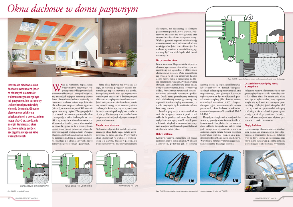 Okna dachowe w domu pasywnym okiennymi, nie odznaczają się dobrymi parametrami przenikalności cieplnej. Podstawowe znaczenie ma więc grubość oraz ewentualne dodatkowe ocieplenie ramy. Większa grubość zapewni minimalizację mostków termicznych na łączeniach z konstrukcją dachu. Jeżeli rama okienna jest dodatkowo wyposażona w materiał izolacyjny, możemy być pewni dobrych właściwości termicznych. © FAKRO Duży rozmiar okna W raz ze wzrostem popularności budownictwa pasywnego rozpoczęto modyfikacje wszystkich elementów składowych i przegród budynku, aby uzyskać jak najlepsze parametry cieplne domu. Prowadzone badania wykazały, że przez okna dachowe ucieka zbyt dużo ciepła, a dostępna na rynku stolarka regularna (ścienna) jest w stanie zapewnić kilkakrotnie lepsze parametry cieplne. Dlatego specjaliści od budownictwa pasywnego często doradzali rezygnację z okien dachowych na rzecz okien regularnych w ścianach szczytowych. W ostatnich latach sytuacja diametralnie się zmieniła – przez to, że w celu uzyskania lepszej izolacyjności producenci okien dachowych ulepszali swoje produkty. Dostępne obecnie na rynku okna odznaczają się dobrymi parametrami, które mogą satysfakcjonować każdego projektanta czy wykonawcę domów energooszczędnych i pasywnych. Same okna dachowe nie wystarczą do tego, by uzyskać pożądany poziom minimalnego zapotrzebowania na ciepło. Szczegółowy projekt musi być poprzedzony wnikliwymi badaniami i drobiazgowymi obliczeniami cieplnymi całości konstrukcji. Jeżeli zależy nam na ciepłym domu, musimy zwrócić uwagę na te parametry okien dachowych, które wpłyną na wysokie walory użytkowania pod względem komfortu cieplnego. Porównajmy je ze standardowymi produktami, najczęściej proponowanymi przez producentów. Ciepła rama okienna Wybierając odpowiedni model energooszczędnego okna dachowego, należy zwrócić uwagę na ramy okienne. W przypadku okien dachowych w większości wykonuje się je z drewna, dlatego w porównaniu z wielokomorowymi plastikowymi ramami Dobre szklenie Kolejnym ważnym elementem jest rodzaj zastosowanego w oknie szklenia. W oknach dachow ych, podobnie jak w stolarce Rys. FAKRO — przykład poczwórnego systemu uszczelnienia okna dachowego. Uszczelnienie pomiędzy ramą a skrzydłem ściennej, stosuje się zespolone szklenie dwulub trójszybowe. W domach energooszczędnych poleca się się stosowanie szklenia trójszybowego, choć głównym kryterium wyboru powinien być współczynnik przenikalności cieplnej (dla domów energooszczędnych wynosi on U≤0,7). Na rynku dostępne są już, przeznaczone dla domów pasywnych, okna dachowe ze szkleniem czteroszybowym o współczynnikach U=0,5 lub U=0,3. Decyzję o zakupie okien podejmuje inwestor dysponujący określonymi środkami finansowymi. Decydując się na standardowe szklenie dwuszybowe, należy wziąć pod uwagę jego wyposażenie w warstwy emisyjne, ciepłą ramkę łączącą zespoloną konstrukcję szklenia i wypełnienie przestrzeni między szybami gazem szlachetnym. Wszystkie te parametry zmniejszają przenikalność cieplną dla całego szklenia. Kolejnym ważnym elementem okien energooszczędnych są uszczelki pomiędzy ramą a skrzydłem okna. Po zamknięciu okno musi być na tyle szczelne, żeby ciepło nie mogło się wydostać na zewnątrz przez szczeliny. Najlepiej, jeżeli skrzydło i/lub rama wyposażone są w uszczelki, które przy zamkniętym oknie całkowicie powstrzymują migrację ciepłego powietrza. Im więcej uszczelek zamontujemy, tym większą gwarancję szczelności otrzymamy. Ciepły kołnierz Oprócz samego okna dachowego, niezbędnym elementem montażowym jest odpowiednich rozmiarów kołnierz. Dlatego przy budowie domu energooszczędnego powinniśmy zastosować specjalne kołnierze uszczelniające. Ich konstrukcja wyposażona © FAKRO Jeszcze do niedawna okna dachowe uważano za jeden ze słabszych elementów w domu energooszczędnym lub pasywnym. Ich parametry izolacyjności pozostawiały wiele do życzenia. Obecnie oferowane produkty są udoskonalone i z powodzeniem mogą służyć oszczędzaniu energii. Wybierając okna dachowe należy zwrócić szczególną uwagę na kilka ważnych kwestii. Istotne znaczenie dla parametrów cieplnych okna ma jego rozmiar – im większy, tym korzystniejszy jest jego udział w obliczeniach efektywności cieplnej. Duże przeszklenia zapewniają w okresie zimowym bardzo dobre naświetlenie i ogrzewanie poddasza naturalnym światłem. Promieniowanie słoneczne jest akumulowane przez ściany i wyposażenie wnętrza, które stopniowo je oddają. Przy dobrych parametrach izolacyjnych okna całe ciepło pozostaje na poddaszu. Dzięki temu potrzebujemy mniejszej ilości dodatkowej energii grzewczej, aby zapewnić komfort cieplny we wnętrzu, co z kolei przyczynia się do obniżenia rachunków za ogrzewanie. Ponadto, przy dużych rozmiarach okna zmienia się ogólny stosunek powierzchni szklenia do powierzchni ramy. Im więcej szyby, która ma lepszy współczynnik przenikalności cieplnej w stosunku do ramy, tym mniejszy współczynnik przenikalności cieplnej dla całości okna. Rys. FAKRO — grubość ramy 50 KREATOR–PROJEKTY • 4/2011 Rys. FAKRO — przykład szklenia energooszczędnego trój- i czteroszybowego. (z pliku pdf FAKRO) KREATOR–PROJEKTY • 4/2011 51 ZDANIEM EKSPERTÓW Jakie okna do energooszczędnego domu Przykład elementów © VELUX do okien dachowych © VELUX składowych ciepłego kołnierza Powyzej: rolety podwójnie jest dodatkowo w elementy, które po zamontowaniu tworzą w całości termoizolacyjną ramę. Ponadto, tego typu kołnierz zapewnia wysoką szczelność i odporność na warunki pogodowe. Jest to możliwe dzięki optymalnie zaprojektowanym kształtom, systemowi uszczelek, przymocowanym fabrycznie do kołnierza pasom z materiału izolacyjnego i odpowiednio szerokiemu fartuchowi. Kołnierz uszczelniający okazuje się przydatny, jeśli 