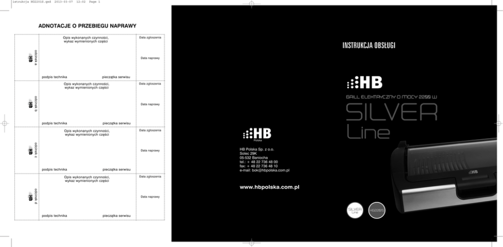 istrukcja HG2201S.qxd 2013-03-07 12:02 Page 1 ADNOTACJE O PRZEBIEGU NAPRAWY Opis wykonanych czynności, wykaz wymienionych części Data zgłoszenia odcinek a INSTRUKCJA OBSŁUGI Data naprawy podpis technika pieczątka serwisu Opis wykonanych czynności, wykaz wymienionych części Data zgłoszenia odcinek b Data naprawy podpis technika pieczątka serwisu Opis wykonanych czynności, wykaz wymienionych części Data zgłoszenia odcinek c Data naprawy podpis technika pieczątka serwisu Opis wykonanych czynności, wykaz wymienionych części HB Polska Sp. z o.o. Solec 29K 05-532 Baniocha tel.: + 48 22 736 48 00 fax: + 48 22 736 48 10 e-mail: [email protected] Data zgłoszenia odcinek d www.hbpolska.com.pl Data naprawy podpis technika pieczątka serwisu Page 4 Ochrona środowiska: Takie oznakowanie informuje, że sprzęt ten, po okresie jego użytkowania nie może być umieszczany łącznie z innymi odpadami pochodzącymi z gospodarstwa domowego. Użytkownik jest zobowiązany do oddania go prowadzącym punkty zbiórki zużytego sprzętu elektrycznego i elektronicznego. Prowadzący punkty zbiórki, w tym lokalne punkty zbiórki, sklepy oraz gminne jednostki, tworzą odpowiedni system umożliwiający oddanie tego sprzętu. Właściwe postępowanie ze zużytym sprzętem elektrycznym i elektronicznym przyczynia się do uniknięcia szkodliwych dla zdrowia ludzi i środowiska naturalnego konsekwencji, wynikających z obecności składników niebezpiecznych oraz niewłaściwego składowania i przetwarzania takiego sprzętu. MODEL PRODUKTU . . . . . . . . . . . . . . . . . . . . . . . . . . . . . . . . . . . . . . . NR SERYJNY . . . . . . . . . . . . . . . . . . . . . . . . . . . . . . . . . . . . . . . . . . . . . . . DATA SPRZEDAŻY . . . . . . . . . . . . . . . . . . . . . . . . . . . . . . . . . . . . . . . . Na produkt udziela się gwarancji na okres 24 miesięcy, która obejmuje wady powstałe z przyczyn tkwiących w sprzedanym urządzeniu. Gwarant zobowiązuje się do bezpłatnego usunięcia ewentualnej niesprawności urządzenia, pod warunkiem wykorzystywania go zgodnie z przeznaczeniem i zaleceniami Instrukcji Obsługi oraz przedstawienia prawidłowo wypełnionej karty gwarancyjnej wraz oryginalnym dowodem zakupu. Naprawa gwarancyjna urządzenia zostanie wykonana w możliwie najkrótszym terminie, nie przekraczającym 14 dni roboczych od daty zgłoszenia usterki. Termin ten może w wyjątkowych przypadkach ulec wydłużeniu do 21 dni roboczych, jeżeli naprawa będzie wymagać sprowadzenia części zamiennych z zagranicy. Zakres niniejszej Gwarancji nie obejmuje żadnych uszkodzeń mechanicznych. Gwarancja niniejsza nie znajduje zastosowania w sytuacji, jeżeli: urządzenie lub dowód jego zakupu będą niezgodne ze sobą lub niemożliwe będzie odczytanie znajdujących się na nich danych, numer seryjny urządzenia będzie zniszczony lub nieczytelny, stwierdzona zostanie ingerencja nieupoważnionych osób lub nieautoryzowanych zakładów serwisowych, uszkodzenie powstanie z przyczyn natury zewnętrznej tj.: zjawiska atmosferyczne, wyładowania elektryczne itp. Gwarant może uchylić się od dotrzymania terminu wykonania naprawy gwarancyjnej, jeżeli zaistnieją zakłócenia w działalności jego przedsiębiorstwa, spowodowane nieprzewidywalnymi okolicznościami, w szczególności takimi jak: niepokoje społeczne, klęski żywiołowe, ograniczenia importowe itp. Podstawę do rozstrzygania ewentualnych sporów powstałych w trakcie realizacji uprawnień wynikających z niniejszej Gwarancji, stanowić będą przepisy prawa obowiązujące na terytorium Rzeczypospolitej Polskiej. pieczątka sklepu KARTA GWARANCYJNA To urządzenie zostało oznaczone zgodnie z Dyrektywą Europejską 2002/96/EC oraz polską Ustawą z dnia 29 lipca 2005 r. o zużytym sprzęcie elektrycznym i elektronicznym (Dz.U. Nr 180/2005, poz. 1495) symbolem przekreślonego kontenera na odpady. pieczątka sklepu 12:02 pieczątka sklepu 2013-03-07 Gwarancja niniejsza nie wyłącza, nie ogranicza ani nie zawiesza uprawnień Kupującego wynikających z niezgodności towaru z umową. W przypadku produktu zakupionego przez przedsiębiorcę na fakturę VAT, okres gwarancji zostaje skrócony do 12 miesięcy Lista punktów serwisowych znajduje się na stronie www.hbpolska.com.pl HB Polska Sp. z o.o. Solec 29K 05-532 Baniocha tel.: + 48 22 736 48 00 fax.: + 48 22 736 48 10 e-mail: [email protected] 5 pieczątka sklepu istrukcja HG2201S.qxd istrukcja HG2201S.qxd 2013-03-07 12:02 Page 7 Po umyciu wszystkie elementy należy dokładnie wytrzeć i pozostawić do wyschnięcia wszelkich niedostępnych miejsc, a w szczególności gniazda przewodu zasilającego. Przewód zasilający z termostatem (4) należy przetrzeć wilgotną ściereczką z dodatkiem środka czyszczącego, a następnie wytrzeć do sucha. Szklana pokrywa (1), płyta grzejna (2) oraz tacka na tłuszcz (5) po wystygnięciu i usunięciu wszelkich resztek jedzenia, mogą być również myte w zmywarce. Przewodu zasilającego z termostatem (4) NIE WOLNO zanurzać w wodzie. GRATULUJEMY! Kupując grill elektryczny marki HB, wybrali Państwo jedno z najlepszych tego typu urządzeń dostępnych obecnie na rynku. Prawidłowo używany i konserwowany grill, zapewni Państwu wiele lat satysfakcjonującego działania. Przepisy bezpieczeństwa: Przed rozpoczęciem użytkowania grilla należy dokładnie zapoznać się z niniejszą instrukcją obsługi i bezwzględnie jej przestrzegać. Instrukcję obsługi wraz z dowodem zakupu należy przechowywać w łatwo dostępnym miejscu. Przechowywanie: Zmontowany grill należy przechowywać w suchym i chłodnym miejscu. Jeżeli urządzenie nie będzie używane przez dłuższy okres czasu, zaleca się jego dokładne oczyszczenie i ponowne zapakowanie w oryginalne opakowanie lub inne opakowanie chroniące przed kurzem. Dane techniczne: Moc 2200 W — krótki czas nagrzewania grilla Dwudzielna płyta grzejna — karbowana i płaska Powierzchnia pokryta n