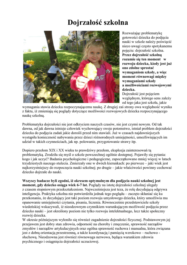 Dojrzałość szkolna RozwaŜając problematykę gotowości dziecka do podjęcia nauki w szkole naleŜy poświęcić nieco uwagi często spotykanemu pojęciu: dojrzałość szkolna. Przez dojrzałość szkolną rozumie się ten moment w rozwoju dziecka, kiedy jest juŜ ono zdolne sprostać wymaganiom szkoły, a więc moment równowagi między wymaganiami szkoły a moŜliwościami rozwojowymi dziecka. Dojrzałość jest pojęciem względnym, którego sens zaleŜy od tego jaka jest szkoła, jakie wymagania stawia dziecku rozpoczynającemu naukę. Z drugiej zaś strony owa względność wynika z faktu, iŜ zmieniają się poglądy dotyczące moŜliwości rozwojowych dziecka rozpoczynającego naukę szkolną. Problematyka dojrzałości nie jest odkryciem naszych czasów, nie jest czymś nowym. Od tak dawna, od jak dawna istnieje człowiek wychowujący swoje potomstwo, istniał problem dojrzałości dziecka do podjęcia zadań jakie dorośli przed nim stawiali. JuŜ w czasach najdawniejszych wystąpiła konieczność nabywania przez dzieci róŜnorodnych umiejętności, umoŜliwiających im udział w takich czynnościach, jak np. polowanie, przygotowanie strawy itp. Dopiero przełom XIX i XX wieku to prawdziwy przełom, eksplozja zainteresowań tą problematyką. Zrodziła się myśl o szkole powszechnej ogólnie dostępnej. Pojawiły się pytania: kogo i jak uczyć? Badania psychologiczne i pedagogiczne, zapoczątkowano mniej więcej w latach trzydziestych naszego stulecia. Zmierzały one w dwóch kierunkach: po pierwsze – jaki wiek jest najkorzystniejszy do rozpoczęcia nauki szkolnej; po drugie – jakie właściwości powinny cechować dziecko dojrzałe do nauki. Wszyscy badacze byli zgodni, iŜ okresem optymalnym dla podjęcia nauki szkolnej jest moment, gdy dziecko osiąga wiek 6-7 lat. Poglądy na istotę dojrzałości szkolnej ulegały z czasem stopniowym przekształceniom. Najwcześniejsza jest teza, Ŝe rolę decydującą odgrywa inteligencja. Praktyka szkolna nie potwierdziła jednak tego poglądu – zaczęto skłaniać się ku przekonaniu, Ŝe decydujący jest taki poziom rozwoju umysłowego dziecka, który umoŜliwia mu opanowanie umiejętności czytania, pisania, liczenia. Równocześnie przedstawiciele szkoły wiedeńskiej wskazywali, iŜ nieodzownym czynnikiem warunkującym moŜliwość podjęcia przez dziecko nauki – jest określony poziom nie tylko rozwoju intelektualnego, lecz takŜe społeczny rozwój dziecka. W okresie późniejszym wyłoniło się równieŜ zagadnienie dojrzałości fizycznej. Podstawowym jej przejawem jest dobry stan zdrowia, odporność na choroby i zmęczenie, sprawność narządów zmysłów i narządów artykulacyjnych oraz ogólna sprawność ruchowa i manualna, która związana jest z dobrą orientacją przestrzenną, a takŜe koordynacją i pamięcią wzrokowo – ruchowo słuchową. Nieodzowna jest równieŜ równowaga nerwowa, będąca warunkiem zdrowia psychicznego i osiągnięcia dojrzałości uczuciowej. Dojrzałość fizyczna warunkuje dojrzałość psychomotoryczną dziecka, która ma wpływ na dobrą orientację w przestrzeni, koordynację ruchową i wzrokowo-słuchowo- ruchową. Przejawem tej dojrzałości jest takŜe zręczność, sprawność ruchów rąk, opanowanie ruchów narzędziowych ( praksji ), umiejętność hamowania pewnych impulsów ruchowych, wykonywania ruchów ciągłych ( przy łączeniu elementów graficznych ),zdolność utrzymywania kierunku ruchu. Podstawowym elementem dojrzałości psychoruchowej jest umiejętność przetwarzania statycznego obrazu graficznego ( liter, wyrazów ) na obraz dźwiękowy ( głosek, słów ).Do osiągnięcia tej umiejętności niezbędny jest określony poziom pamięci wzrokowej i słuchowej. Dojrzałość umysłową charakteryzuje przede wszystkim swoboda w posługiwaniu się mową oraz prawidłowe rozumienie mowy innych. Ponadto dzieci dobrze przygotowane do nauki czytania i pisania potrafią dokonać analizy i syntezy wzrokowej oraz słuchowej. Przejawem dojrzałości emocjonalno-społecznej są: samodzielność, zaradność, chęć i umiejętność nawiązywania kontaktów z rówieśnikami i nauczycielami oraz umiejętność przystosowania się do wymogów nowego środowiska. Dziecko dojrzałe umysłowo do podjęcia nauki w szkole posiada juŜ określony zasób doświadczeń i wyobraŜeń, będących podstawą dla procesów analizy i syntezy oraz rozwoju mowy i logicznego myślenia. Dziecko wstępujące do szkoły posługuje się mową w sposób zrozumiały dla otoczenia, a takŜe poprawny pod względem gramatycznym i dźwiękowym. Ponadto – jest to dziecko myślące z zaciekawieniem i zadowoleniem o swych nowych, szkolnych obowiązkach. Dzieci rozpoczynające naukę w szkole, są w większości pozytywnie nastawione do swych nowych, uczniowskich obowiązków. Mimo to nie wszystkim dzieciom łatwo jest przystosować się do roli ucznia. Przejście ze środowiska przedszkolnego do szkolnego wymaga od dziecka przystosowania się do nowej sytuacji. Uczeń kl. I musi nawiązać kontakty z wieloma nowymi osobami. Nie jest to dla dziecka sytuacja łatwa, tym bardziej, Ŝe rozstając się z przedszkolem było się „starszakiem”, czyli tym, który – na miarę przedszkola – jest najstarszy, najbardziej samodzielny, najwięcej wie i potrafi. Przychodząc do szkoły były „starszak” zamienia się w „pierwszaka”. Przejściu do szkoły towarzyszą zatem uczucia ambiwalentne: z jednej strony dumy, Ŝe jest się juŜ uczniem – z drugiej pewnego zawodu, gdyŜ znów jest się kimś małym. Niezmierny wpływ na moŜliwość przystosowania do warunków szkolnych wywiera rozwinięte u dziecka poczucie obowiązku. Kształtowaniu się obowiązkowości sprzyja sumienne wykonywanie dyŜurów i innych prac podejmowanych przez dzieci z inicjatywy własnej bądź nauczyciela ( i rodziców ). Niezbędne jest wyrobienie nawyku doprowadzania rozpoczętej pracy do końca. Reasumując: 1.Ja