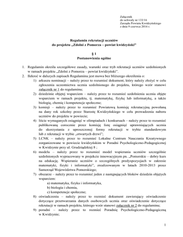 Załącznik do uchwały nr 133/16 Zarządu Powiatu Kwidzyńskiego z dnia 9 czerwca 2016 r. Regulamin rekrutacji uczniów do projektu „Zdolni z Pomorza – powiat kwidzyński” §1 Postanowienia ogólne 1. Regulamin określa szczegółowe zasady, warunki oraz tryb rekrutacji uczniów uzdolnionych w ramach projektu „Zdolni z Pomorza – powiat kwidzyński”. 2. Ilekroć w dalszych zapisach Regulaminu jest mowa bez bliższego określenia o: 1) arkuszu nominacji – należy przez to rozumieć dokument, który należy złożyć w celu zgłoszenia uczestnictwa ucznia uzdolnionego do projektu, którego wzór stanowi załącznik nr 1 do regulaminu; 2) dziedzinie objętej wsparciem – należy przez to rozumieć uzdolnienia ucznia objęte wsparciem w ramach projektu, tj. matematykę, fizykę lub informatykę, a także biologię, chemię i kompetencje społeczne; 3) komisji – należy przez to rozumieć Powiatową komisję rekrutacyjną powołaną na dany rok szkolny przez Starostę Kwidzyńskiego w celu prowadzenia naboru uczniów do projektu w powiecie; 4) liście wymaganych osiągnięć w olimpiadach i konkursach – należy przez to rozumieć publikowaną corocznie przez komisję listę osiągnięć uprawniających ucznia do skorzystania z uproszczonej formy rekrutacji w trybie standardowym lub z rekrutacji w trybie „otwartych drzwi”; 5) LCNK – należy przez to rozumieć Lokalne Centrum Nauczania Kreatywnego zorganizowane w powiecie kwidzyńskim w Poradni Psychologiczno-Pedagogicznej w Kwidzynie przy ul. Grudziądzkiej 8 ; 6) modelu – należy przez to rozumieć model wspierania uczniów szczególnie uzdolnionych wypracowany w projekcie innowacyjnym pn. „Pomorskie – dobry kurs na edukację. Wspieranie uczniów o szczególnych predyspozycjach w zakresie matematyki, fizyki i informatyki”, zrealizowanym w latach 2010-2013 przez Samorząd Województwa Pomorskiego; 7) obszarze – należy przez to rozumieć jeden z następujących bloków dziedzin objętych wsparciem: a) matematyka, fizyka i informatyka, b) biologia i chemia, c) kompetencje społeczne; 8) oświadczeniu – należy przez to rozmieć dokument zawierający oświadczenie dotyczące przetwarzania danych osobowych ucznia oraz oświadczenie dotyczące rekrutacji w ramach projektu, którego wzór stanowi załącznik nr 2 do regulaminu; 9) poradni – należy przez to rozmieć Poradnię Psychologiczno-Pedagogiczną w Kwidzynie; 1 10) projekcie – należy przez to rozumieć projekt „Zdolni z Pomorza – powiat kwidzyński”; 11) projekcie kwalifikacyjnym – należy przez to rozumieć projekt realizowany przez ucznia w ramach rekrutacji standardowej w obszarze biologii i chemii oraz obszarze kompetencji społecznych, 12) przewodniczącym – należy przez to rozumieć przewodniczącego komisji; 13) RCNK – należy przez to rozumieć Regionalne Centrum Nauczania Kreatywnego z siedzibą w Centrum Edukacji Nauczycieli w Gdańsku; 14) TUK – należy przez to rozumieć Test uzdolnień kierunkowych stosowany w ramach rekrutacji standardowej w obszarze matematyki, fizyki i informatyki; 15) uczniu – należy przez to rozumieć ucznia gimnazjum, szkoły ponadgimnazjalnej, a w uzasadnionych przypadkach także ucznia szkoły podstawowej, posiadającego szczególne predyspozycje w zakresie dziedzin objętych wsparciem w ramach projektu; 16) wniosku – należy przez to rozumieć dokument, który jest podstawą do przeprowadzenia badania ucznia w poradni którego wzór stanowi załącznik nr 3 do regulaminu; 17) wydziale – należy przez to rozumieć Wydział Edukacji, Kultury, Sportu, Turystyki i Zdrowia Publicznego Starostwa Powiatowego w Kwidzynie. 3. Wszelkie dokumenty składane przez niepełnoletniego ucznia, a mające wpływ na sposób uczestnictwa w projekcie, muszą zawierać podpis rodzica lub opiekuna prawnego. 4. Rekrutacja jest prowadzona zgodnie z zasadą równości szans kobiet i mężczyzn. 5. Przyjmuje się zasadę rozstrzygania wątpliwości związanych z rekrutacją na korzyść ucznia. §2 Tryby rekrutacji 1. Uczeń może stać się uczestnikiem projektu w następujących trybach: 1) rekrutacji standardowej, 2) rekrutacji uzupełniającej, 3) przeniesienia ucznia z innego LCNK, 4) rekrutacji w trybie „otwartych drzwi”, 5) rekrutacji w trybie kontynuacji uczestnictwa. 2. Uczeń zakwalifikowany do projektu zobowiązany jest do złożenia w LCNK deklaracji uczestnictwa w projekcie. 3. W wypadku finansowania całości lub części działań w ramach projektu z funduszy strukturalnych Unii Europejskiej, uczeń zakwalifikowany do projektu zobowiązany jest do złożenia w LCNK wymaganych dokumentów zgodnie z umową lub decyzją o dofinansowaniu projektu. 4. W wypadku, o którym mowa w ust. 3, mogą mieć zastosowane dodatkowe warunki udziału w projekcie, w szczególności związane z miejscem zamieszkania, które zostaną przedstawione uczniowi przed podjęciem decyzji o udziale w projekcie. 5. Odmowa złożenia deklaracji, o której mowa w ust. 2, lub dokumentów, o których mowa w ust. 3, uniemożliwia udział w projekcie. 6. Uczeń składa wniosek oraz arkusz nominacji w LCNK w powiecie właściwym ze względu na: 2 1) miejsce zamieszkania albo 2) miejsce nauki. §3 Rekrutacja standardowa 1. 2. 3. 4. 5. 6. Rekrutacja standardowa to nabór uczniów do projektu prowadzony corocznie przed rozpoczęciem realizacji form wsparcia w danym roku szkolnym. Rekrutacja standardowa w obszarze matematyki, fizyki i informatyki prowadzona jest w następujących etapach: 1) złożenie wniosku, arkusza nominacji i oświadczenia w poradni, 2) badania diagnostyczne prowadzone w poradni – w terminie uzgodnionym indywidualnie, 3) test uzdolnień kierunkowych. Rekrutacja standardowa w obszarze biologii i chemii oraz obszarze kompetencji społecznych prowadzona jest w następujących etapach: 1) złożenie arkusza nominacji i oświadczenia w poradni, 2) realizacja projektu kwalifikacyjnego, 3) przekazanie rezultatu projektu, 4