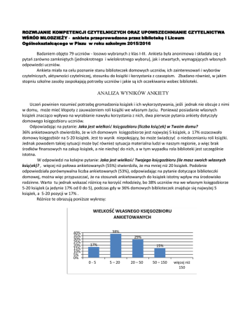 ROZWIJANIE KOMPETENCJI CZYTELNICZYCH ORAZ UPOWSZECHNIANIE CZYTELNICTWA WŚRÓD MŁODZIEŻY ankieta przeprowadzona przez bibliotekę I Liceum Ogólnokształcącego w Piszu w roku szkolnym 2015/2016 Badaniem objęto 79 uczniów ‐ losowo wybranych z klas I‐III. Ankieta była anonimowa i składała się z pytań zarówno zamkniętych ( jednokrotnego i wielokrotnego wyboru), jak i otwartych, wymagających własnych odpowiedzi uczniów. Ankieta miała na celu poznanie stanu biblioteczek domowych uczniów, ich zainteresowań i wyborów czytelniczych, aktywności czytelniczej, stosunku do książki i korzystania z czasopism. Zbadano również, w jakim stopniu szkolne zasoby zaspokajają potrzeby uczniów i jakie są ich oczekiwania wobec biblioteki. ANALIZA WYNIKÓW ANKIETY Uczeń powinien rozumieć potrzebę gromadzenia książek i ich wykorzystywania, jeśli jednak nie obcuje z nimi w domu, może mieć kłopoty z zauważeniem roli książki we własnym życiu. P onieważ posiadanie własnych książek znacząco wpływa na wyrabianie nawyku korzystania z nich, dwa pierwsze pytania ankiety dotyczyły domowego księgozbioru uczniów. Odpowiadając na pytanie: J aka jest wielkość księgozbioru (liczba książek) w Twoim domu? 36% ankietowanych stwierdziło, że w ich domowym księgozbiorze jest najwyżej 5 książek, a 17% oszacowało domowy księgozbiór na 5‐20 książek. Jest to wynik niepokojący, bo może świadczyć o niedocenianiu roli książki. Jednak powodem takiej sytuacji może być również sytuacja materialna ludzi w naszym regionie, a więc brak środków finansowych na zakup książek, a nie niechęć do nich, a w tym wypadku rola biblioteki jest szczególnie istotna. W odpowiedzi na kolejne pytanie: J aka jest wielkość Twojego księgozbioru (ile masz swoich własnych książek)? , w ięcej niż połowa ankietowanych (55%) stwierdziła, że ma mniej niż 20 książek. Podobnie odpowiedziała porównywalna liczba ankietowanych (53%), odpowiadając na pytanie dotyczące biblioteczki domowej, można więc przypuszczać, że na stosunek ankietowanych do książek istotny wpływ ma środowisko rodzinne. Warto tu jednak wskazać różnicę na korzyść młodzieży, bo 38% uczniów ma we własnym księgozbiorze 5‐20 książek (a jedynie 17% od 0 do 5), podczas gdy w 36% domowych biblioteczek znajduje się najwyżej 5 książek, a 5‐20 pozycji w 17% . Różnice te obrazują poniższe wykresy: Ankietowani byli także pytani o sposób spędzania wolnego czasu ( codziennie lub prawie codziennie, co najmniej raz w tygodniu, co najmniej raz w miesiącu, kilka razy w roku, rzadziej niż raz w roku lub nigdy ) . Mogli tu zaznaczyć więcej niż jedną odpowiedź. Pytanie to ujawniło smutną prawdę: generalnie nasi uczniowie czytają niewiele. Książka przegrywa, niestety, z łatwiejszymi i dostępniejszymi sposobami spędzania wolnego czasu. Codziennie lub prawie codziennie 44% ankietowanych ogląda telewizję, 43% słucha muzyki, 43% korzysta z komputera, Internetu, 25% uprawia 1 sport, 24% gra w gry komputerowe , a jedynie 21% sięga po książkę . Przyczyn tego stanu rzeczy należy szukać zapewne w rozmaitości oferty programów telewizyjnych oraz w łatwości korzystania z komputera i internetu. Fakt, że czytanie nie jest ulubioną formą spędzania wolnego czasu przez młodzież, wiązać się może także z przyzwyczajeniami wyniesionymi z domu, ponieważ tam w dużym stopniu kształtują się zainteresowania i osobowość młodego człowieka. Sposób spędzania wolnego czasu przez młodzież ilustrują poniższe wykresy: 1 Uwagę zwraca brak zainteresowania działaniem w organizacjach ( np. Z HP, stowarzyszeniu, wolontariacie, zespole muzycznym czy tanecznym) – taką aktywność deklaruje jedynie 8% pytanych. Aktywność czytelnicza młodzieży nie jest zbyt wysoka ‐ jedynie 21% uczniów czyta książki codziennie lub prawie codziennie, a 30% uczniów sięga po książkę przynajmniej raz w tygodniu. Niepokój budzi to, że bardzo rzadki kontakt z książką (kilka razy w roku, rzadziej niż raz w roku lub nigdy) ma, niestety, aż 26% uczniów. 27% badanych w odpowiedzi na pytanie: J ak często czytasz książkę w czasie wolnym? stwierdziło, że w wolnym czasie codziennie czyta książki, jednak i tu, podobnie jak w poprzednim pytaniu, 23% ankietowanych stwierdziło, że ma sporadyczny kontakt z książką. Odpowiadając na pytanie: I le książek przeczytałeś w zeszłym roku?, 3 0% ankietowanych przyznało, że przeczytało w ciągu roku najwyżej 3 książki (w tym 16% góra jedną), jednak 32% badanych zadeklarowało przeczytanie od 4 do 9 książek, a 38% powyżej 10, co nastraja optymistycznie. By zbadać problem, po jakie książki najchętniej sięgają młodzi ludzie, postawiono ankietowanym pytanie: Jakie książki czytasz w czasie wolnym? Największą poczytnością (31% ankietowanych) cieszą się powieści kryminalne, sensacyjne, mniejszą (17% ankietowanych) lektury szkolne. Na trzecim miejscu (9% badanych) znalazły się fantastyka, literatura obyczajowa oraz encyklopedie, słowniki i atlasy. 7% ankietowanych czyta książki hobbistyczne i poradniki. Młodzież niezbyt chętnie sięga po książki przygodowe (5%), popularnonaukowe czy literaturę faktu (4%). Najmniejsze zainteresowanie budzą komiksy (3%) i literatura religijna (2%). Na wybory czytelnicze młodych ludzi wpływa głównie grupa rówieśnicza. To najczęściej koleżanki i koledzy podpowiadają, czy dana pozycja jest interesująca, czy warto ją przeczytać. Nie dziwi więc, że na pytanie: Z kim rozmawiasz o książkach czytanych w wolnym czasie? 5 2% ankietowanych o dpowiedziało: z kolegami, rówieśnikami . To, że młodzi ludzie najchętniej i najczęściej na temat książek rozmawiają z koleżankami, kolegami i rodziną ( z rodzeństwem i kuzynami 11%, z rodzicami 11%, z dziadkami i innymi członkami rodziny 11%) wiąże się z pewnością ze swobodą w kontaktach z tymi oso