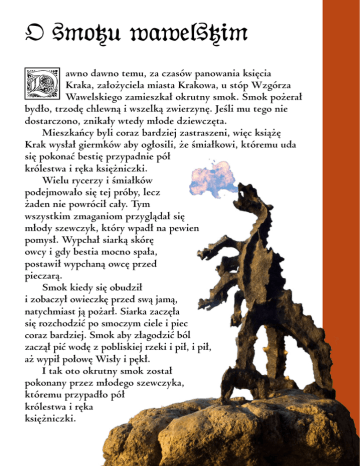O smoku wawelskim awno dawno temu, za czasów panowania księcia Kraka, założyciela miasta Krakowa, u stóp Wzgórza Wawelskiego zamieszkał okrutny smok. Smok pożerał bydło, trzodę chlewną i wszelką zwierzynę. Jeśli mu tego nie dostarczono, znikały wtedy młode dziewczęta. Mieszkańcy byli coraz bardziej zastraszeni, więc książę Krak wysłał giermków aby ogłosili, że śmiałkowi, któremu uda się pokonać bestię przypadnie pół królestwa i ręka księżniczki. Wielu rycerzy i śmiałków podejmowało się tej próby, lecz żaden nie powrócił cały. Tym wszystkim zmaganiom przyglądał się młody szewczyk, który wpadł na pewien pomysł. Wypchał siarką skórę owcy i gdy bestia mocno spała, postawił wypchaną owcę przed pieczarą. Smok kiedy się obudził i zobaczył owieczkę przed swą jamą, natychmiast ją pożarł. Siarka zaczęła się rozchodzić po smoczym ciele i piec coraz bardziej. Smok aby złagodzić ból zaczął pić wodę z pobliskiej rzeki i pił, i pił, aż wypił połowę Wisły i pękł. I tak oto okrutny smok został pokonany przez młodego szewczyka, któremu przypadło pół królestwa i ręka księżniczki. D O Wandzie, co nie chciała Niemca rzez wiele lat Krakowem rządził książę Krak. Był mądrym i sprawiedliwym władcą, dlatego po jego śmierci zapanowała wielka żałoba. Książę pozostawił po sobie tylko jedyną córkę – Wandę. Odziedziczyła ona po ojcu najlepsze cechy – była mądrą, sprawiedliwą i dobrą władczynią, a wieść o jej urodzie rozeszła się po świecie. Wieść ta dotarła też do Niemiec, gdzie władzę sprawował książę Rydygier. Postanowił on zdobyć jej rękę, wysłał więc do Krakowa swych posłów. – Pani, przybywamy w imieniu wielkiego księcia Rydygiera, który zakochał się w tobie słysząc o twej urodzie i mądrości – powiedział najstarszy z posłów. – Książę przysyła ci kosztowności i prosi o twoją rękę. Wanda spojrzała na dary, które przywieźli, a potem rzekła: – Podziękujcie swemu księciu i powiedzcie, że nie mogę przyjąć jego darów i zostać jego żoną. Moje miejsce jest tu, wśród mego ludu i na mojej ziemi. Nie opuszczę jej, aby żyć na obczyźnie. – Zuchwała jesteś, pani! – odpowiedział jeden z posłów. – Jeśli nie zgodzisz się po dobroci, krwią spłynie twa ziemia! Przerażeni widmem najazdu krakowscy wielmożowie próbowali namówić Wandę na małżeństwo. Księżniczka jednak w nocy, siedząc w swej komnacie, znalazła sposób na uratowanie swych poddanych od wojny. Otworzyła okno, wymknęła się z zamku i pobiegła nad Wisłę. Stanęła na stromym brzegu, zamknęła oczy i wskoczyła do ciemnej, wzburzonej wody. Rankiem rzeka wyrzuciła na brzeg ciało królewny. Poddani pogrążyli się w żałobie; niemieccy posłowie opuścili Kraków, a po powrocie do Niemiec opowiedzieli swemu księciu o czynie Wandy. Rydygier pożałował swej zawziętości i gróźb i zrozumiał, że miłości nie można ani kupić, ani zdobyć siłą. Poddani Wandy postanowili upamiętnić jej bohaterski czyn i usypali pod Krakowem kopiec, który nazwali jej imieniem. P O Piaście Kołodzieju ziało się to w czasach, gdy w Kruszwicy rządził okrutny Popiel. Niedaleko grodu żył z rodziną biedny kołodziej Piast. Codziennie składał drewniane koła do wozu, a w uprawie niewielkiego poletka pomagała mu żona, Rzepicha. Najstarszy syn Piasta kończył właśnie 7 lat. Zgodnie z prastarym zwyczajem miały się odbyć jego postrzyżyny. Na uroczystość kołodziej zaprosił wielu sąsiadów. Gdy już wszyscy usiedli do jedzenia, w drzwiach zjawiło się dwóch podróżnych. Mimo biedy Piast zaprosił ich do biesiadowania, na co wędrowcy chętnie przystali. W momencie samych postrzyżyn jeden z nieznajomych podszedł do chłopca i go ochrzcił, nadając mu imię Ziemowit. Potem obaj ruszyli w dalszą drogę. Następnego dnia po Kruszwicy rozeszła się wieść, że mieszkańcy chcą sobie wybrać nowego władcę. Wszyscy szli w kierunku grodu, a po drodze wstępowali do Piasta. Ten ich częstował, ale zaniepokoił się, że skończą się mu zapasy. Kiedy jednak Rzepicha poszła do spiżarni, zobaczyła, że nic z niej nie ubyło. Goście nadal byli częstowani, a wielu chwaliło Piasta za gospodarność. Kołodziej skromnie tłumaczył, że to nie jego zasługa, tylko tajemniczych gości, dzięki którym Bóg mu teraz błogosławi. Usłyszawszy to, najstarszy z mieszkańców powiedział, że nie muszą wcale szukać nowego księcia, bo Piast, skoro tak mu niebiosa sprzyjają, będzie rządzić mądrze i sprawiedliwie. I w ten sposób ubogi kołodziej został władcą Kruszwicy. D O Lechu, Czechu i Rusie rzed wiekami, gdy ziemie między dwiema pięknymi rzekami Wisłą i Odrą pokrywały nieprzebyte bory, w których łatwiej było spotkać tura czy niedźwiedzia niż myśliwego, w poszukiwaniu nowego miejsca osiedlenia przywędrowały tu plemiona słowiańskie. Na ich czele jechali trzej rodzeni bracia: pogodny, płowowłosy Lech, bystry i ruchliwy Czech, oraz milczący Rus. Po długiej wędrówce puszcza przerzedziła się i oczom wędrowców ukazała się piękna kraina poprzecinana pagórkami i jeziorami, w których odbijał się błękit nieba. Niezwykły widok zachwycił braci, szczególnie zaś ujął serce Lecha. Na jednym z pagórków bracia dostrzegli ogromny, rozłożysty dąb, a na nim swoje gniazdo zbudował biały orzeł. Ten piękny ptak, na widok zbliżających się ludzi, rozpostarł skrzydła i wzbił się w powietrze. Rus pochwycił za łuk, jednak Lech powstrzymał go, gdyż uznał to za znak, by tu osiąść na stałe i założyć swój gród. Biały orzeł, którego widział na tle zachodzącego purpurą słońca, obrał sobie Lech za godło państwa, zaś gród, który zbudował w tym miejscu, nazwał Gniezdnem. W tym grodzie gnieźnieńskim, jako w pierwszej stolicy Polski, zamieszkiwali nasi pierwsi książęt